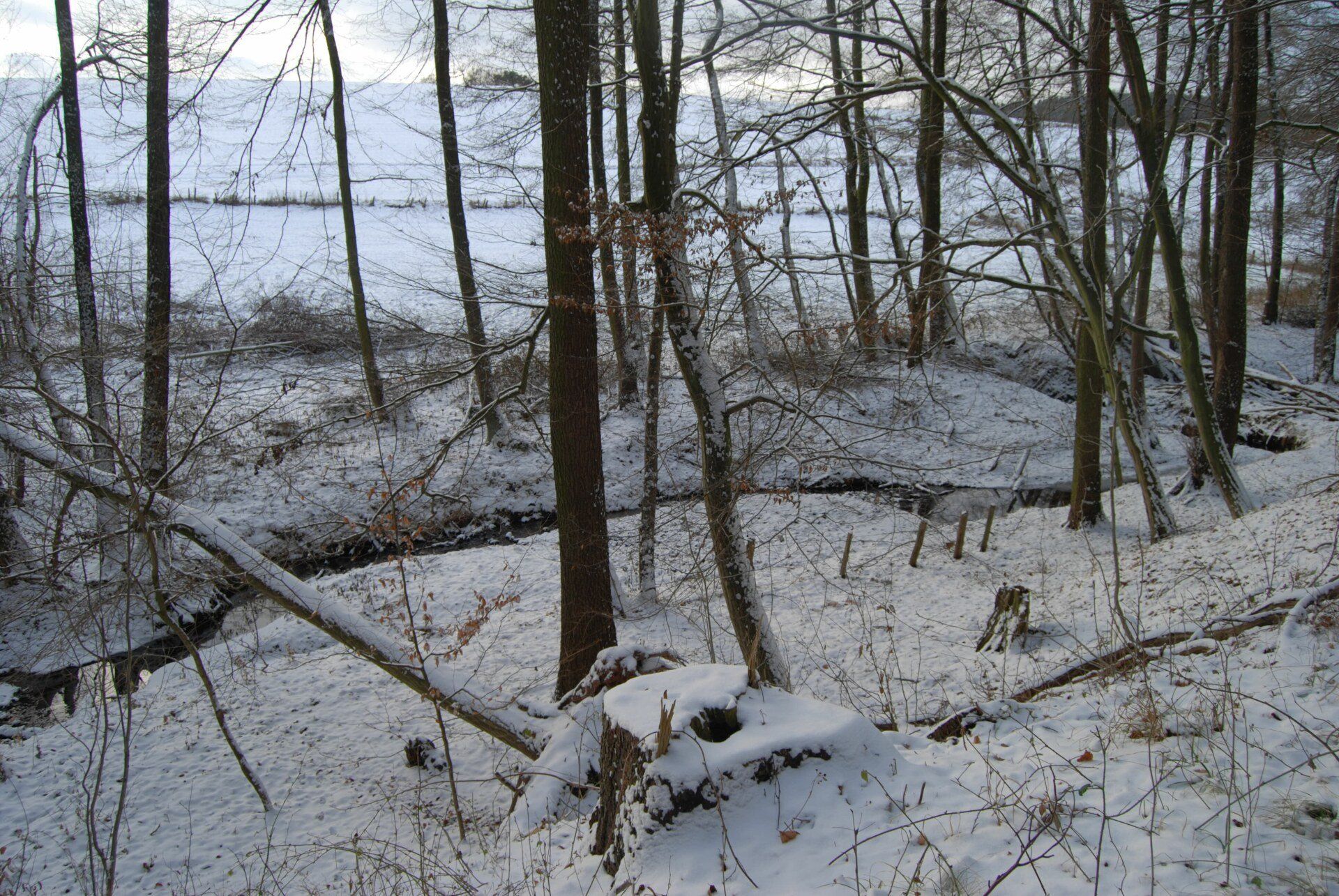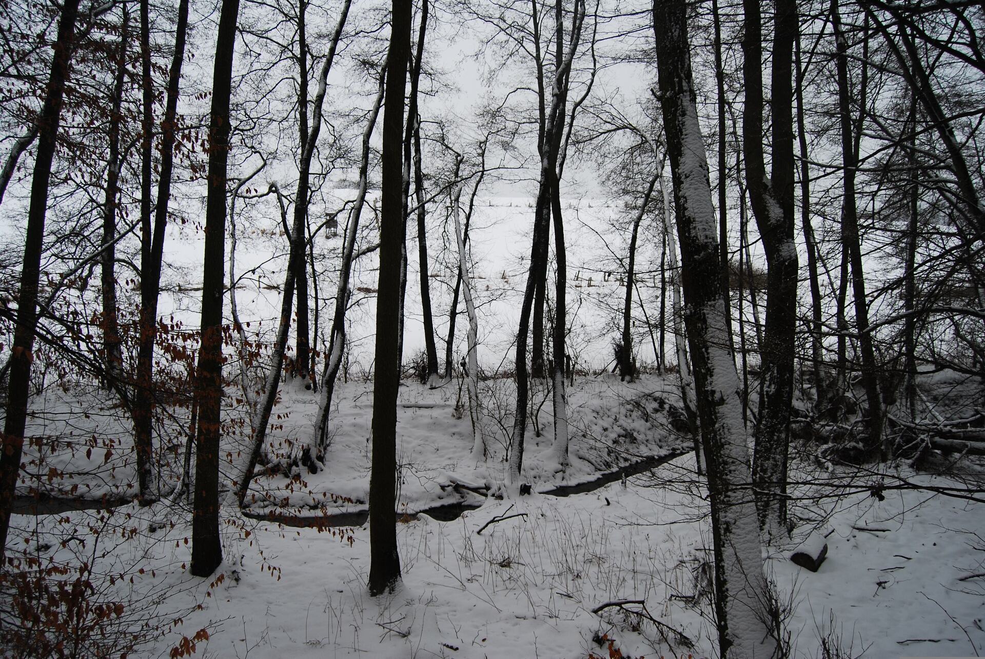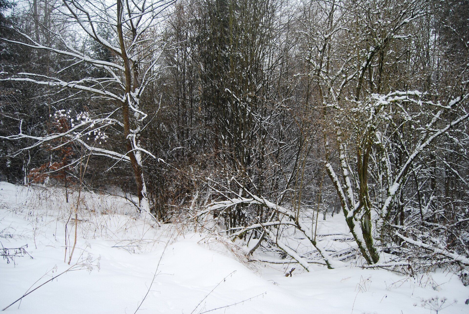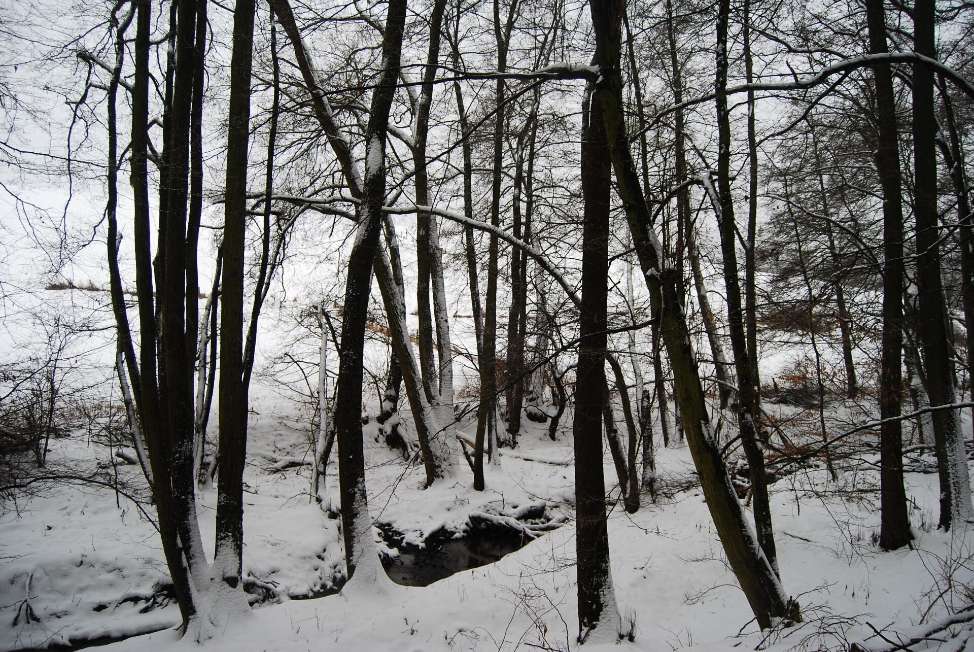 Blick in das winterliche Waldschnepfensumpfgebiet mit seinen vielen jungen schwarzen Erlen und im Sommer Feuersalamander und jodelnden Waldschnepfen.