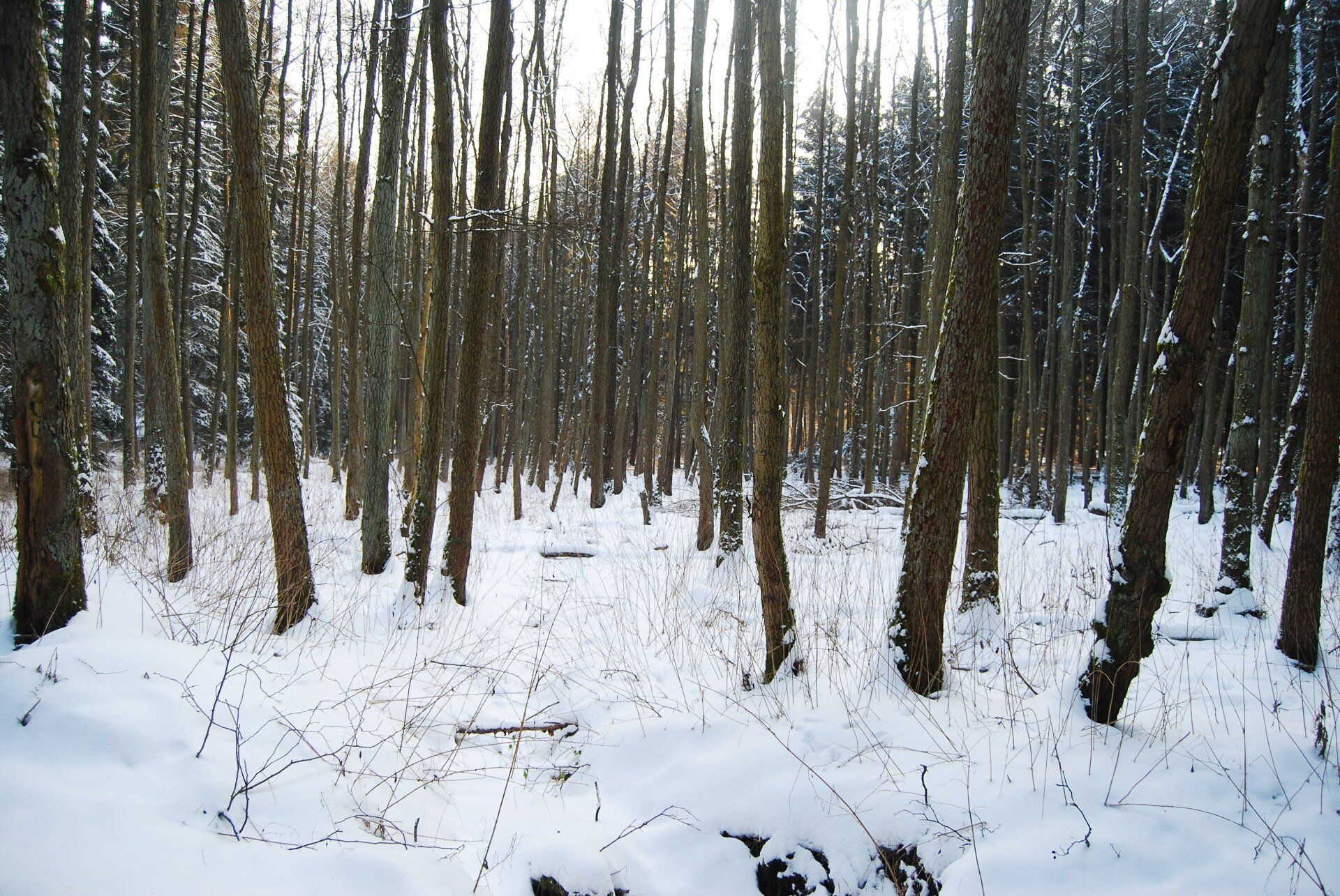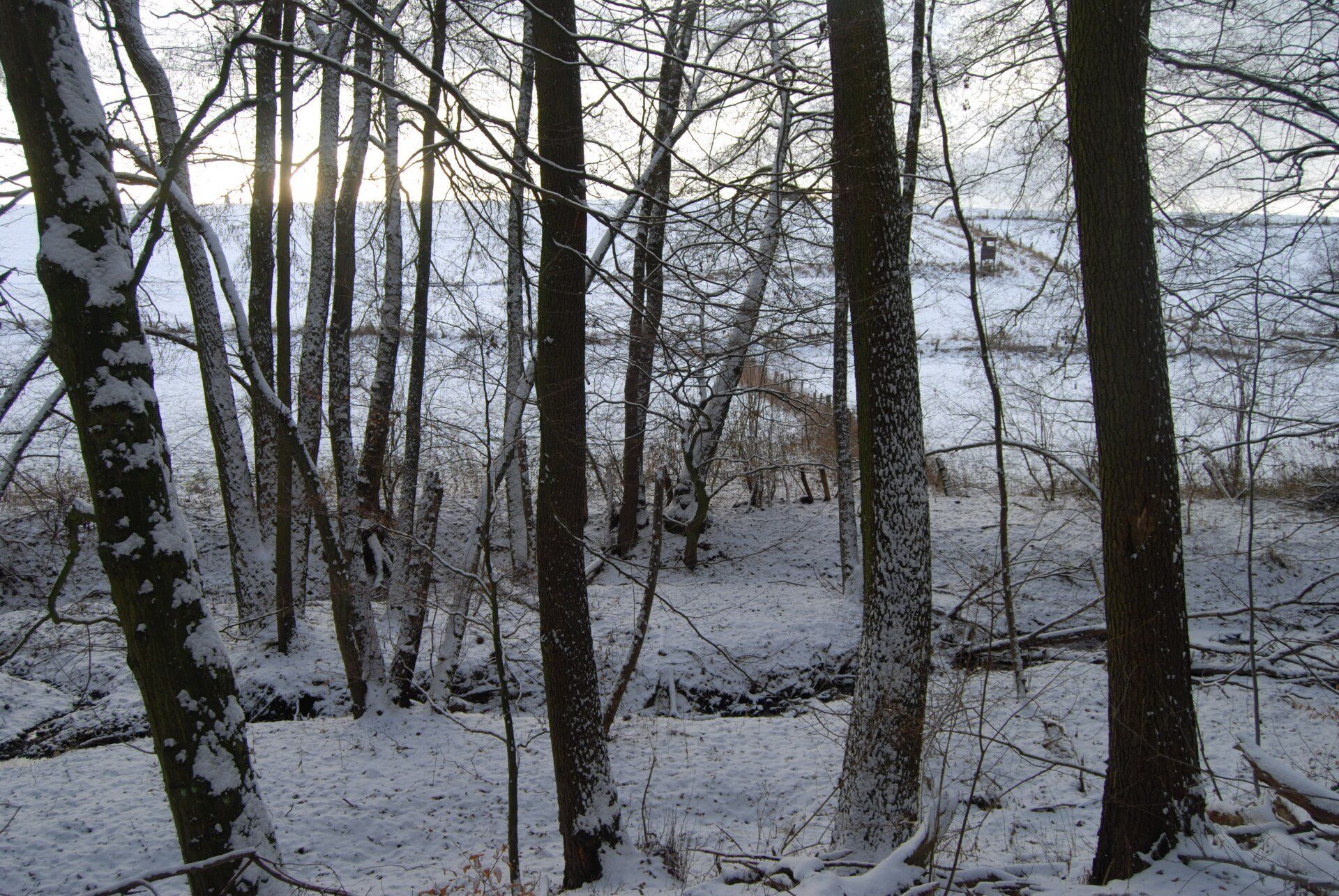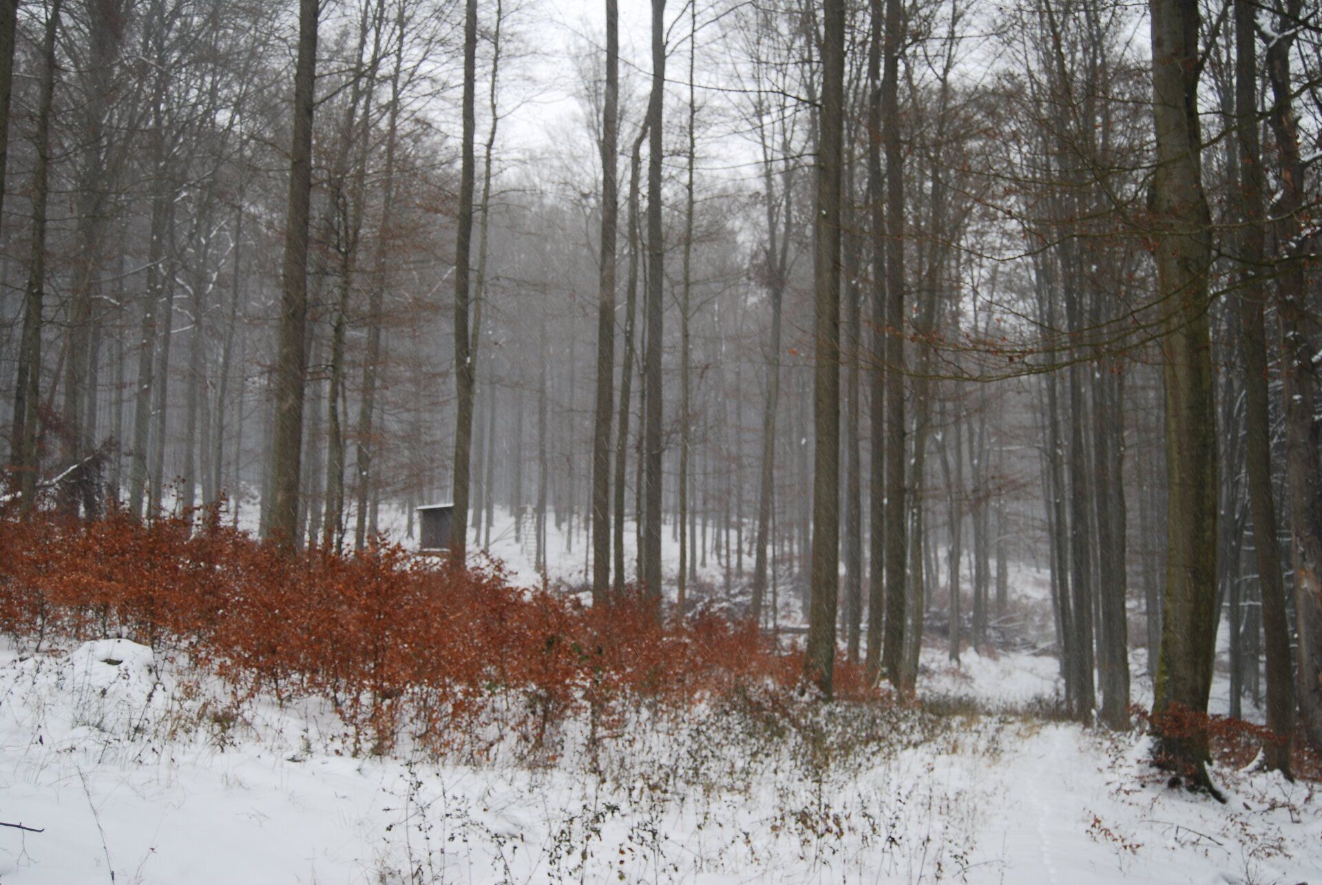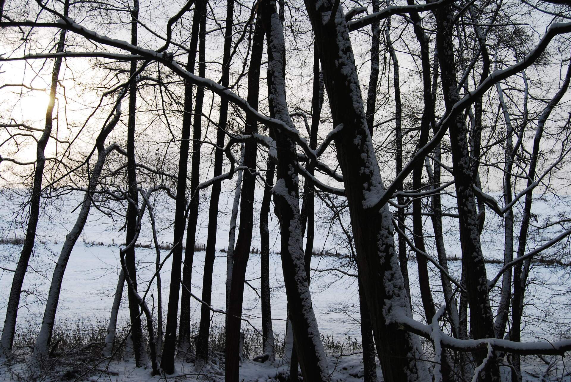 Blick in das winterliche Waldschnepfensumpfgebiet mit seinen vielen jungen schwarzen Erlen und im Sommer Feuersalamander und jodelnden Waldschnepfen.