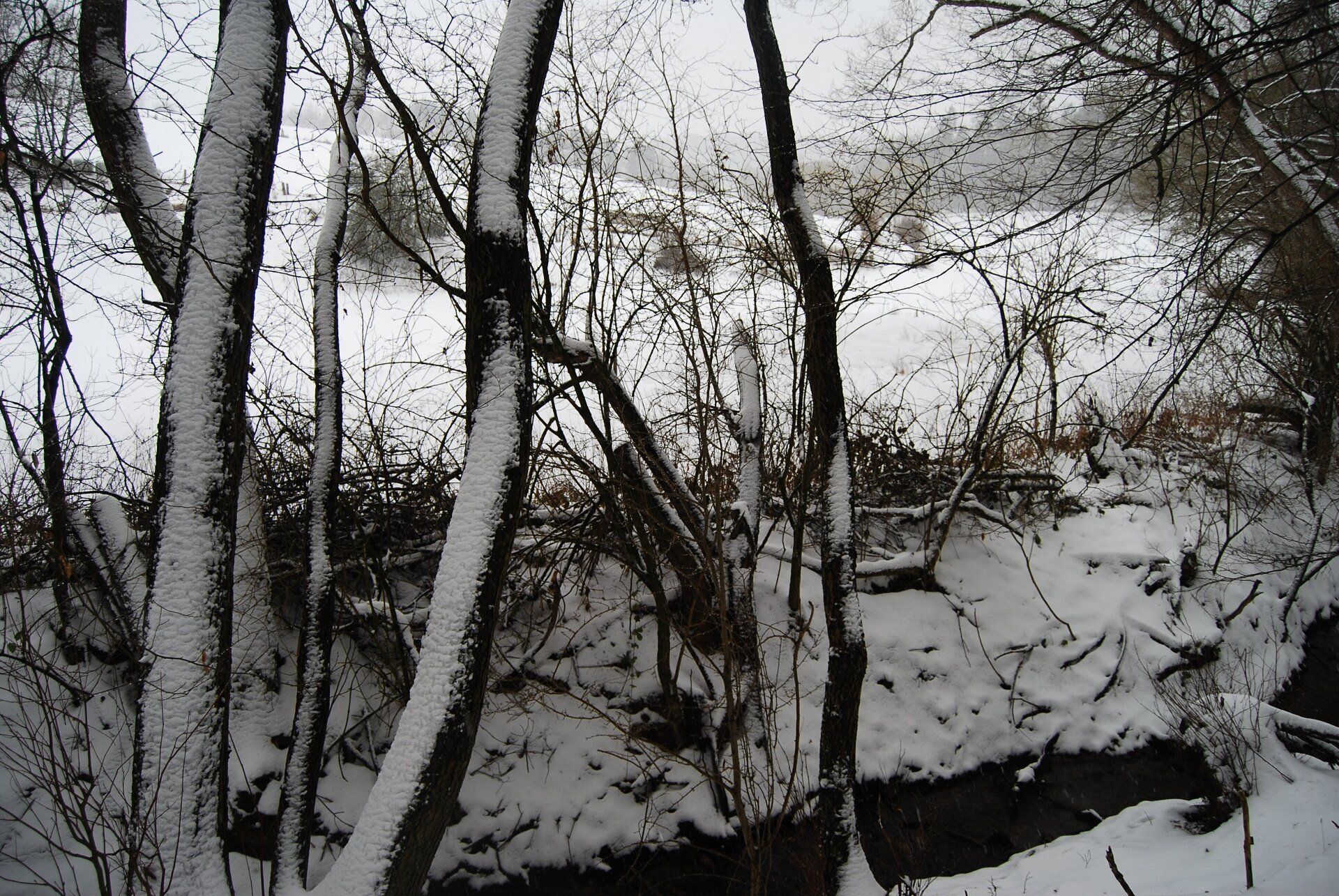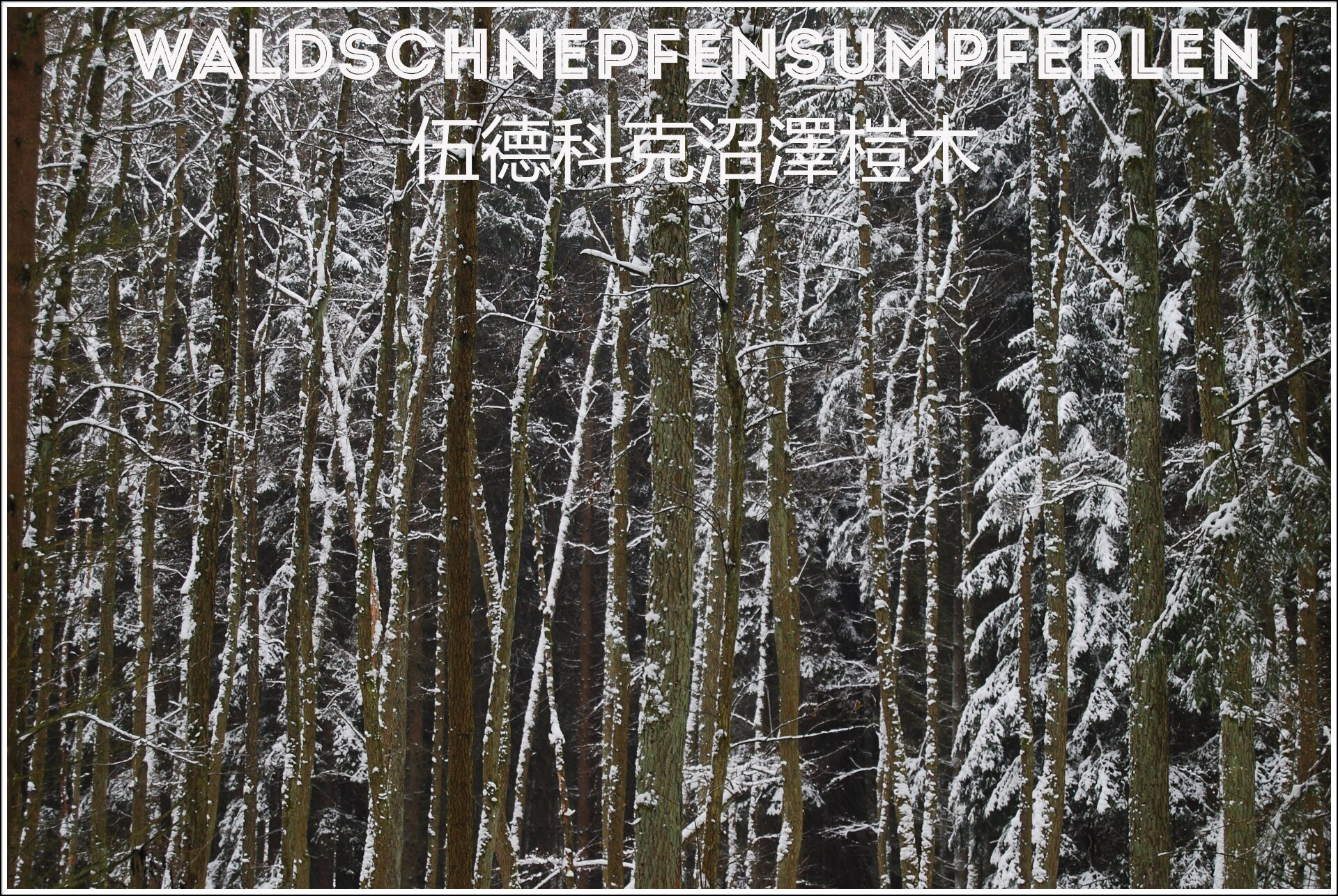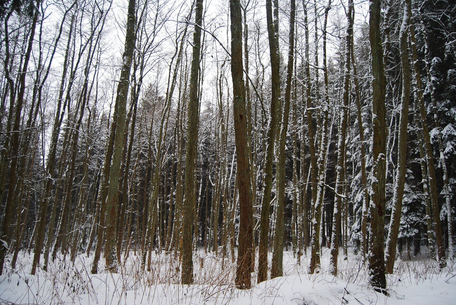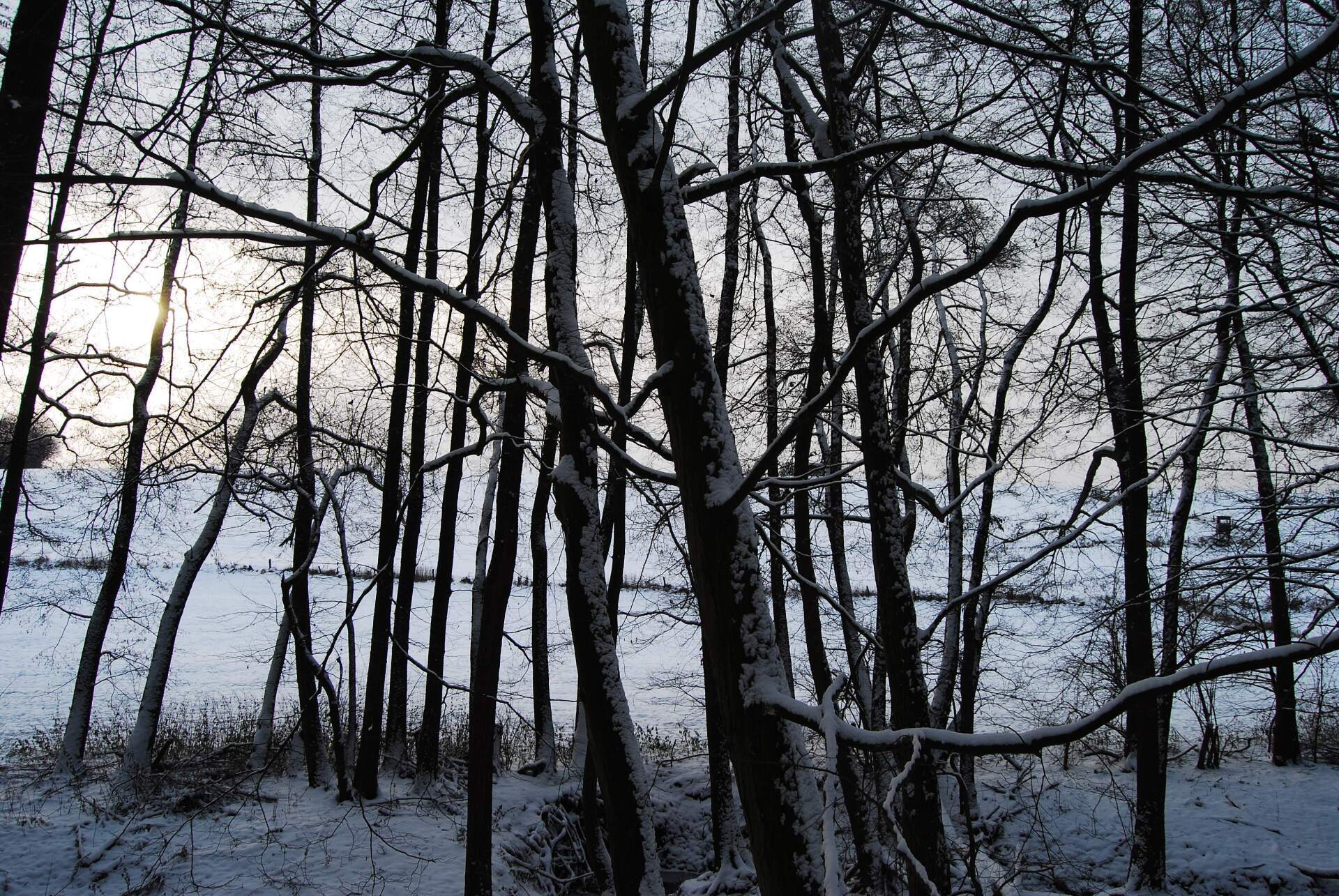 Blick in das winterliche Waldschnepfensumpfgebiet mit seinen vielen jungen schwarzen Erlen und im Sommer Feuersalamander und jodelnden Waldschnepfen.