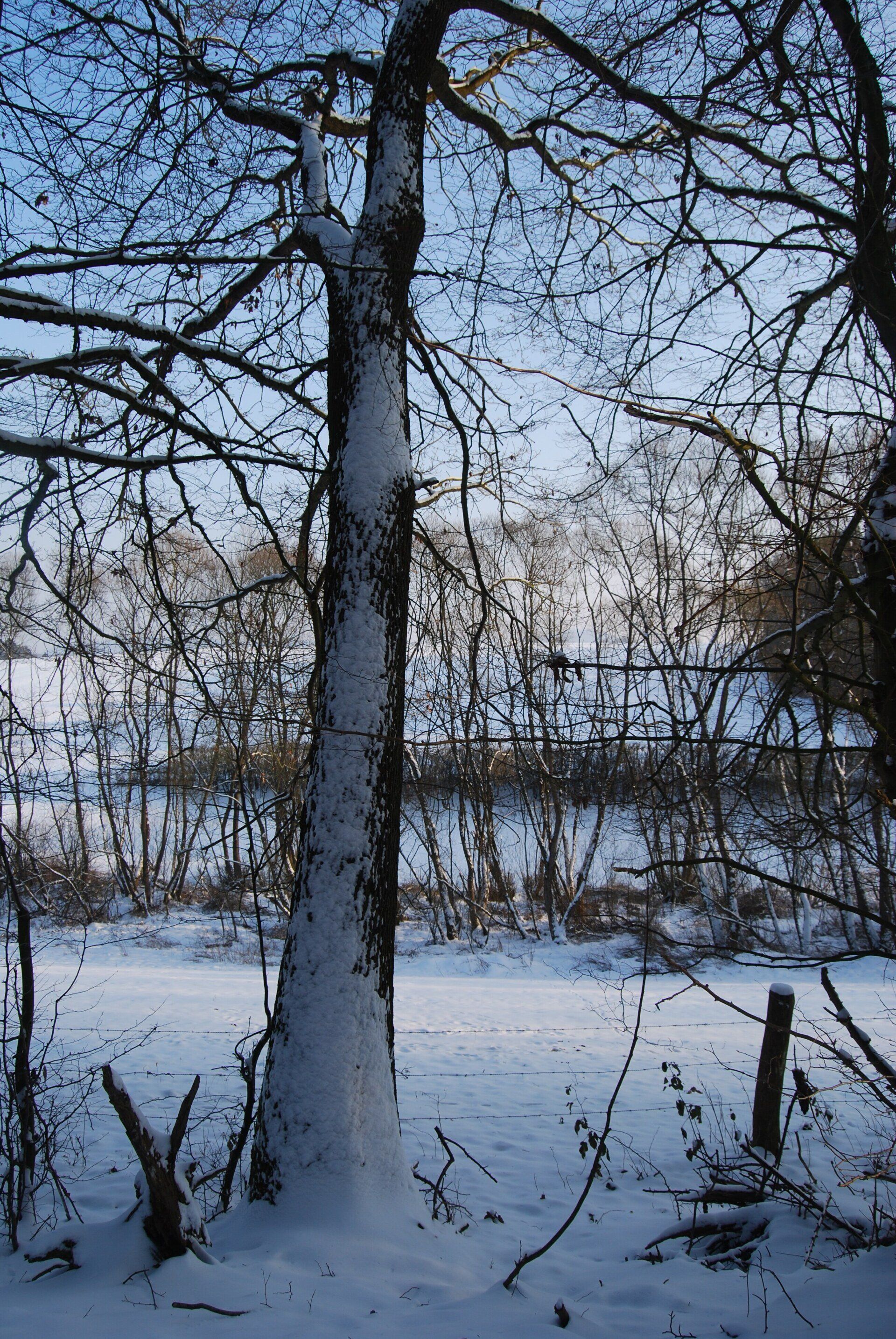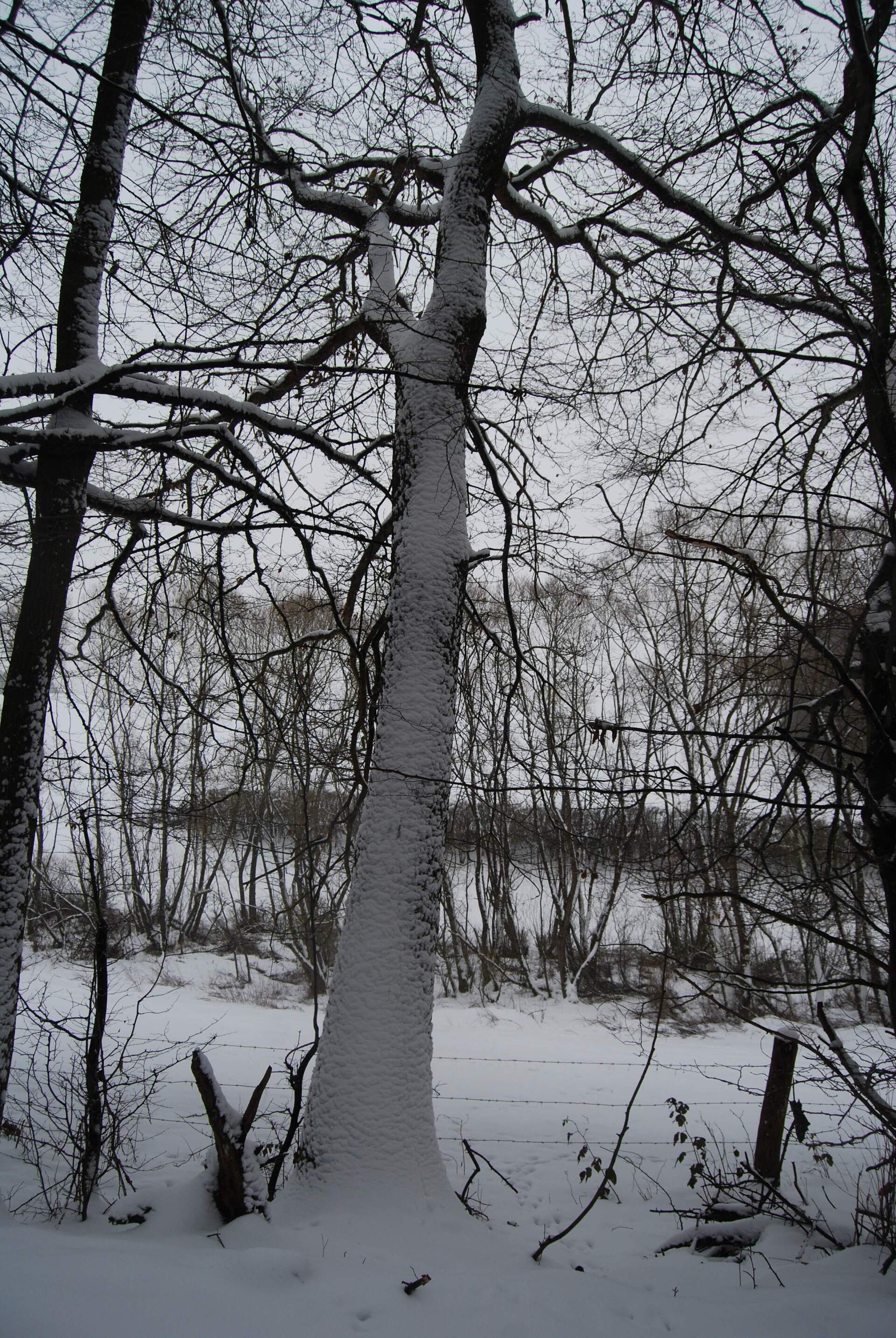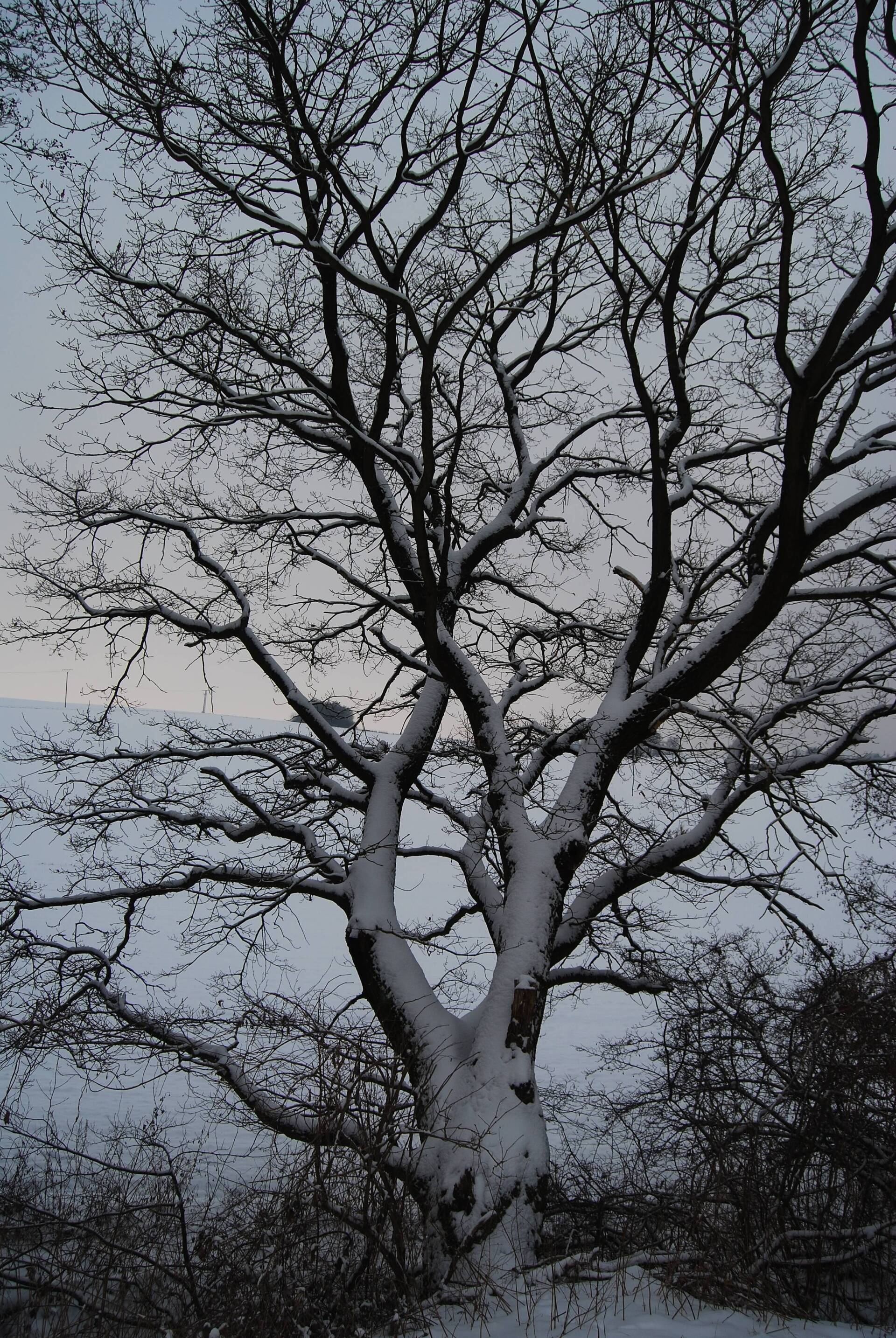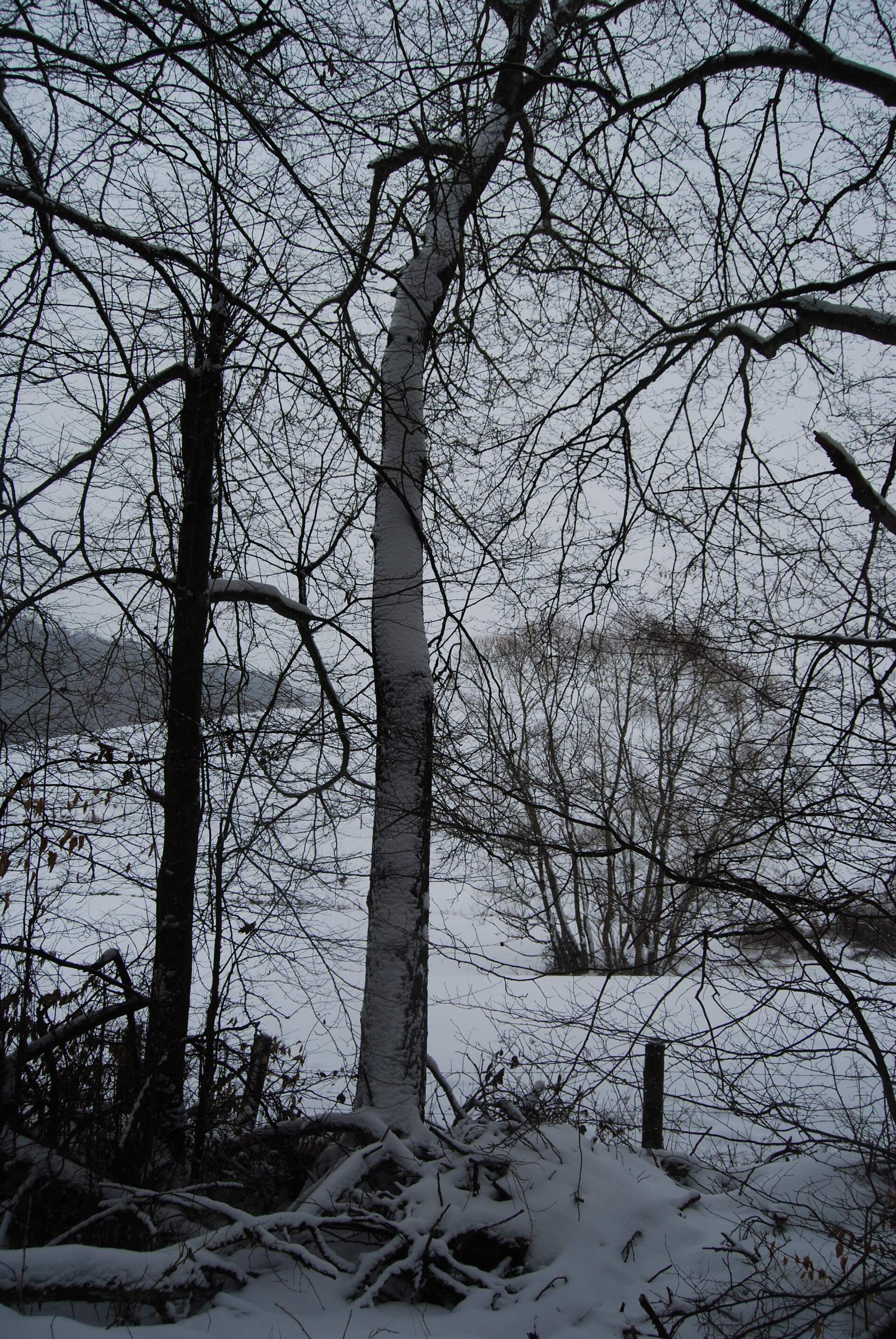 Der Kirschenbaum und seine tiefhängenden Äste mit Blick auf den Altenburg Berg im Winter.Damals hatte jemand noch das Nistkasten Bruthaus dort angenagelt.Aber erst 7 Jahre später waren Blaumeisen dort brütend.