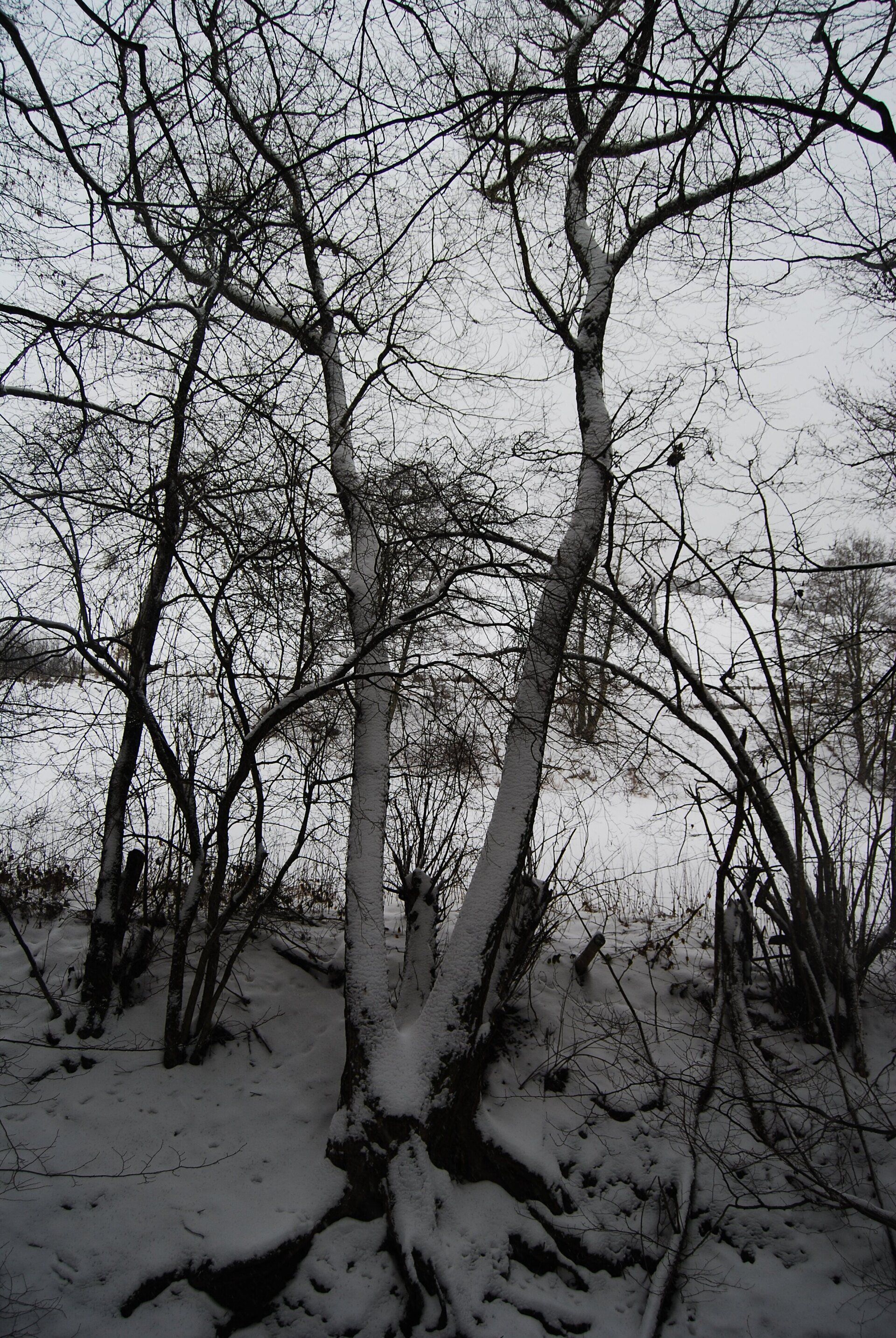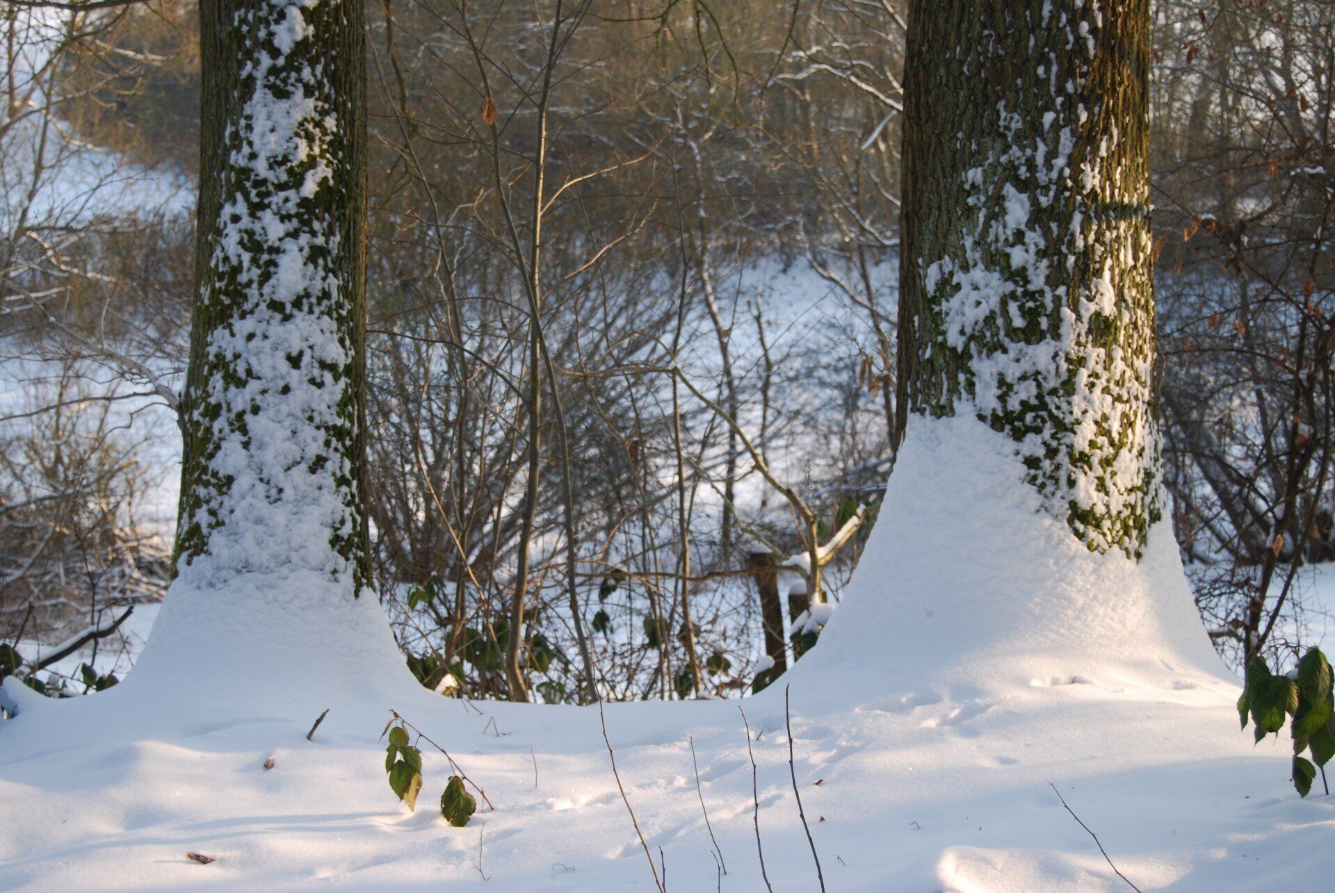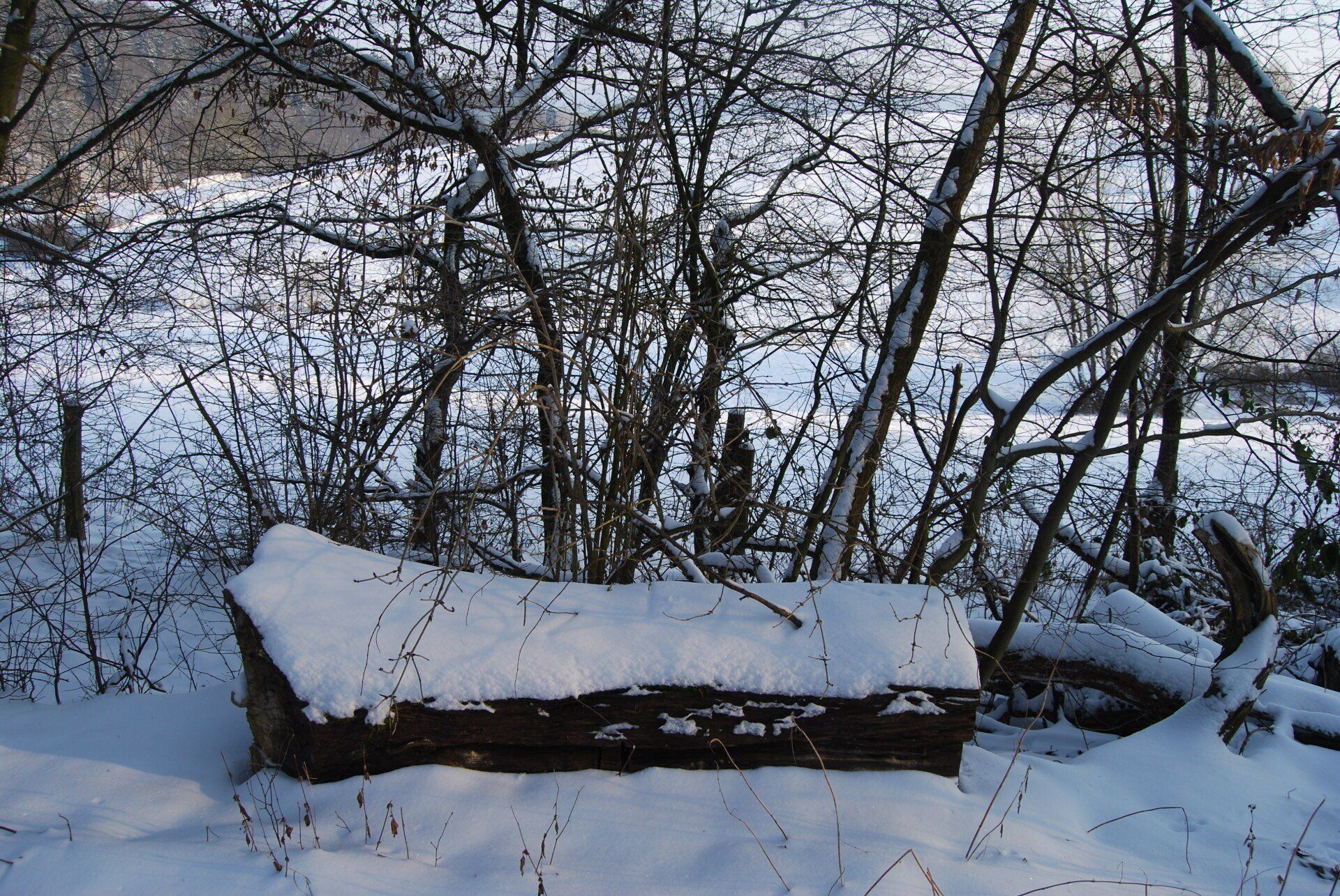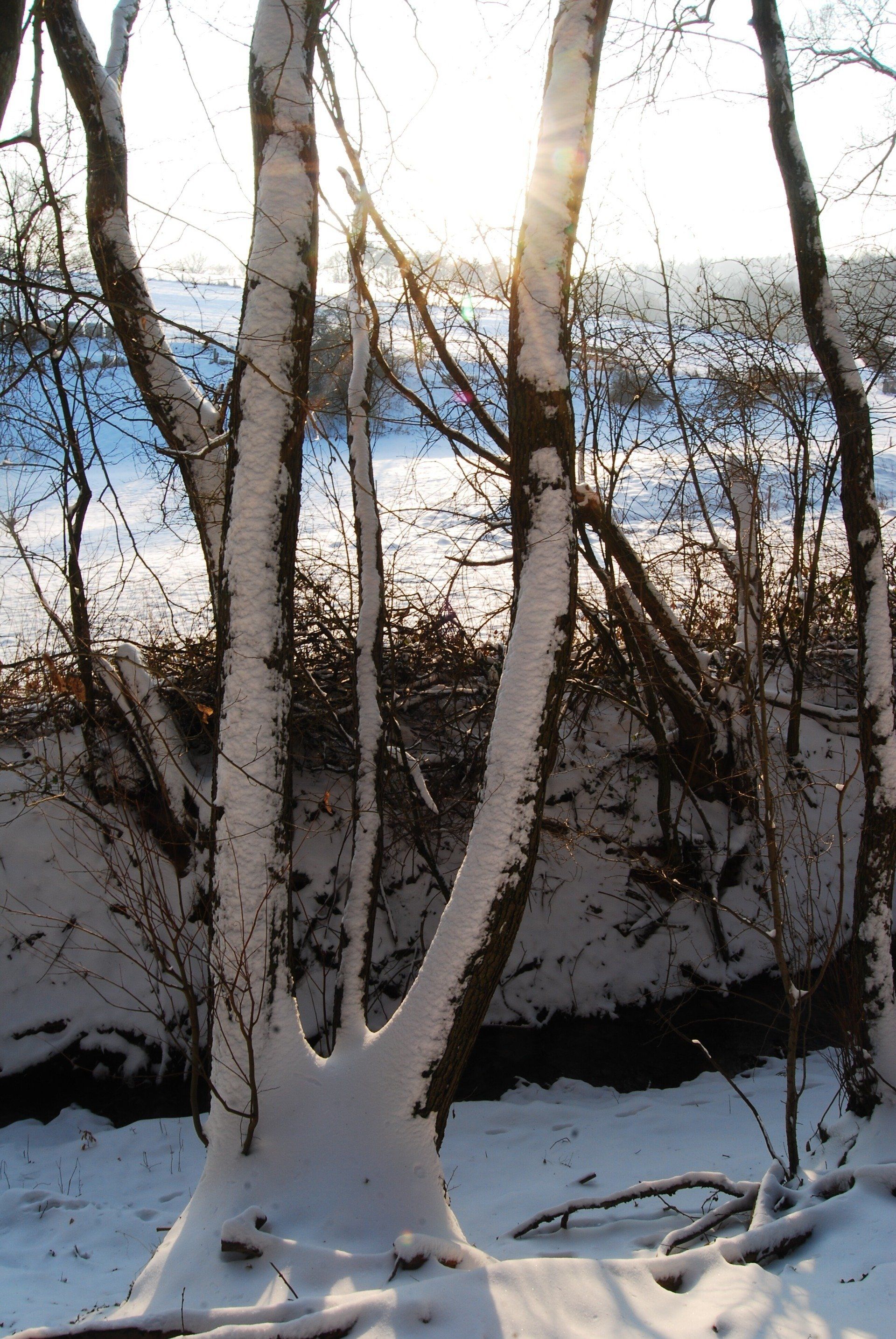 Der Kirschenbaum und seine tiefhängenden Äste mit Blick auf den Altenburg Berg im Winter.Damals hatte jemand noch das Nistkasten Bruthaus dort angenagelt.Aber erst 7 Jahre später waren Blaumeisen dort brütend.