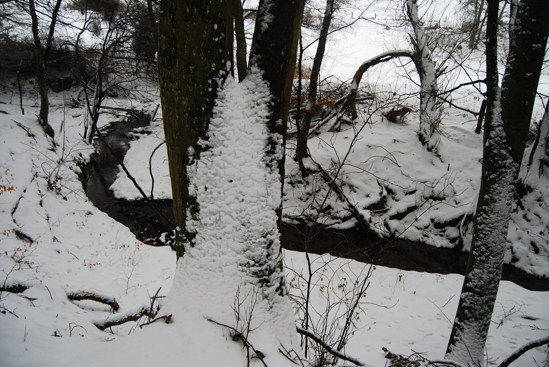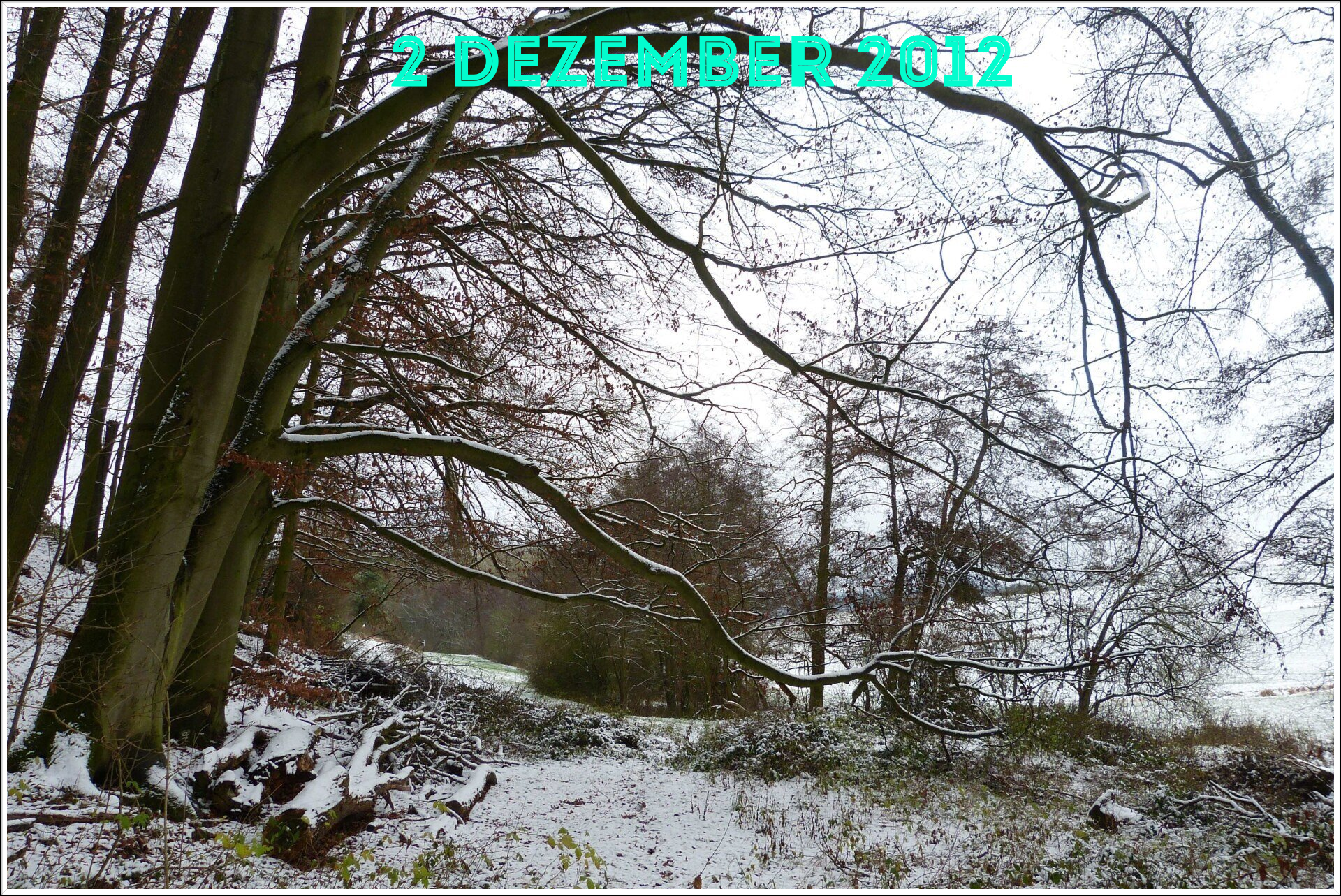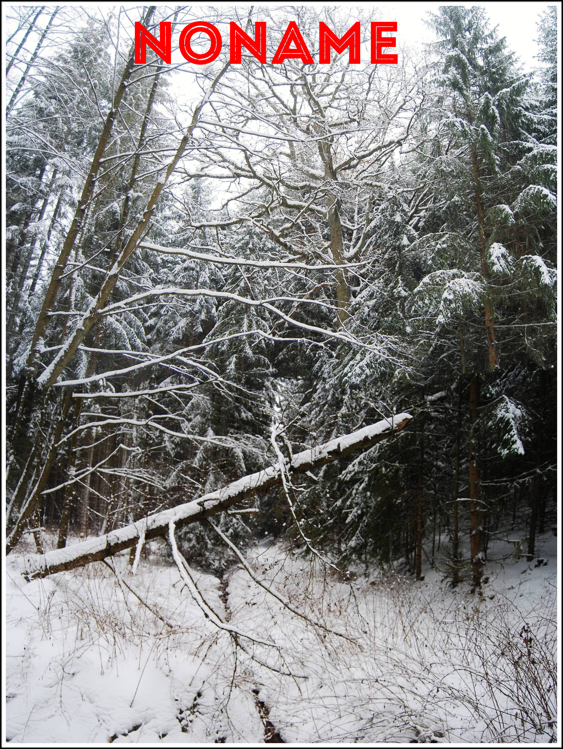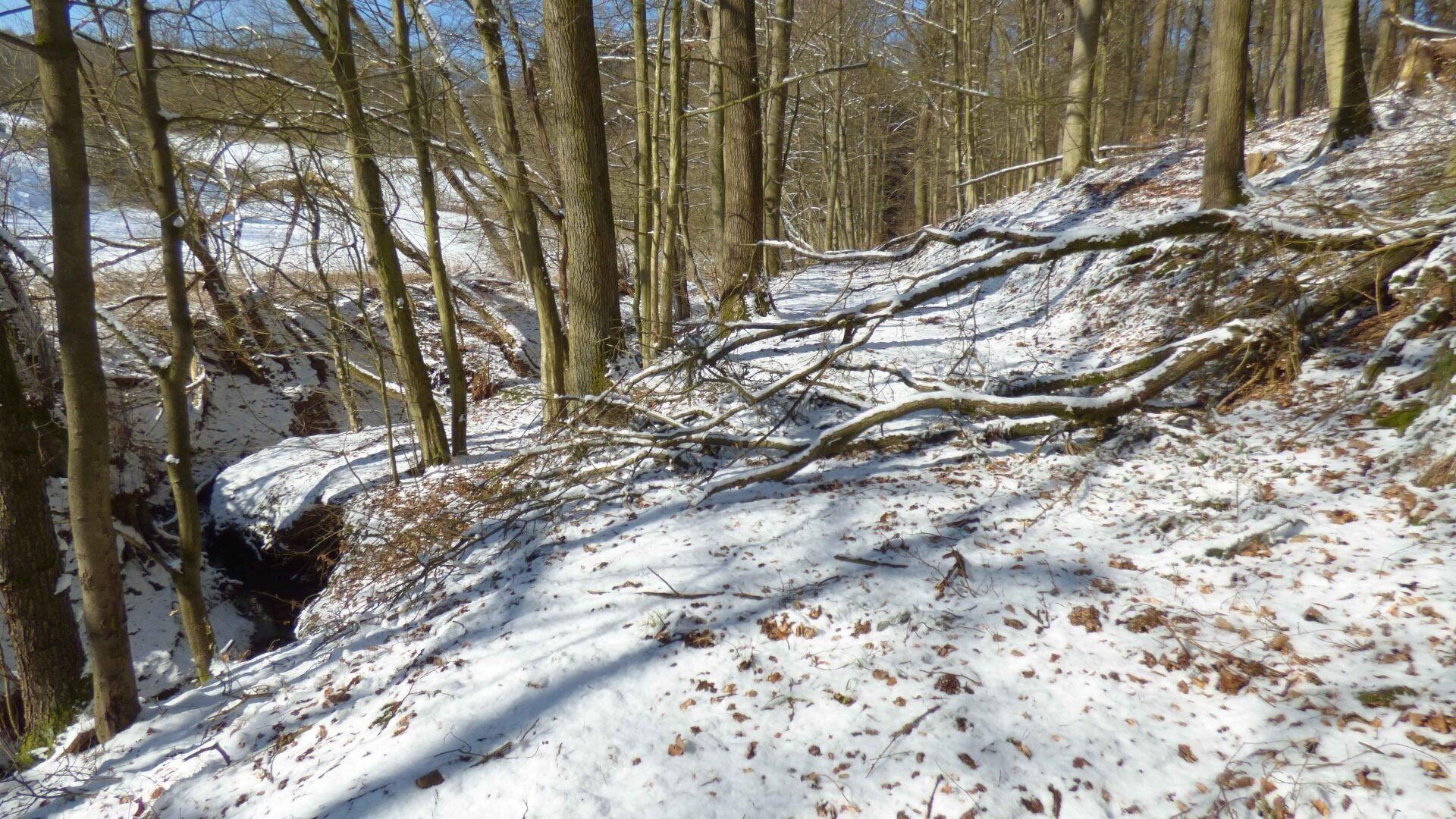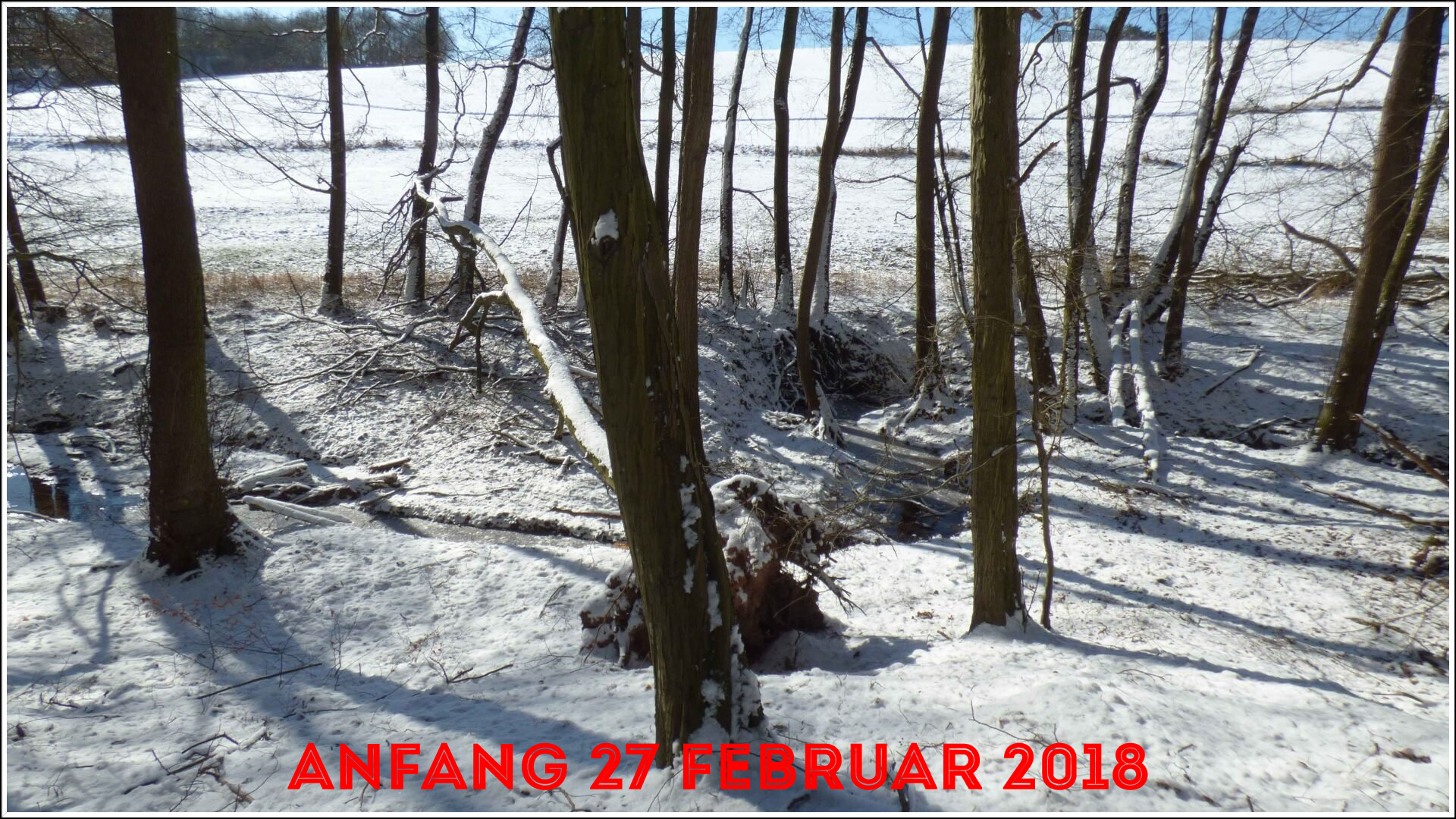 Weiter entlang des winterlichen Waldwegs bis zur Stelle wo der NoNameBach unter dem Waldweg fließt. Alles was da oben an Bäume gesehen werden kann ist heute vor einigen Tagen Kahlschlag Fantasien geworden. Da gibt es keinen Baum mehr. Bis auf einen oder anderthalb.