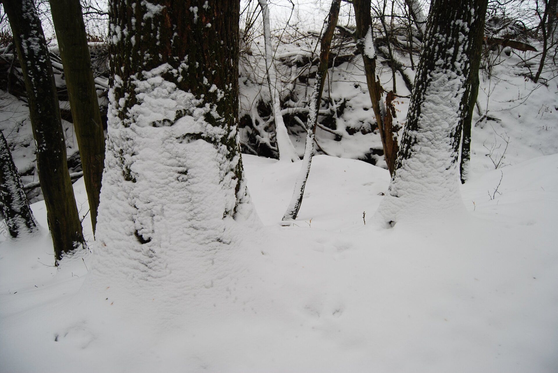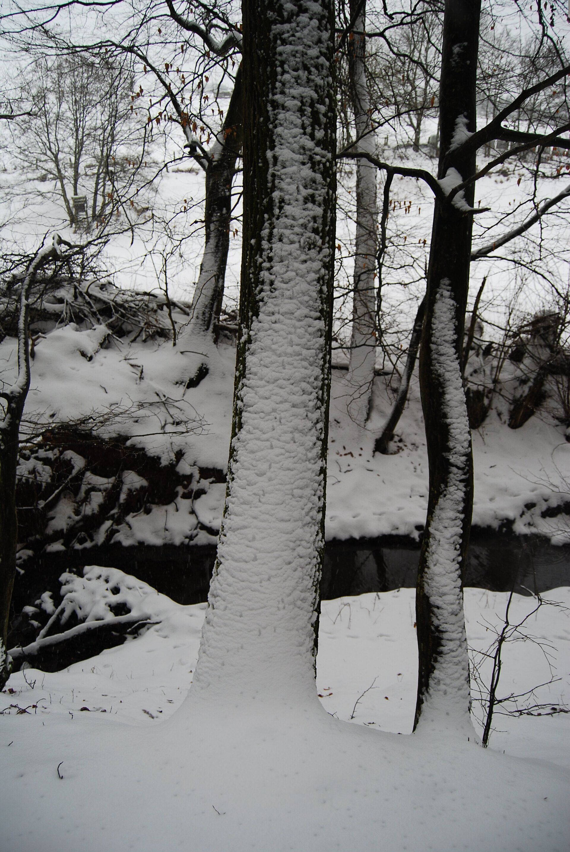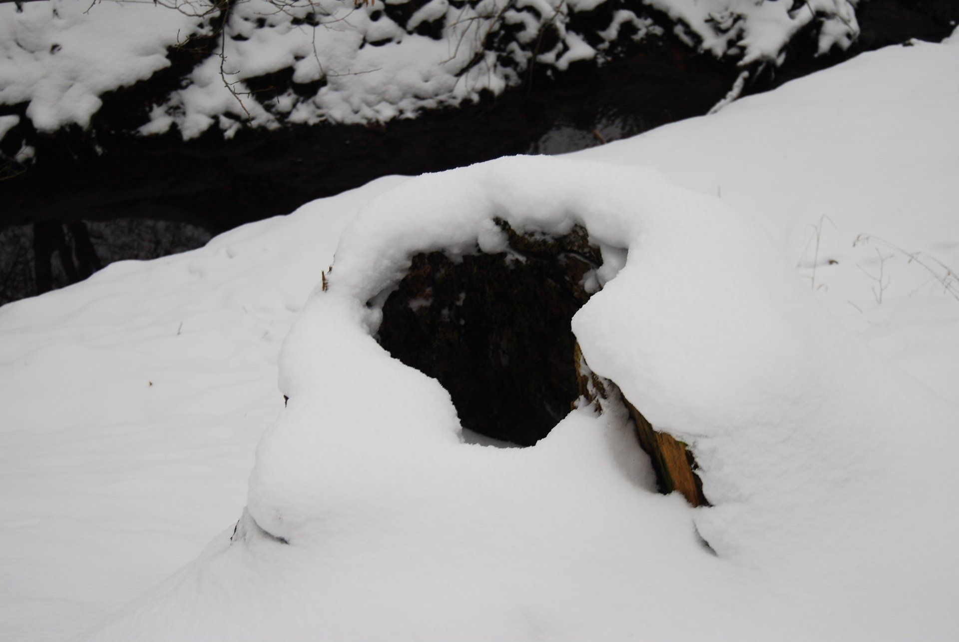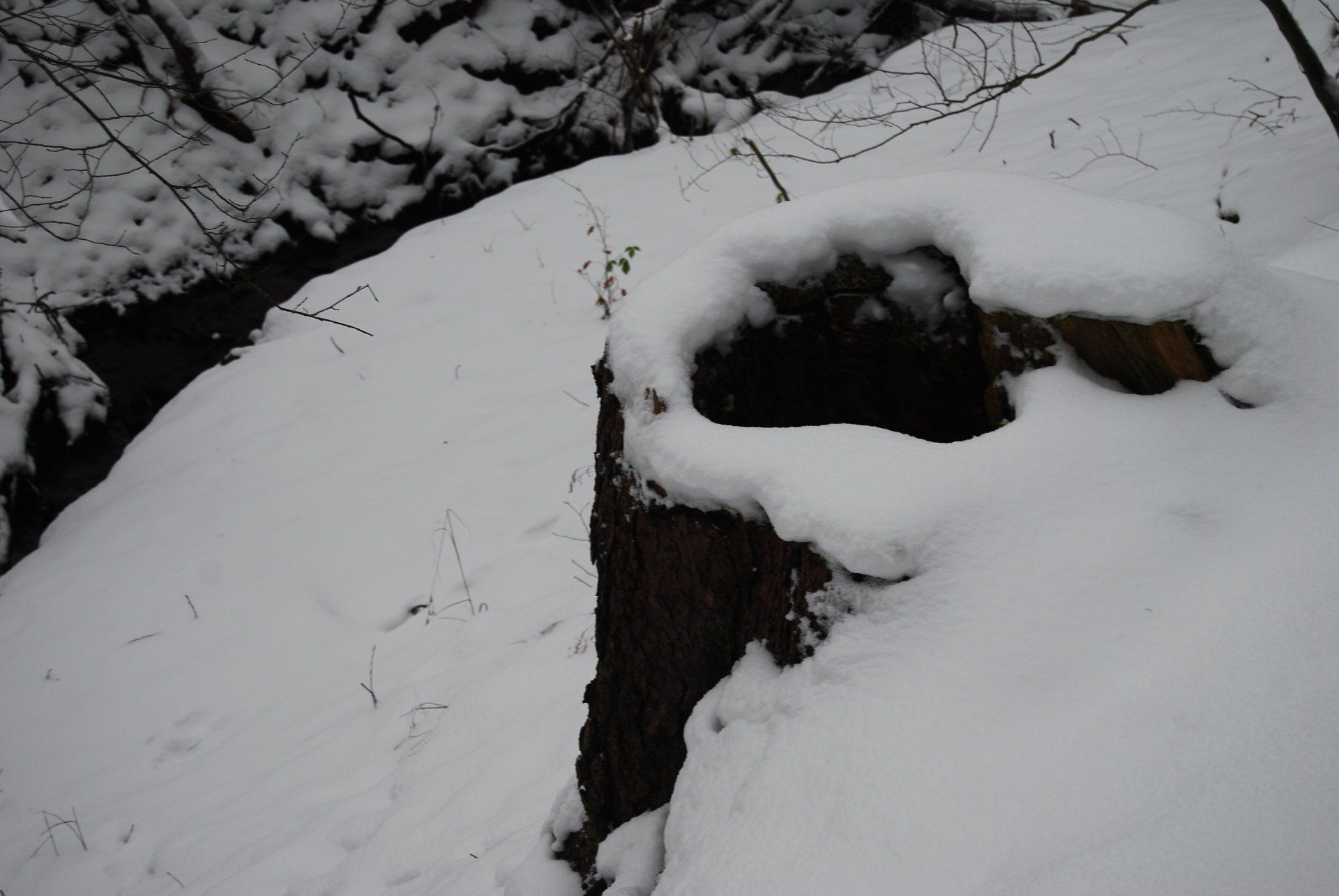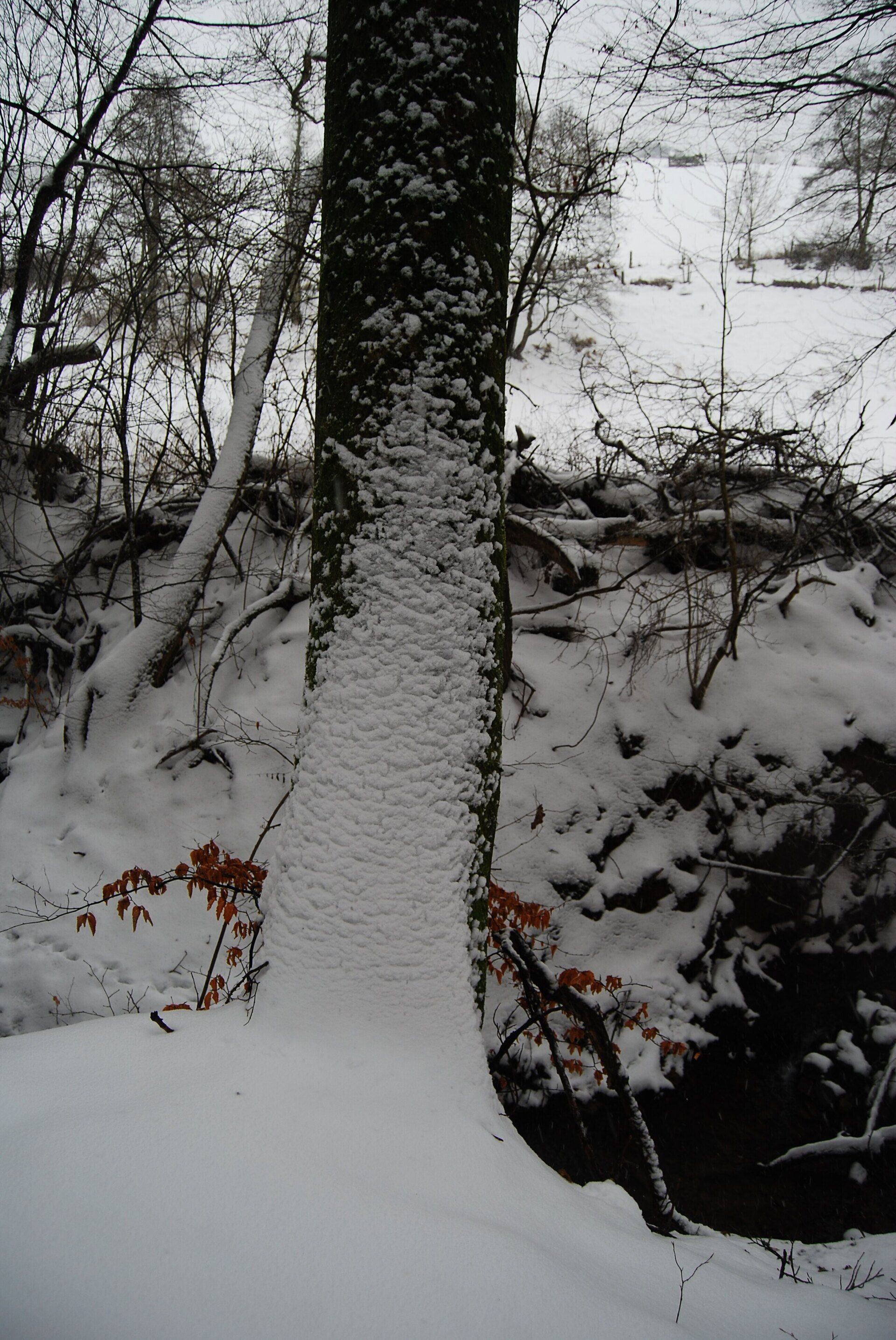 Weiter entlang des winterlichen Waldwegs bis zur Stelle wo der NoNameBach unter dem Waldweg fließt. Alles was da oben an Bäume gesehen werden kann ist heute vor einigen Tagen Kahlschlag Fantasien geworden. Da gibt es keinen Baum mehr. Bis auf einen oder anderthalb.