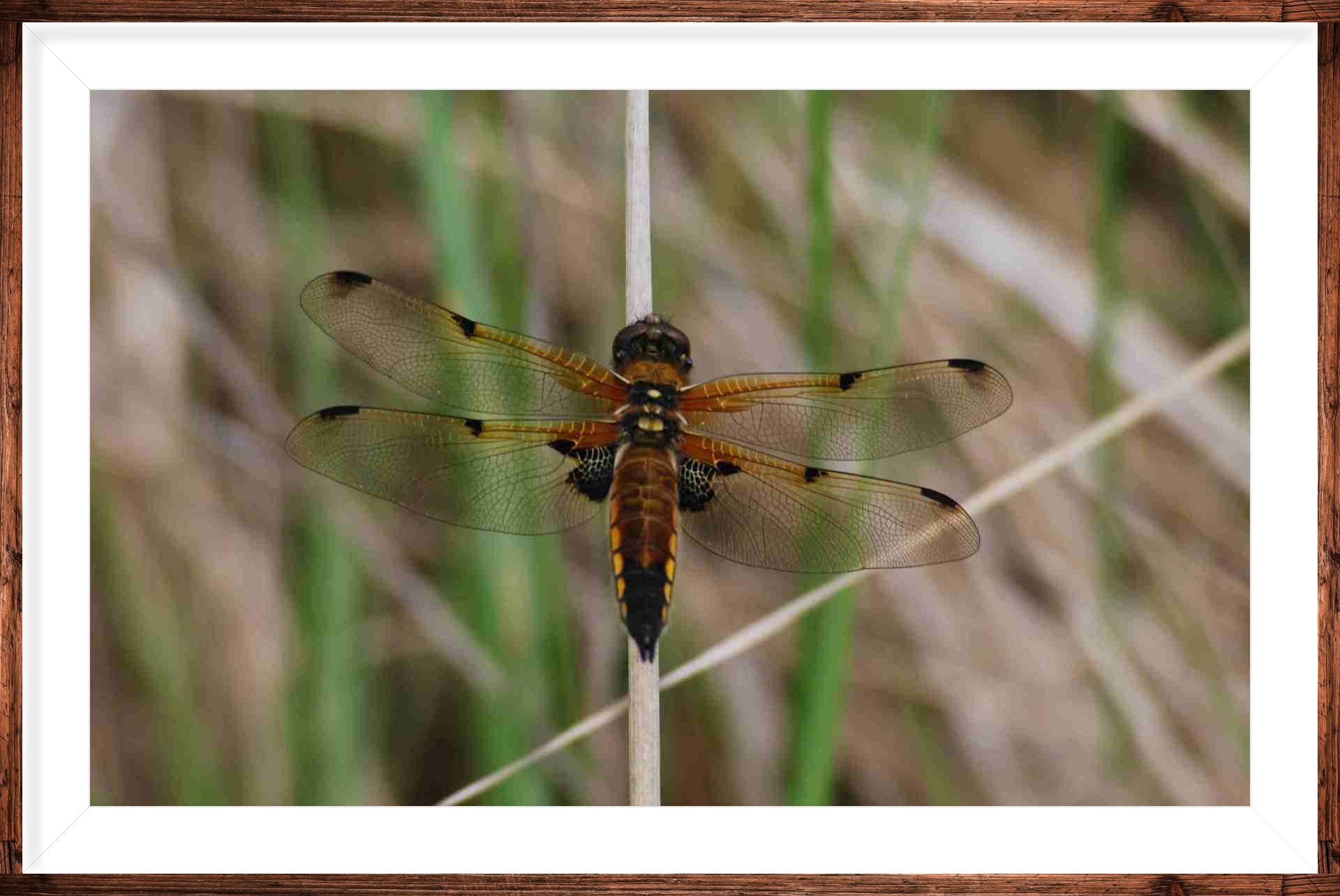 Oben die Südseite des Sees und unten eine Vierfleck Libelle von denen es immer mehr gab.