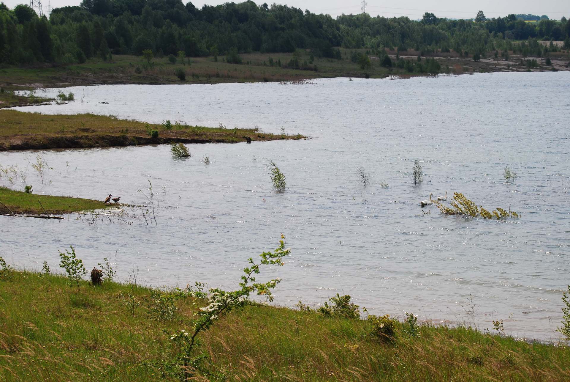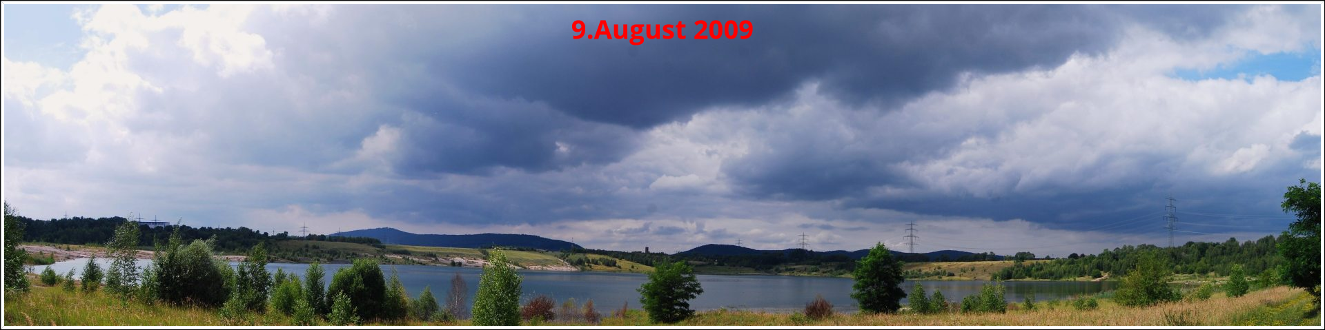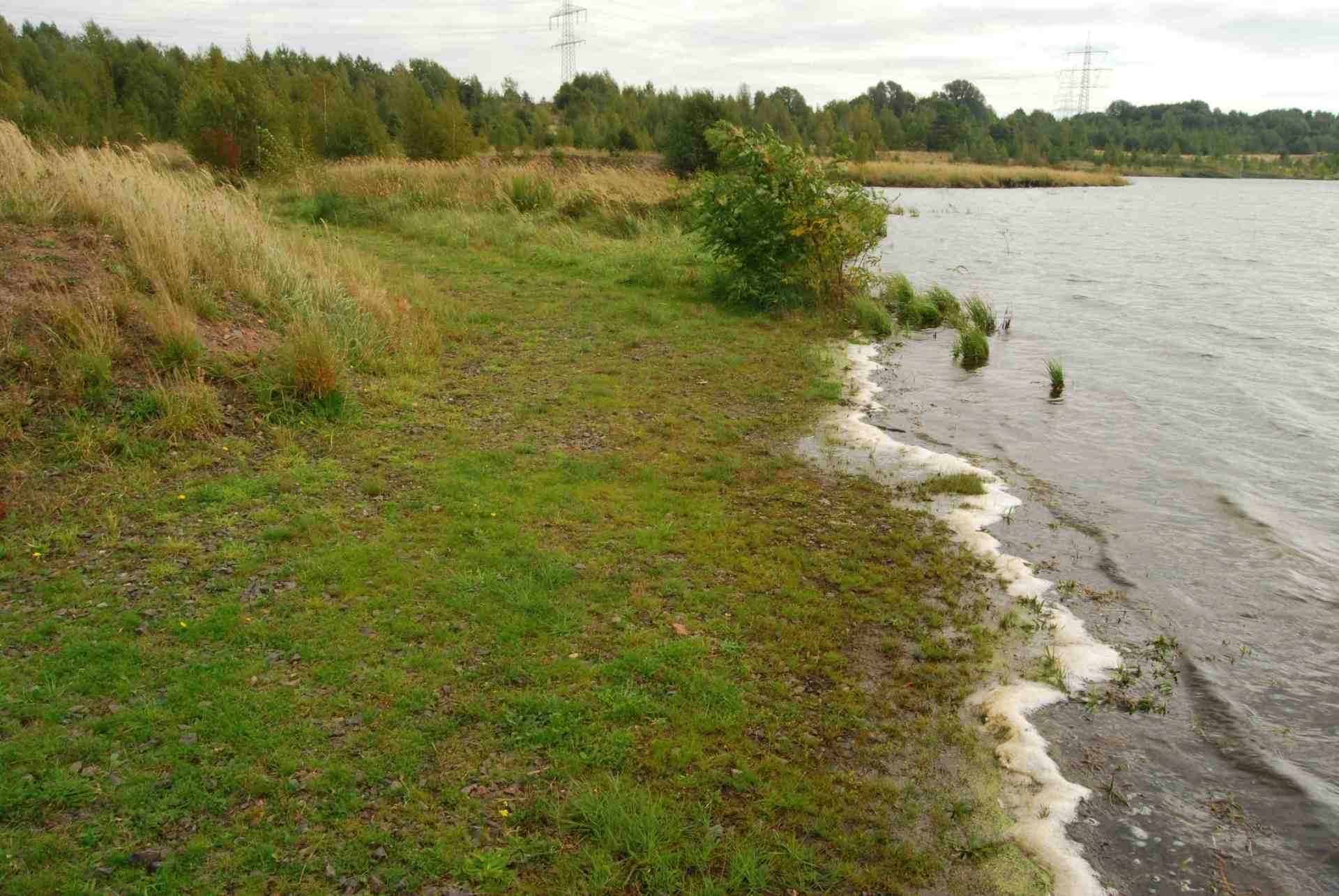 Damals am 9.August 2009 sah es noch so aus. Heute bei der Neugestaltung des Webformats gibt es das Schilf und den Wald schon nicht mehr.Das Wasser geht schon bis zum Anfang des Hangs.