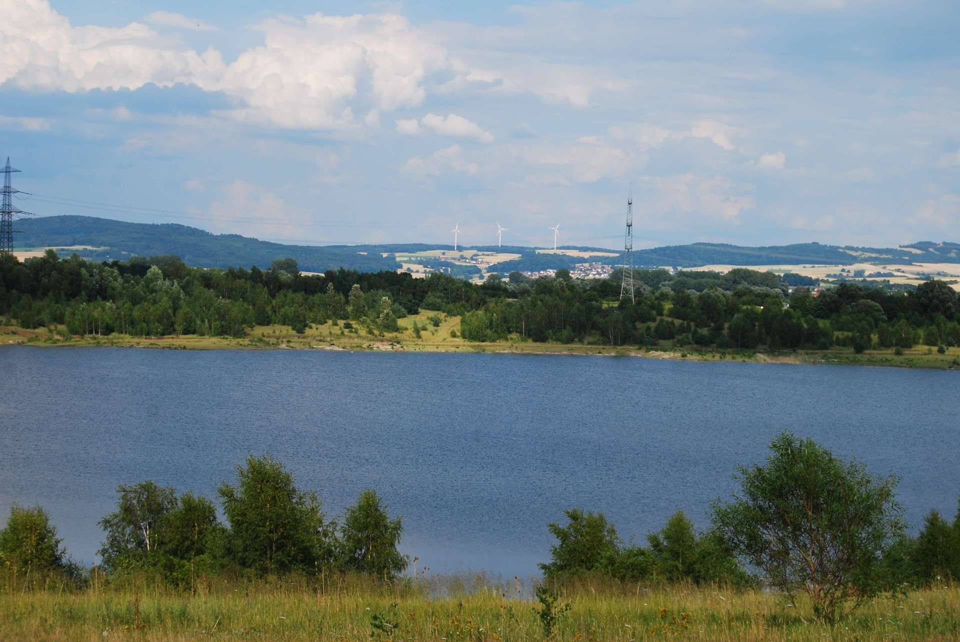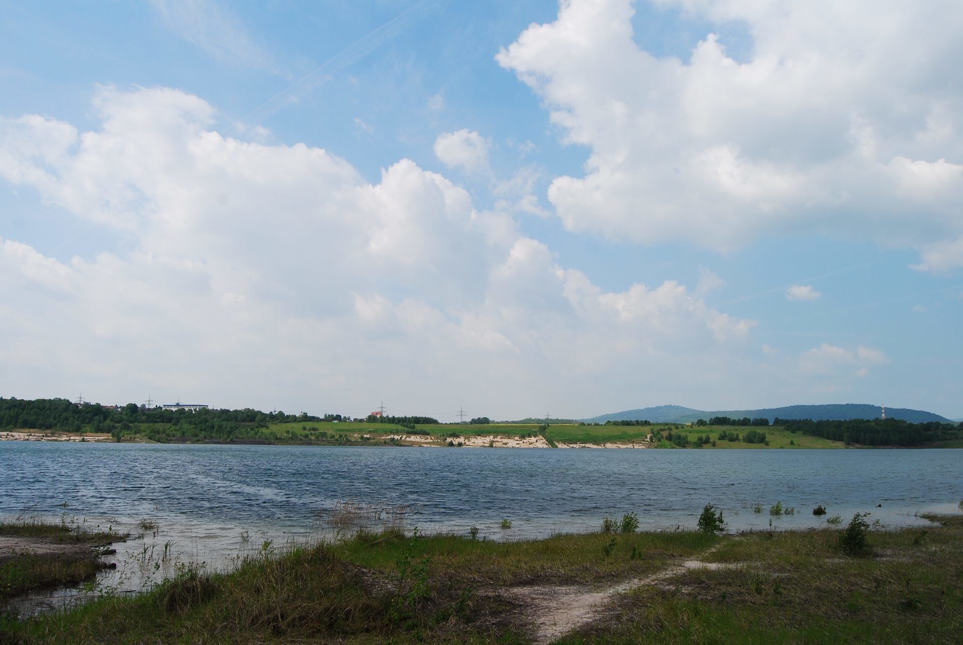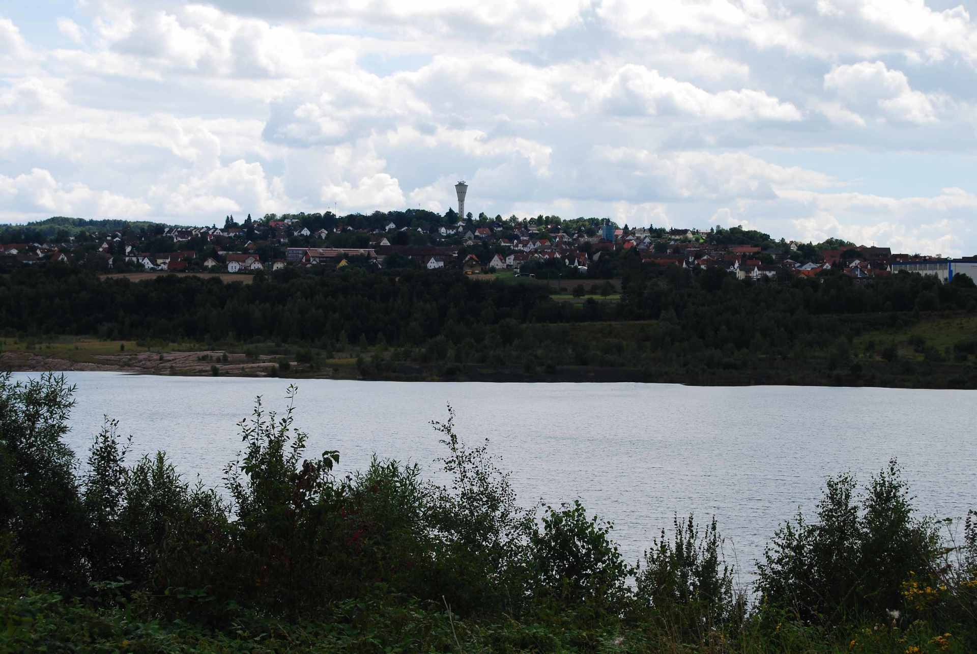 Damals am 9.August 2009 sah es noch so aus. Heute bei der Neugestaltung des Webformats gibt es das Schilf und den Wald schon nicht mehr.Das Wasser geht schon bis zum Anfang des Hangs.