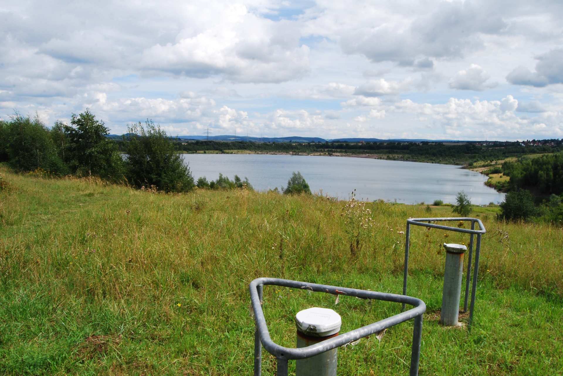 Oben die Schwalm hinter den Büschen.Unten der GombethSee mit seinen zwei GrundWasserTiefenMesser. Die Jahre zuvor gebohrt wurden.