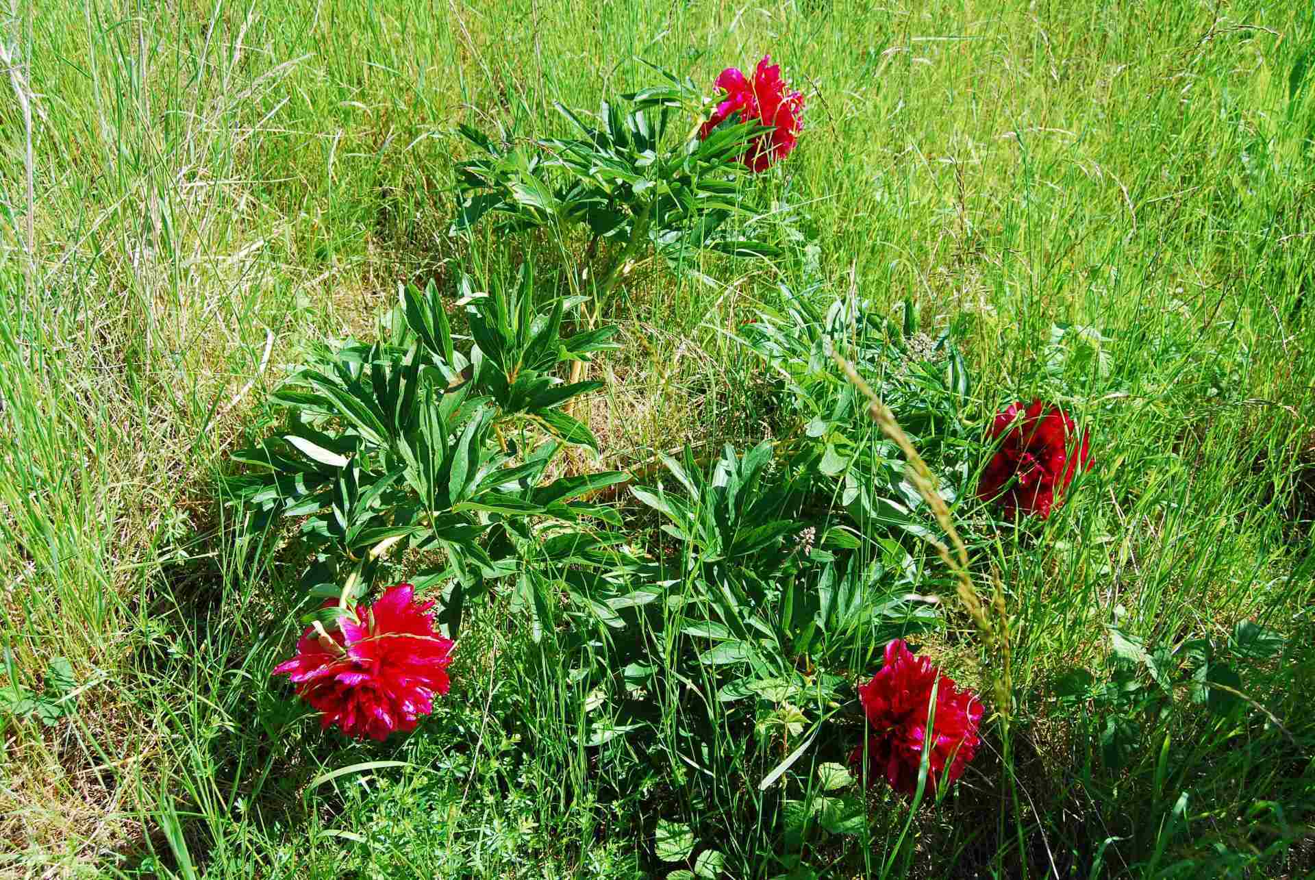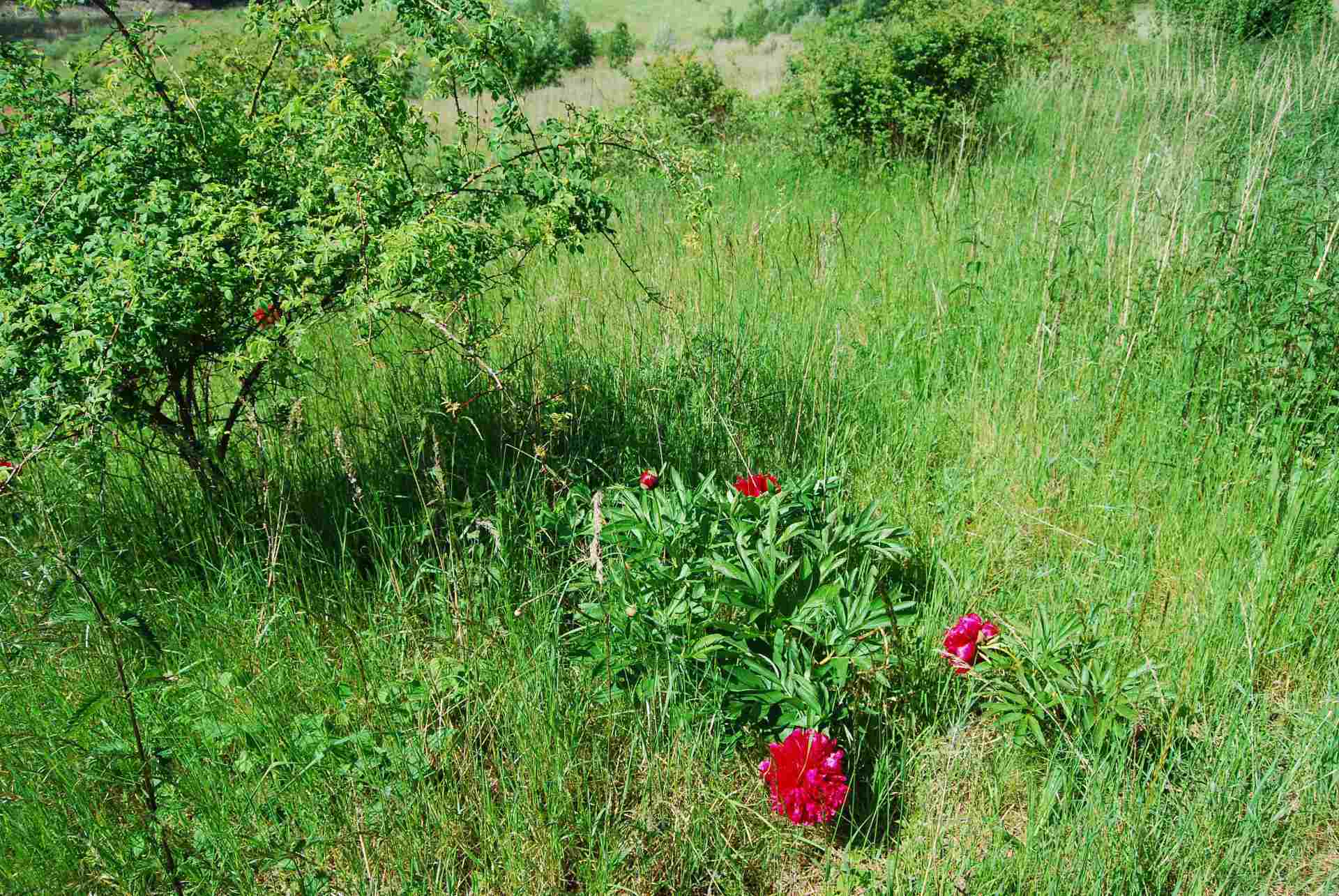 Diese Pfingsrosen hatte ich Jahre zuvor an den Nordhang gepflanzt in Samenform.Nach 4-5 Jahren waren sie dann sichtbar und blühten immer kräftiger von Jahr zu Jahr.Bis dann die Schafe im Frühjahr dort weiden durften.Ab dann waren die Pfingstrosen immer weggefressen und erholten sich auch nicht mehr.