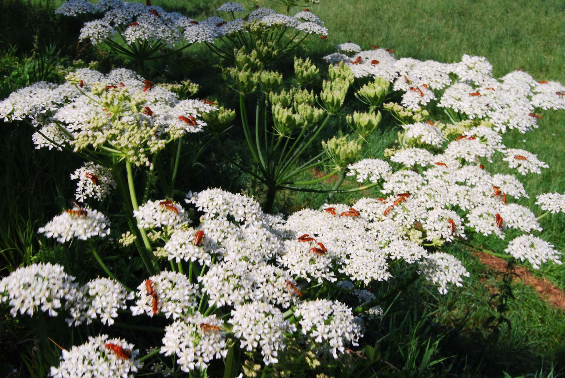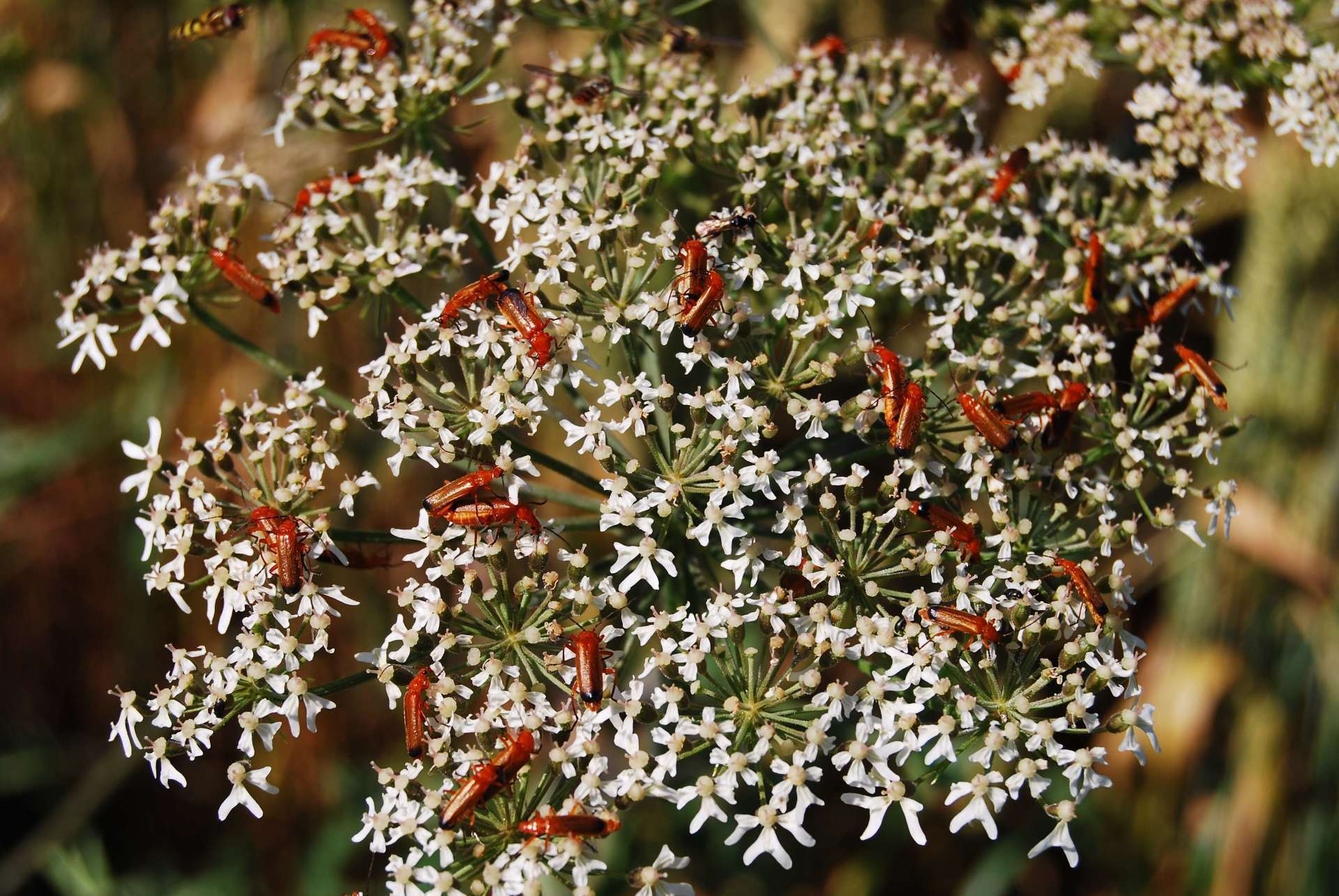 Diese Mengen Insekten waren 2009 noch vorhanden. Der Rotgelbe Weichkäfer hatte ein GruppenSchlürfen auf dem blühenden Wiesenbärenklau.