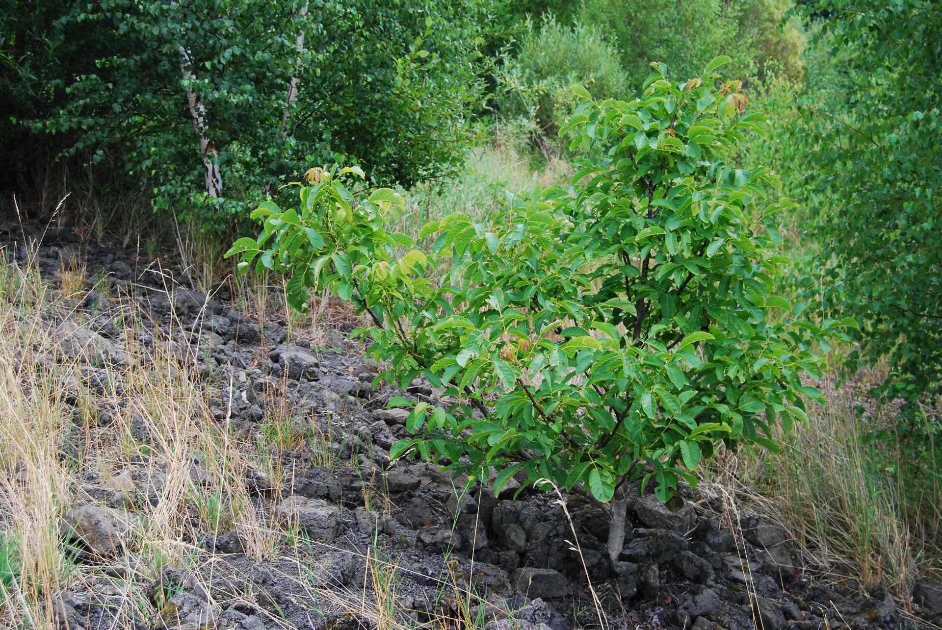 Dieser junge WalnussBaum ist einer von mehreren die dort an den Hängen wuchsen.Die Echte Walnuss, schweizerisch Nussbaum, ist ein sommergrüner Laubbaum aus der Familie der Walnussgewächse. Sie heißt meist umgangssprachlich einfach Walnussbaum oder Walnuss, regional auch Welschnuss oder Baumnuss. Sagt mal wieder der Edwin Wikipedia