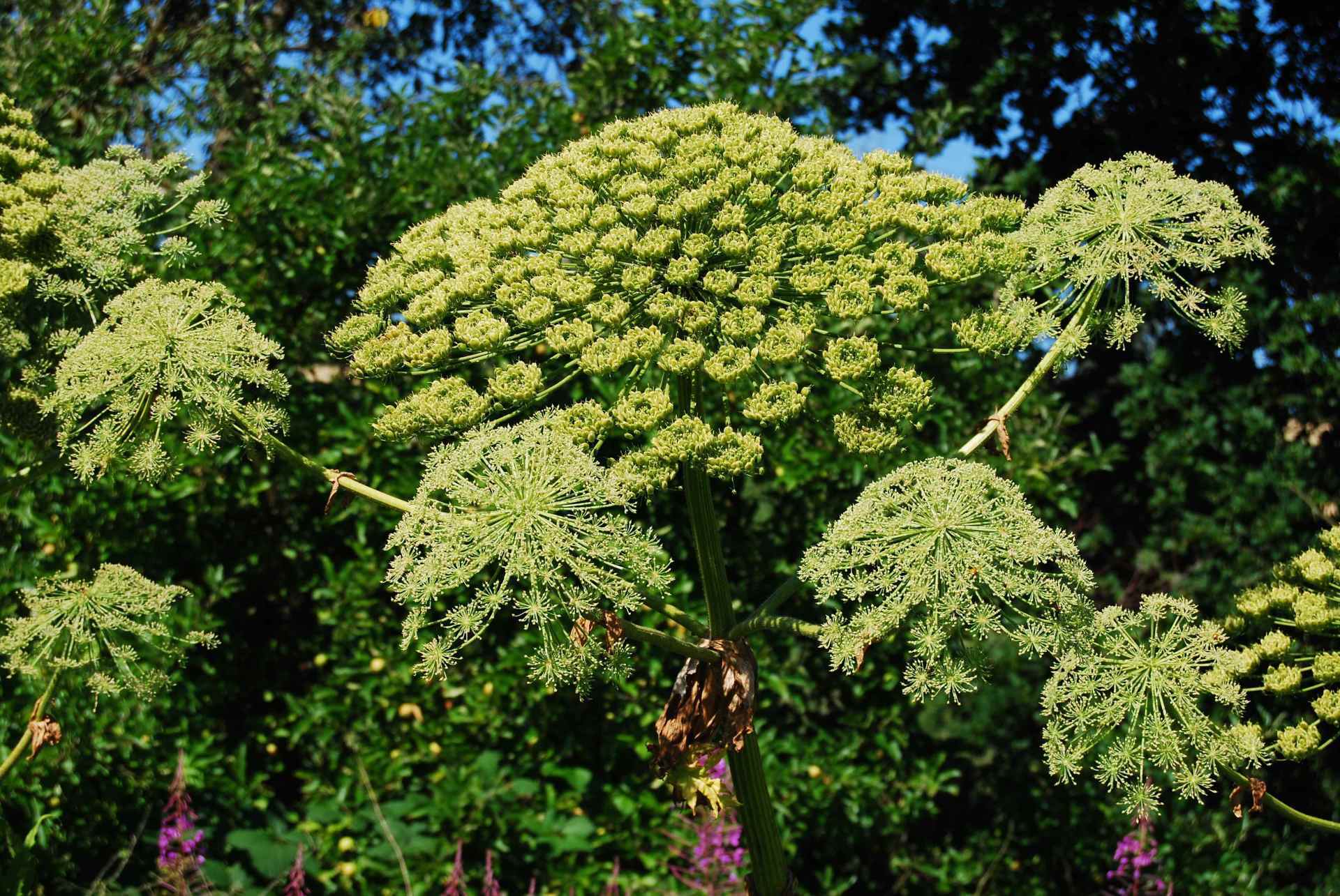 Der oder die Riesen-Bärenklau, auch Bärenkralle, Herkulesstaude oder Herkuleskraut genannt, ist eine Pflanzenart aus der Familie der Doldenblütler. Sie ist eine zwei- bis mehrjährige, wenn unbeeinflusst einmalblühende krautige Pflanze, also keine Staude. Von Edwin Wikipedia