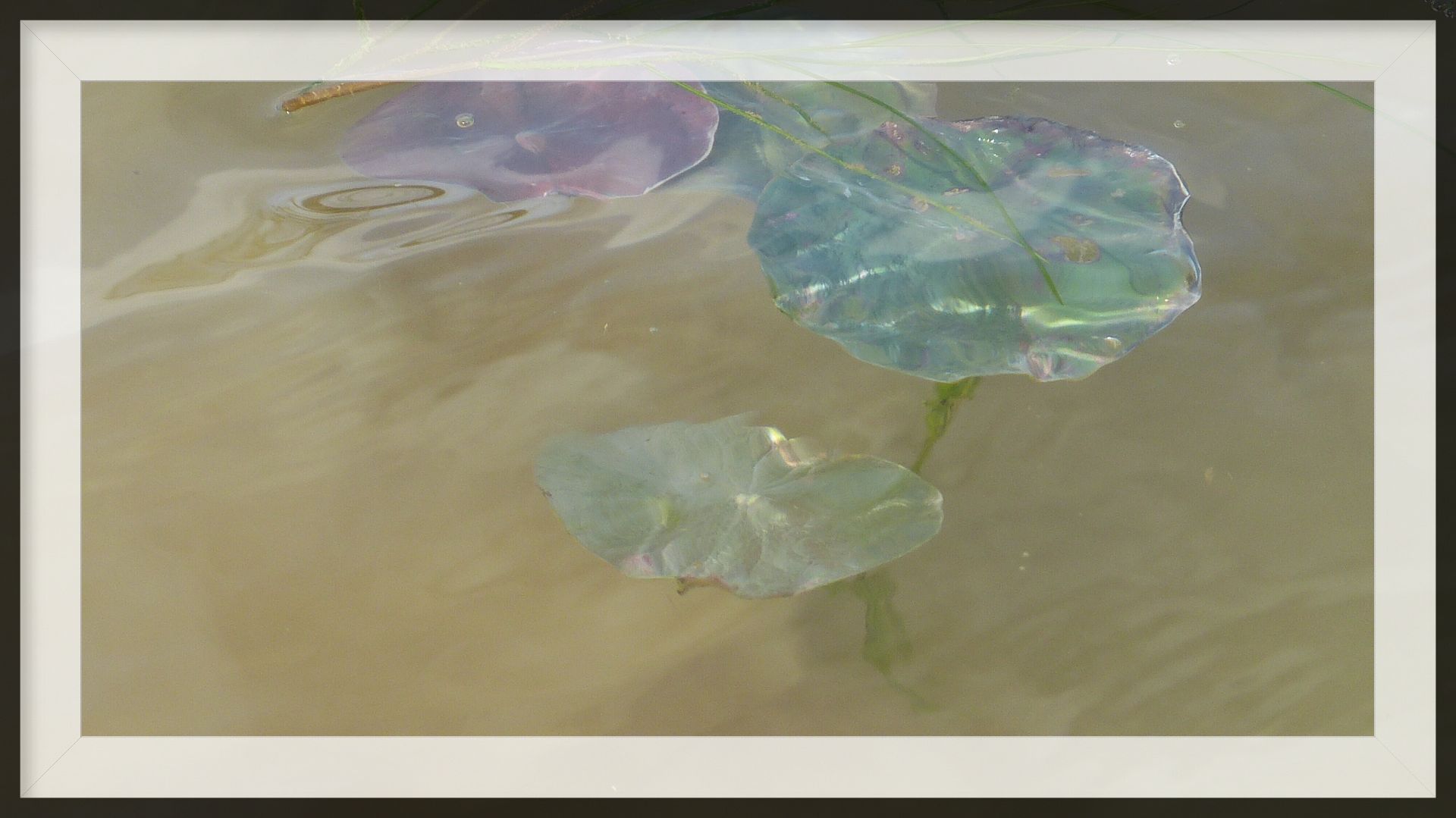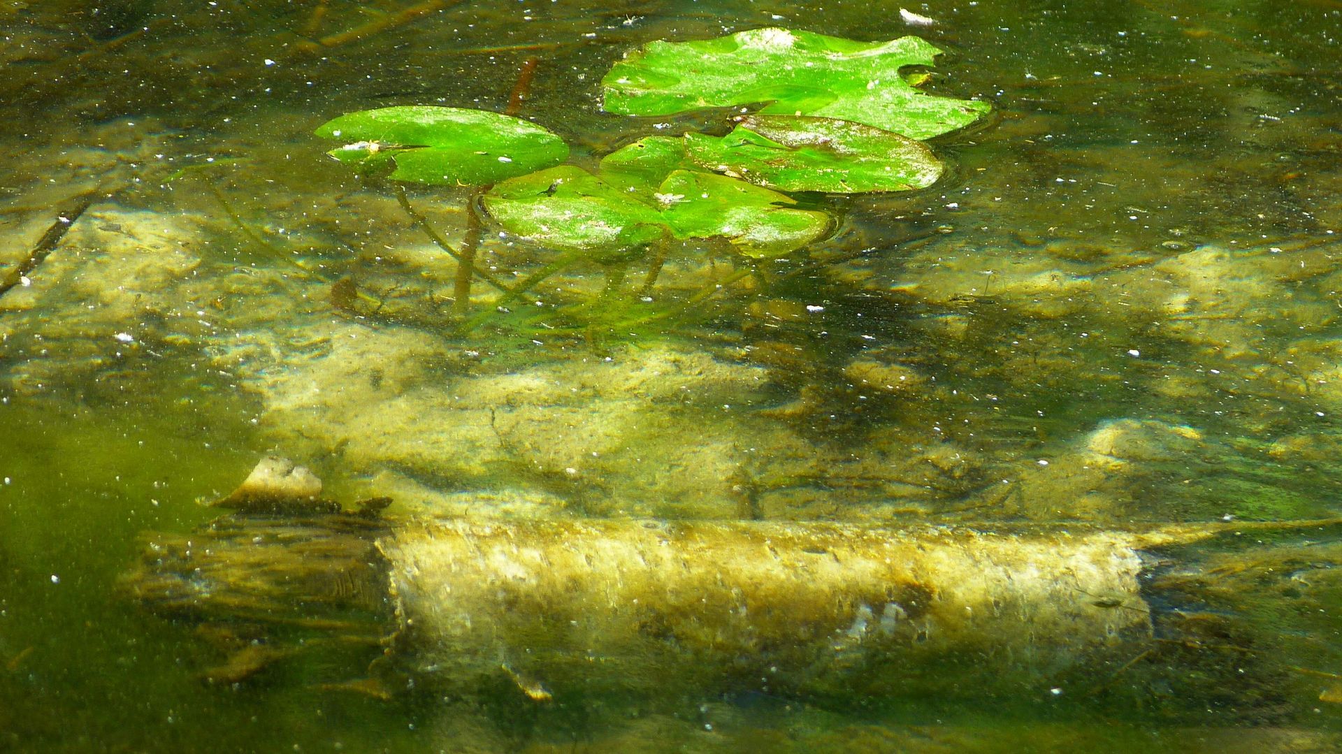 An dieser Stelle sah ich die runden Blätter der Wasserpflanze zwischen den Ästen nahe des Ufers