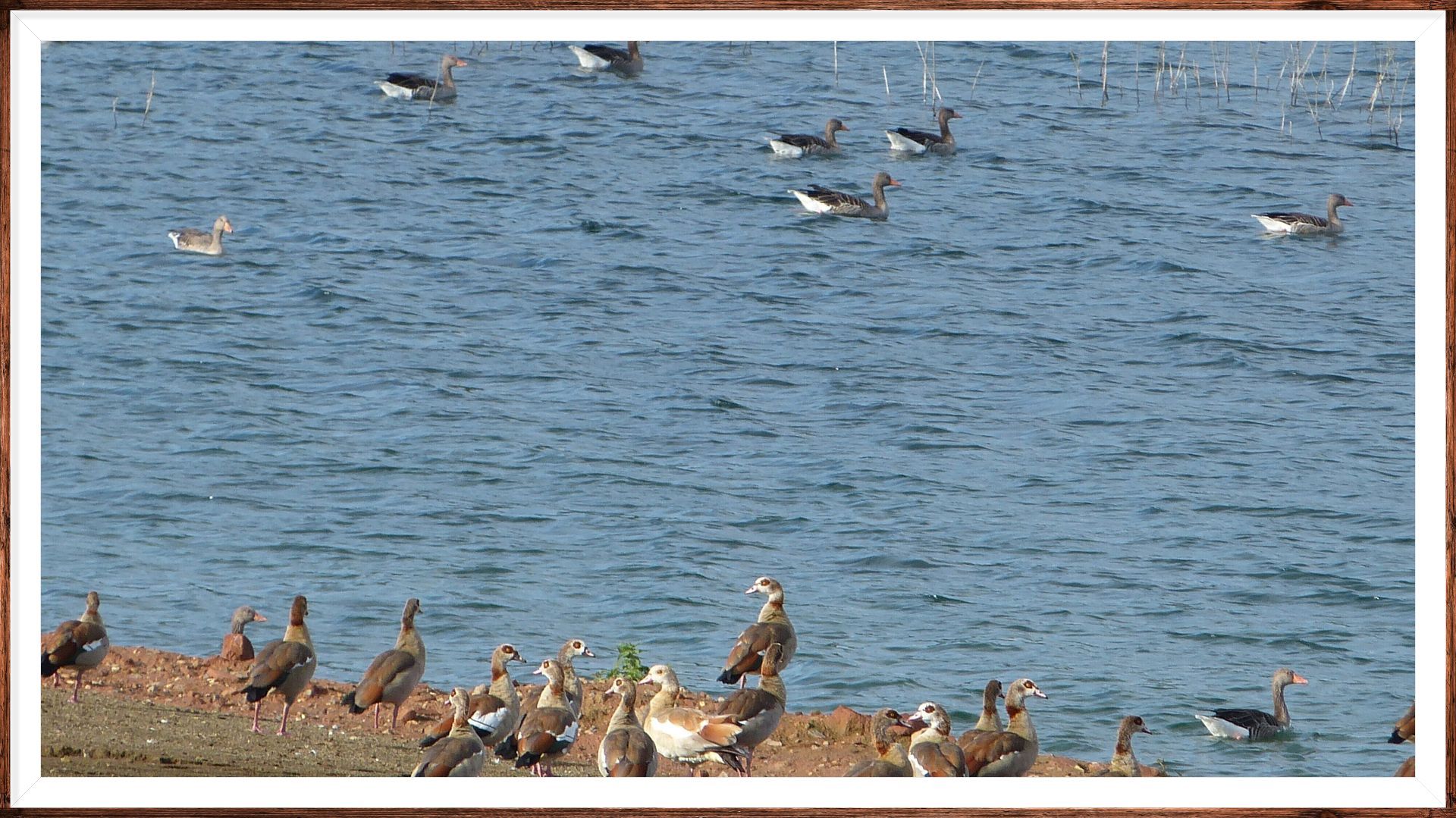 Und weil sie dort am Ostufer diese große Landefläche haben, kommen dort Nilgänse aus der ganzen Umgebung zusammen, insbesondere nach der Brut mit ihrem Nachwuchs.