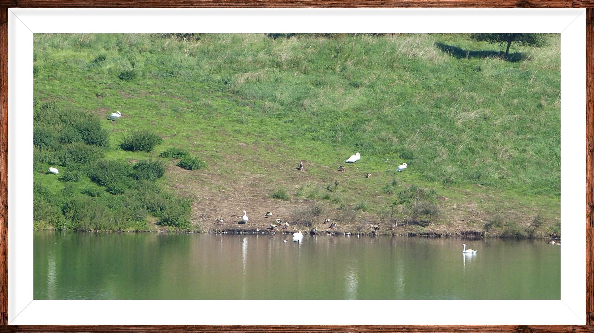 Ende des heißen Sommers 2023 war der Nordufer Rastplatz der Schwäne und Gänse ziemlich verdorrt und voller Gans und Schwan Kot. Und das gesamte Gras war abgefressen, schön glatt wie mit einem guten Rasenmäher. Unten die Fotos sind das Nordufer von gegenüber fotografiert.