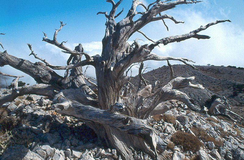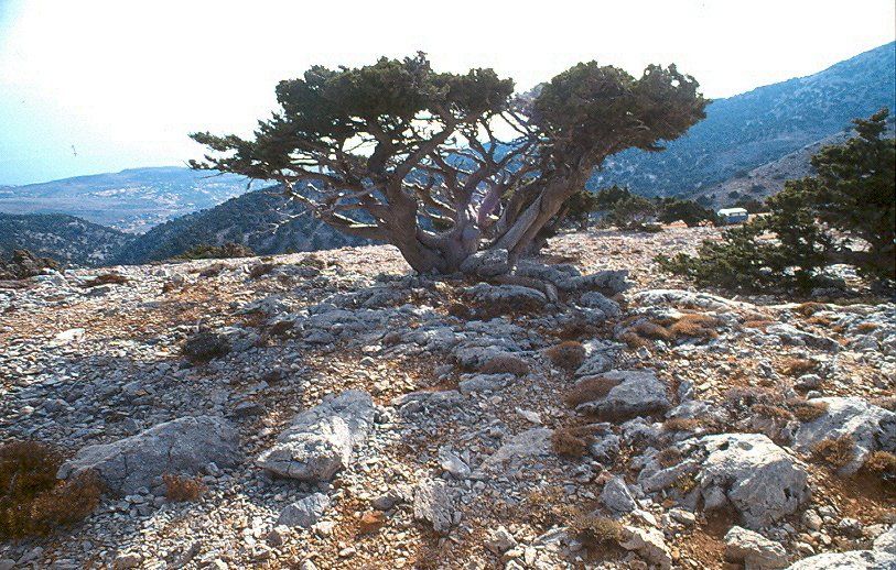 Mit dem Geländefahrzeug starten wir vom Dorf Anopoli aus über eine unbefestigte Straße, die uns über 20 km durch Wälder aus Pinien, Steineichen und alten Zypressen bis zur Baumgrenze bringt. Hier beginnt die "Hohe Wüste", wo uns das Fahrzeug absetzen wird, auf einer Höhe von 1950 Metern.