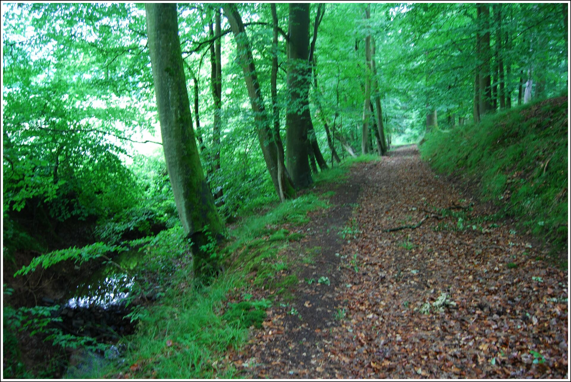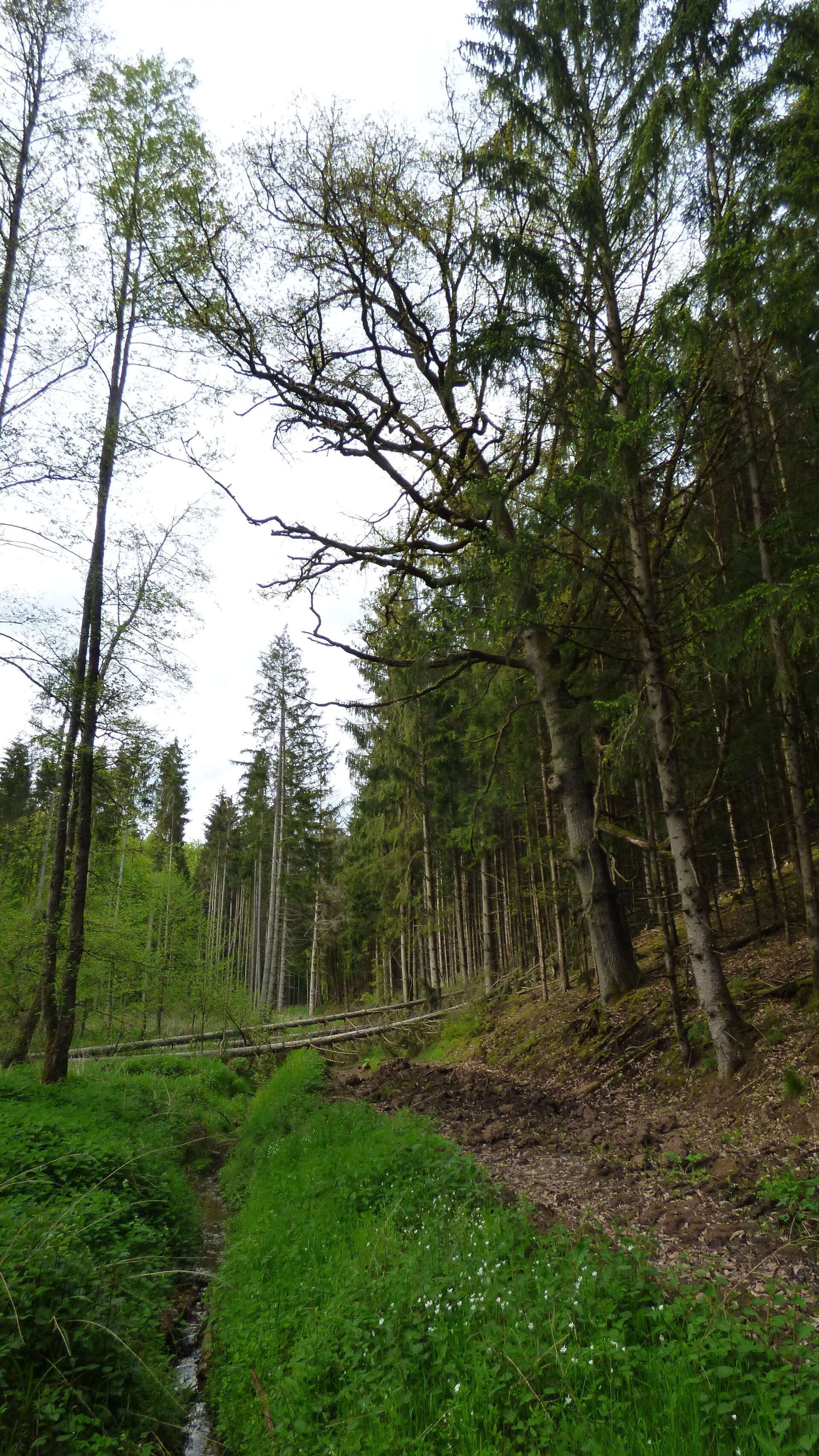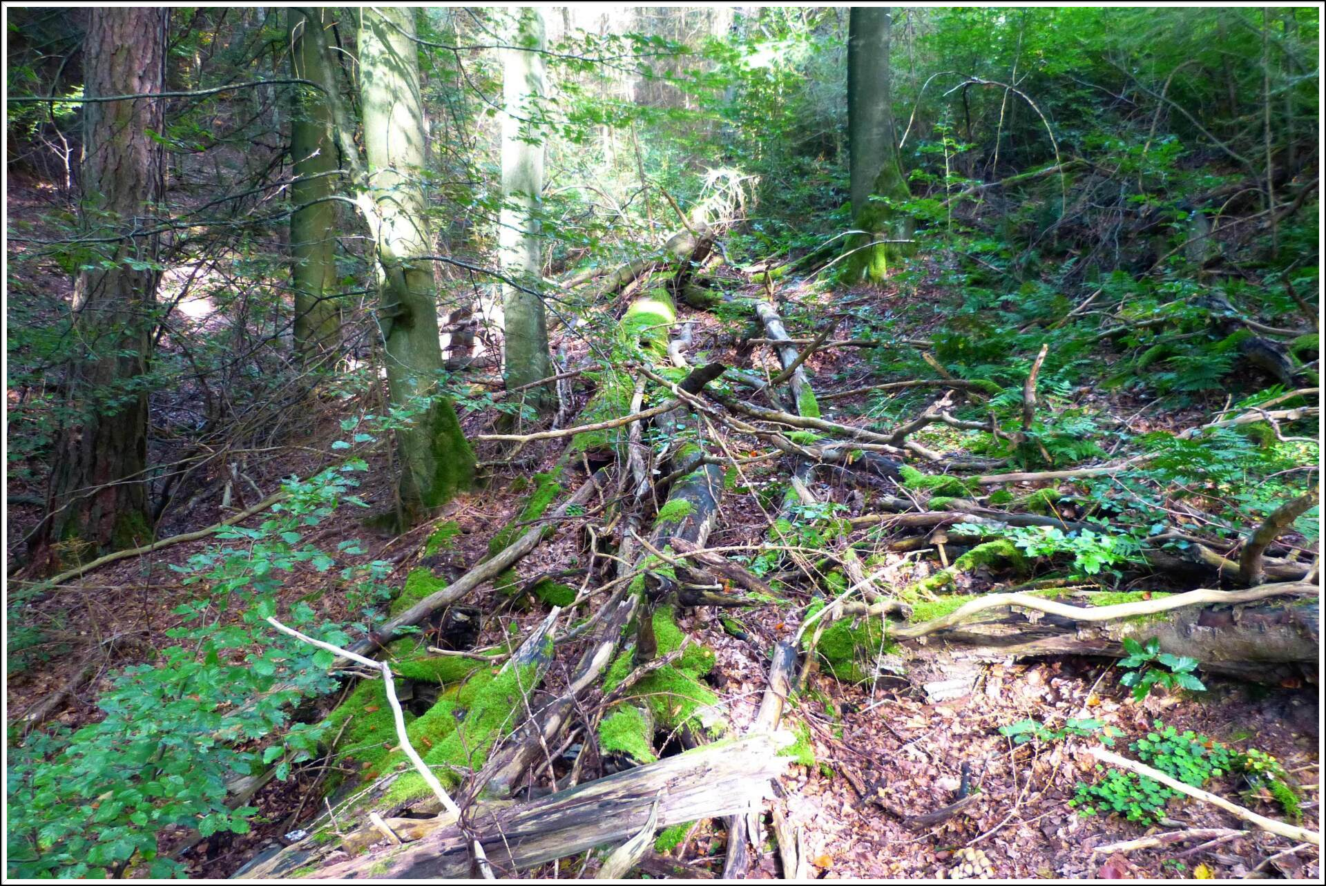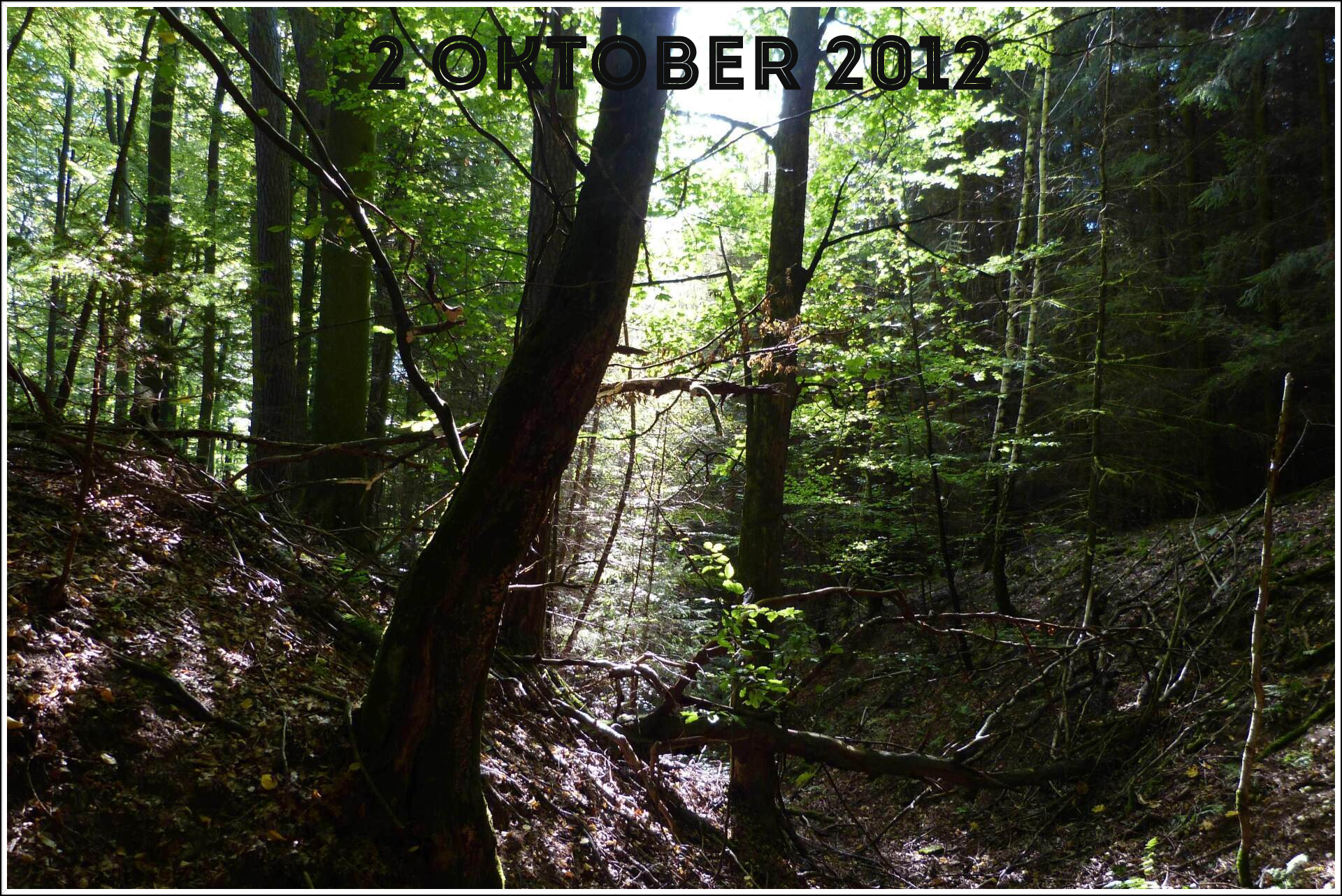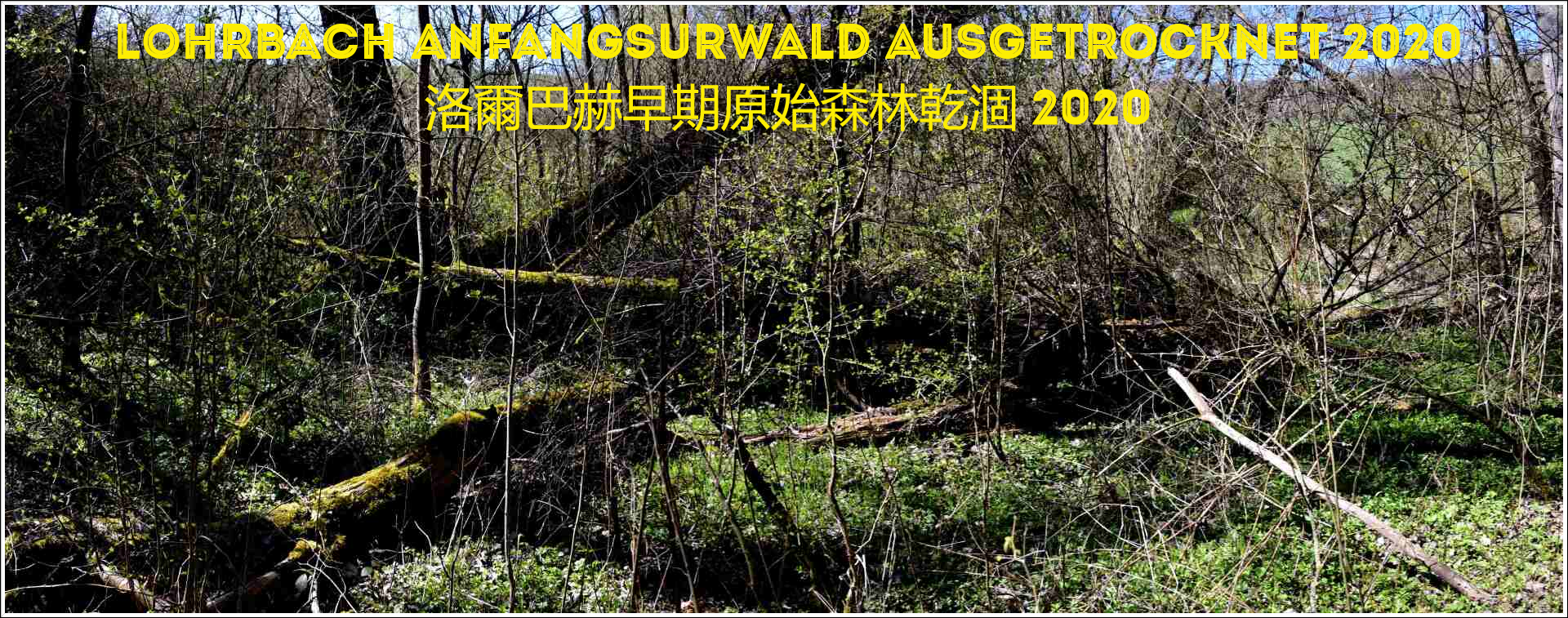 Oben im Foto eine Zusammenfügung von zwei Fotos unten dann die echte unverfälschte Umgebung.Damals war der Waldweg noch unbewachsen.Heute 2021 ist sehr viel zugewachsen mit jungen Buchen und einige schwere Fichten sind zerschmettert worden und liegen quer über diesen ehemaligen guten Waldweg entlang des Lohrbachs.Hier geht praktisch der berühmte "Niemand" entlang außer ich selber.