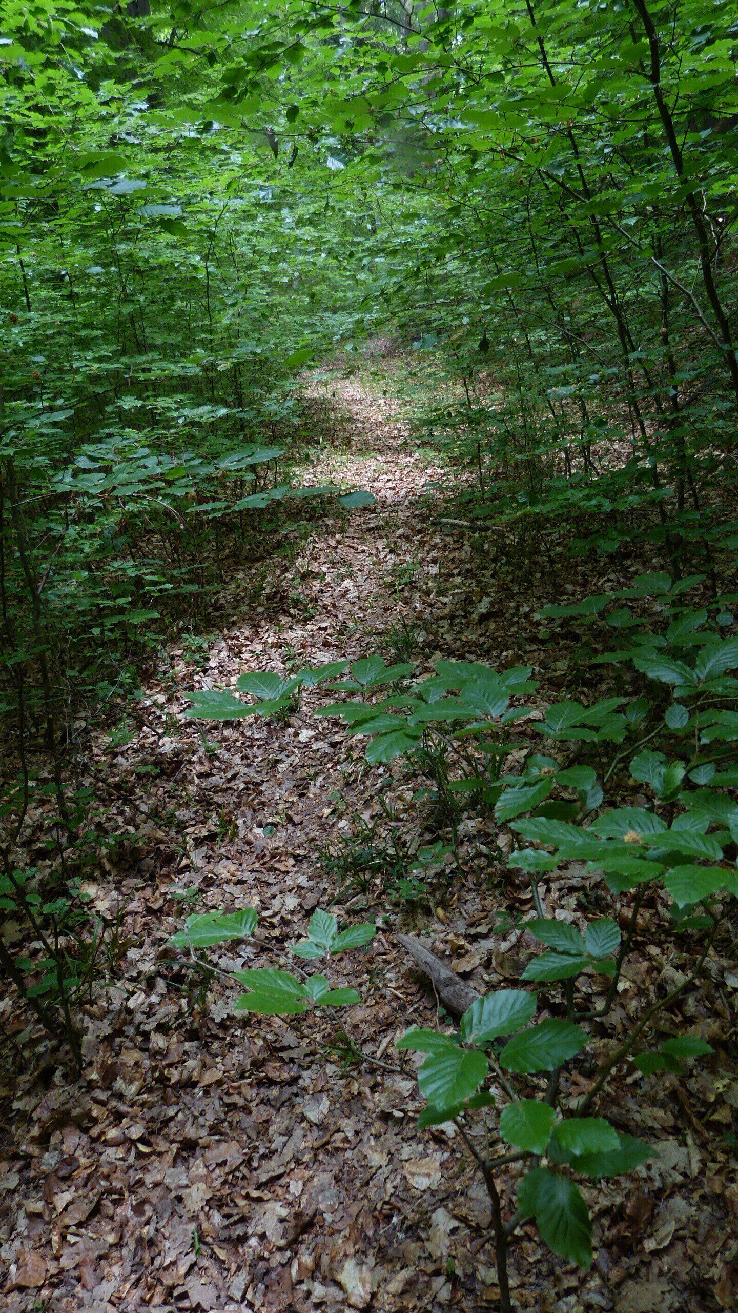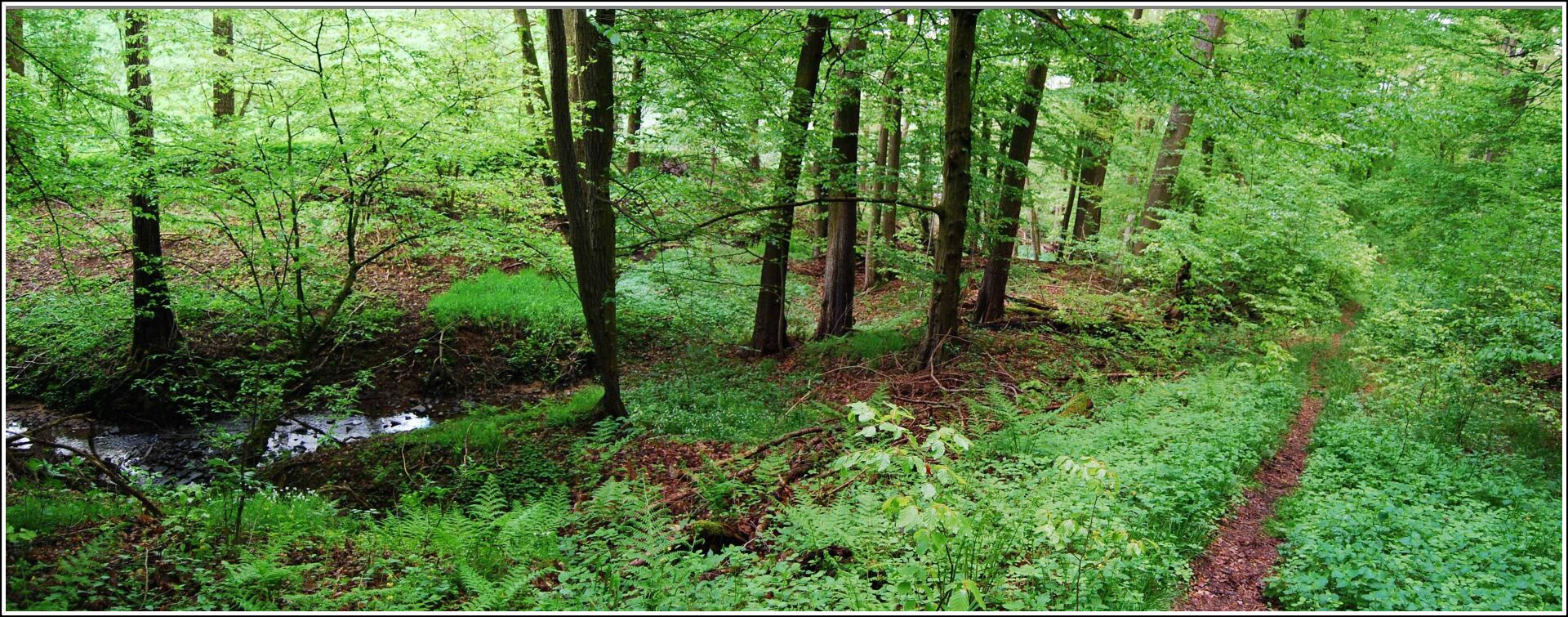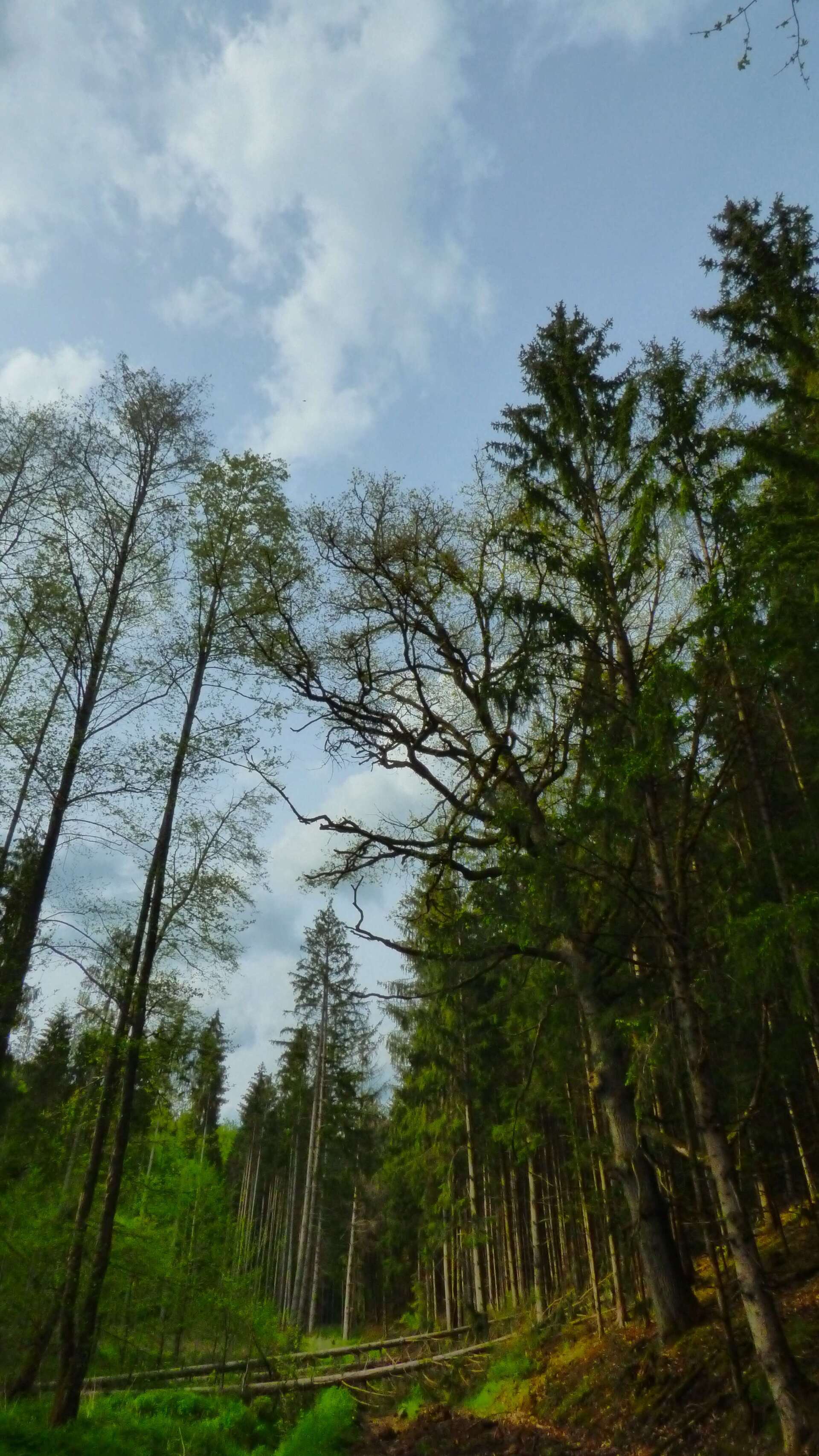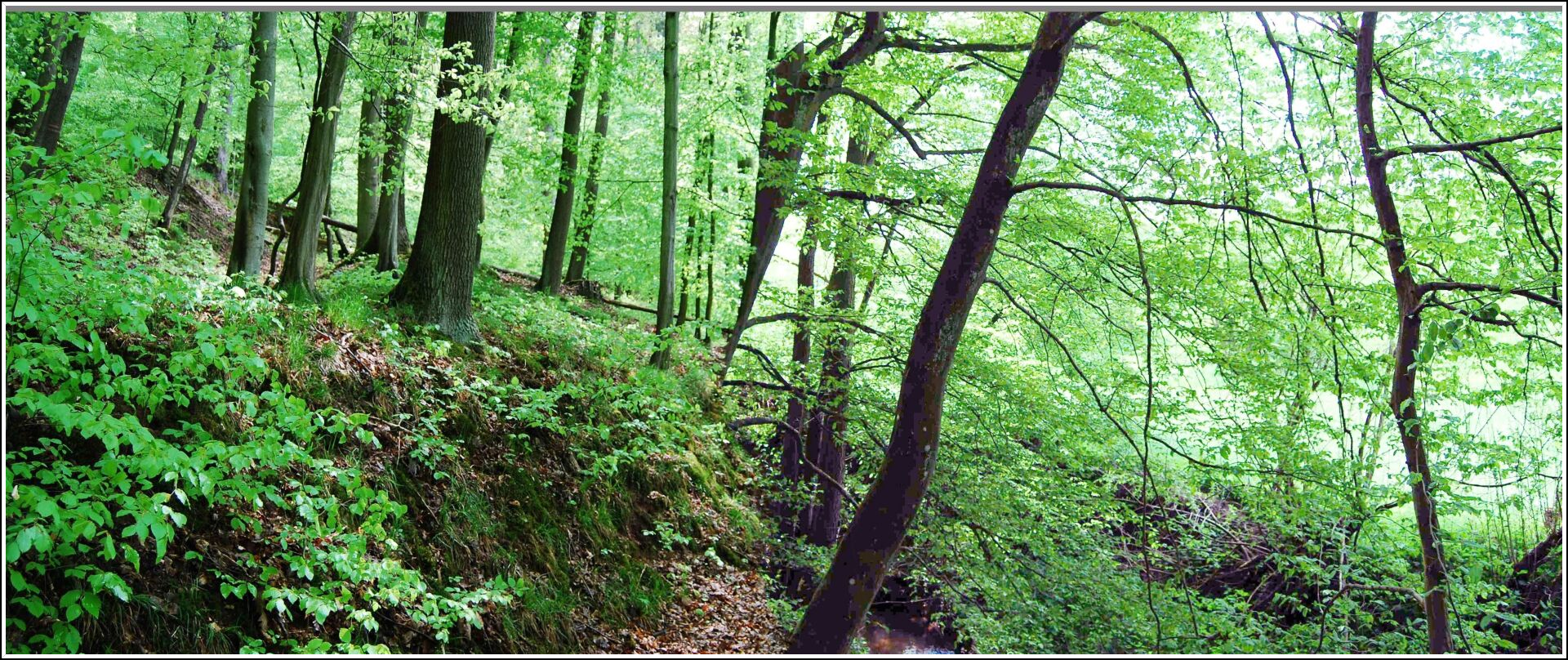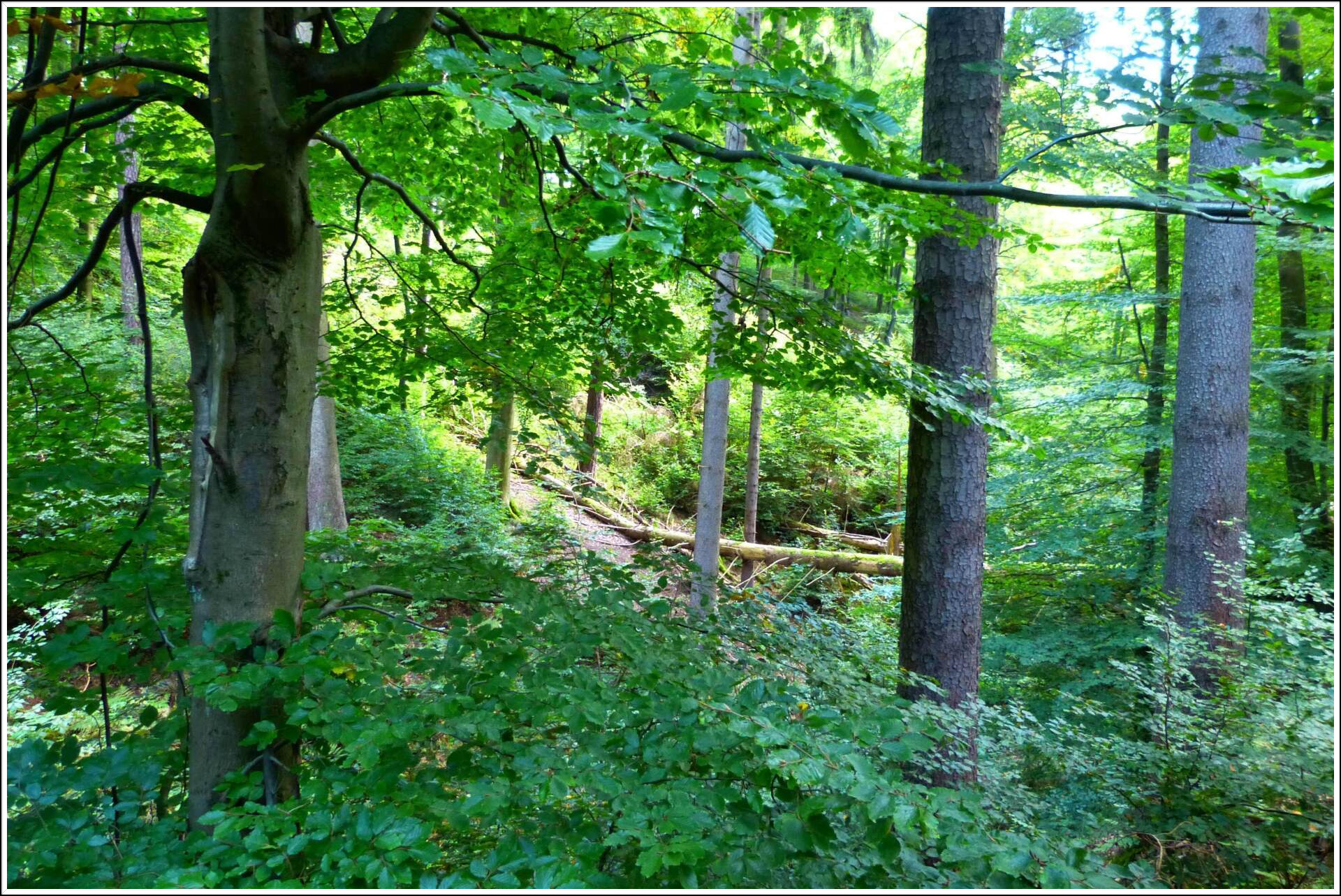 Oben im Foto eine Zusammenfügung von zwei Fotos unten dann die echte unverfälschte Umgebung.Damals war der Waldweg noch unbewachsen.Heute 2021 ist sehr viel zugewachsen mit jungen Buchen und einige schwere Fichten sind zerschmettert worden und liegen quer über diesen ehemaligen guten Waldweg entlang des Lohrbachs.Hier geht praktisch der berühmte "Niemand" entlang außer ich selber.