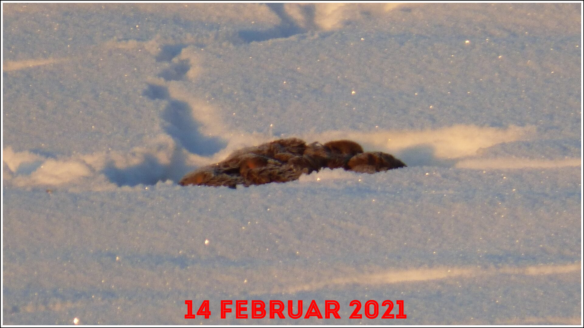 Die unten im Schnee schlafenden Rebhühner liegen direkt in der Nähe der Häuser an der Rechten Seite auf dem obigen Feld. Ich lege ihnen Winter Futter aufs Feld wenn’s ganz krass kalt ist mit viel Schnee. Aber auch das wird moniert vom Göttchen des Monierens sogar mit Anwälten und vor's Gericht schleppen. Der Mensch als zwischengeburtlicher nichtwissender unwissender Vollblutignorant im Horizont der lichtlosen Leere seines dunklen Gehirn Gebäudes .Aber was wussten die alten Griechen schon: Das Sehen. Es ist der Seher der sieht und nicht die Augen. Die geben bloß Perspektive für diese dreidimensionale Welt, diese düstere dunkle wo das Licht von außen auf alles scheint. Es gibt aber Welten höhere Welten da scheint das Licht von innen auf alles. Jedenfalls diese momentan nicht räppenden Rebhühner machte da am Feldrand neben dem Haus eine Schneesiesta.
