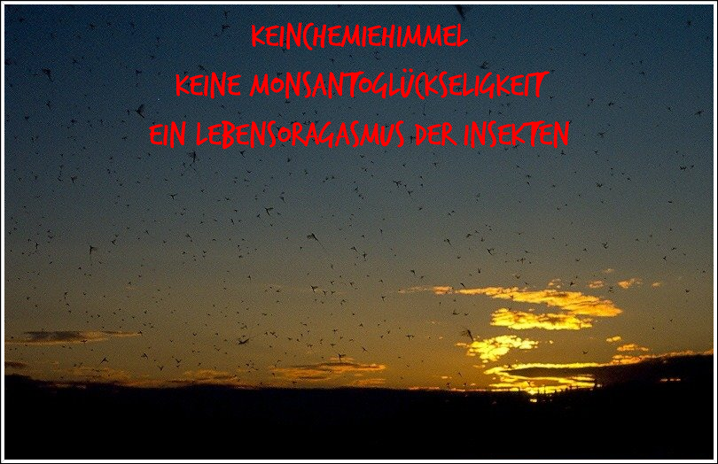 Und Heute am 11.2.2020 während ich diese Seite auf das neue Format übertrage,da haben wir einen Insekten Exodus.Die Lüge hat soweit gewonnen.Der Profit.Dem haben die Verantwortlichen immer den Vorrang Vorhang gegeben.Die Zeitungen sind voll mit Insektensterben Berichten.Insektensterben. Der Begriff Insektensterben bezeichnet den Rückgang der Zahl bzw. Biomasse der Insekten und/oder der Artenzahl von Insekten in einem Gebiet. Es ist Teil der Biodiversitätskrise, die seit der Ausbreitung des Menschen in allen Familien des Lebens festzustellen ist. sagt mal wieder der Edwin Wikipedia.