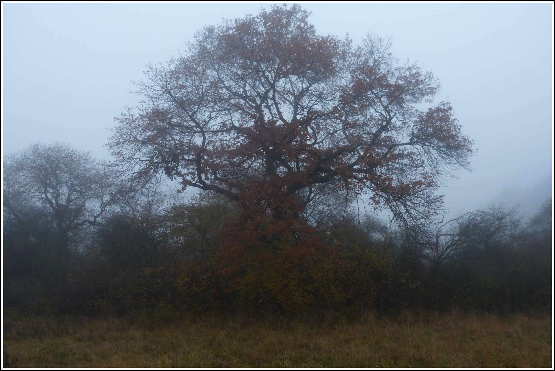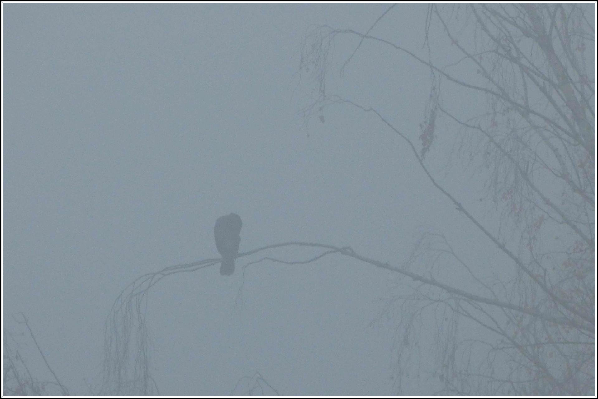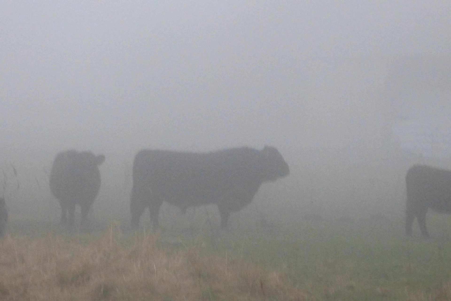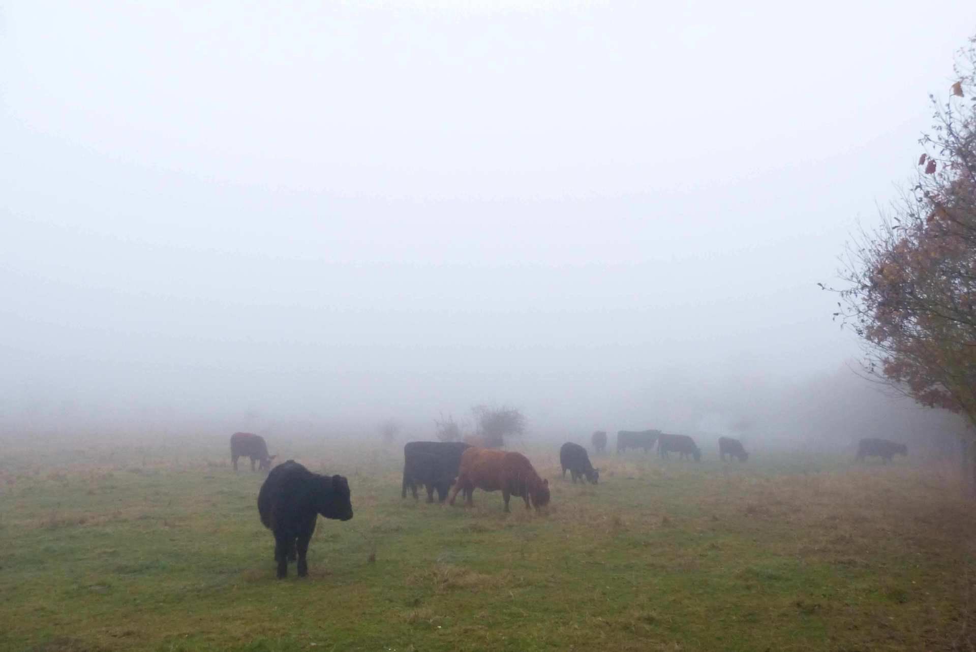 Dann endlich wieder der Rundweg geschlossen. Einmal umwandert am Ufer und Nichtufer. Der Bulle unten der benebelte der rief nach einem befreiten Stück Wiesengrund. Aber er stand schon darauf. Manchmal stehen auch Kanada Gänse dort wo er jetzt steht und Graugänse machen ein auf honky tonk show im Gleichklang ihres Watschelgangs.