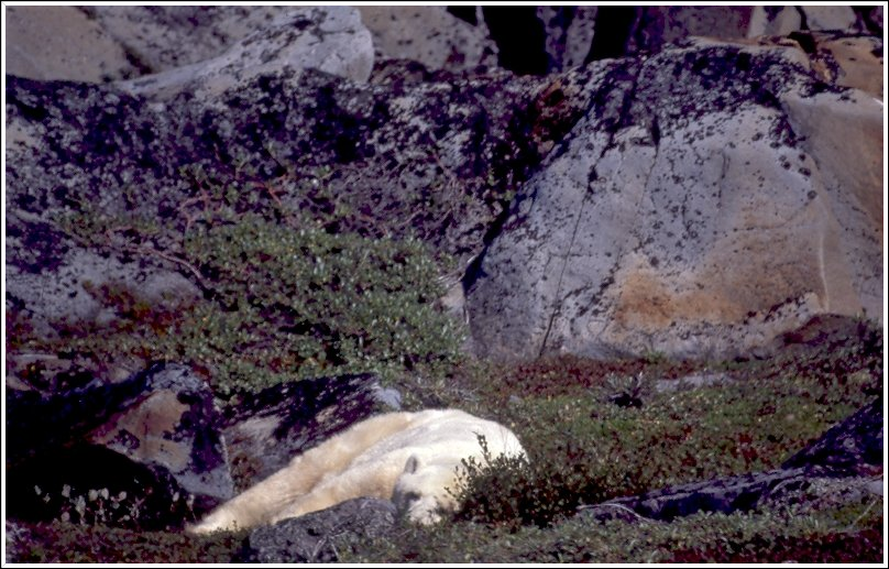 So verließen wir diese Position und umwanderten den Felsenrücken an dem der andere Bär schlummernd sich sonnte um braun zu werden. Was ja kommen wird wenn die Hitze weiter gen Norden wandert und das Eis keine andere Lebens Möglichkeit für sie lässt als Braun zu werden. Und so standen wir auf einmal hinter dem anderen Bären der seinen Kopf hob.