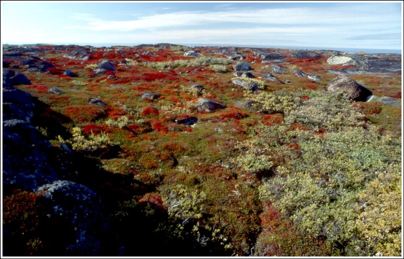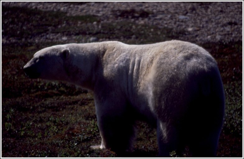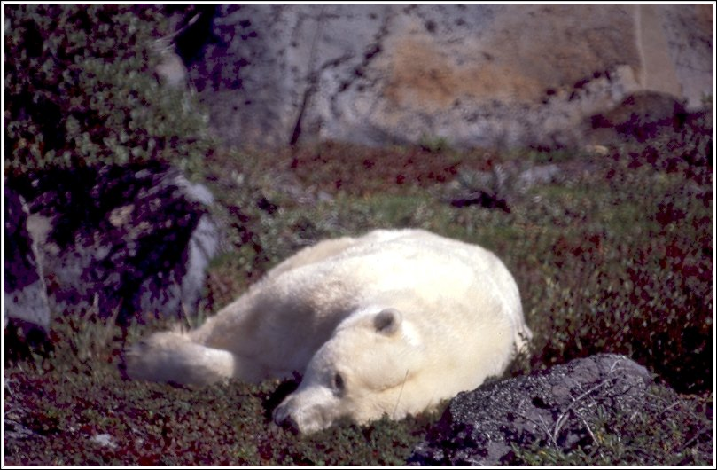 Das sind die Spuren von einem Tundra Buggy. wahre Monster, mit Reifen so breit wie ein Golf. Einer dieser Tundra Buggy würde die mutige Japanerin und mich vor "Unglück" bewahren. Denn wir beide fuhren mit dem Beluga Hotel Auto in diese Gegend etwas entfernter von Churchill südöstlicher. Dort wanderten wir dann in der Landschaft herum auf der Suche nach Eisbären. Ich hatte ja das Gewehr von Timothy Johnson dabei. Es gab diese Überlandleitungen wegen des Permafrosts in dieser Formation. Wir waren schon eine UhrZeit spaziert und hatten vor uns diese Gruppe von niedrigen Büschen. Da kam plötzlich einer dieser Tundra Buggys vorbeigefahren. Der Fahrer war alleine in dem großen Gefährt und staunte erschrocken dass er uns in dieser Gegend "ZuFuß" sah. Er bot uns sofort an in sein Gefährt zu kommen, und zeigte uns dann in welcher brenzligen Situation wir beide wirklich waren. Denn keine 50 Meter weiter hinter den Büschen lagen diese beiden unteren Eisbären und dösten.
