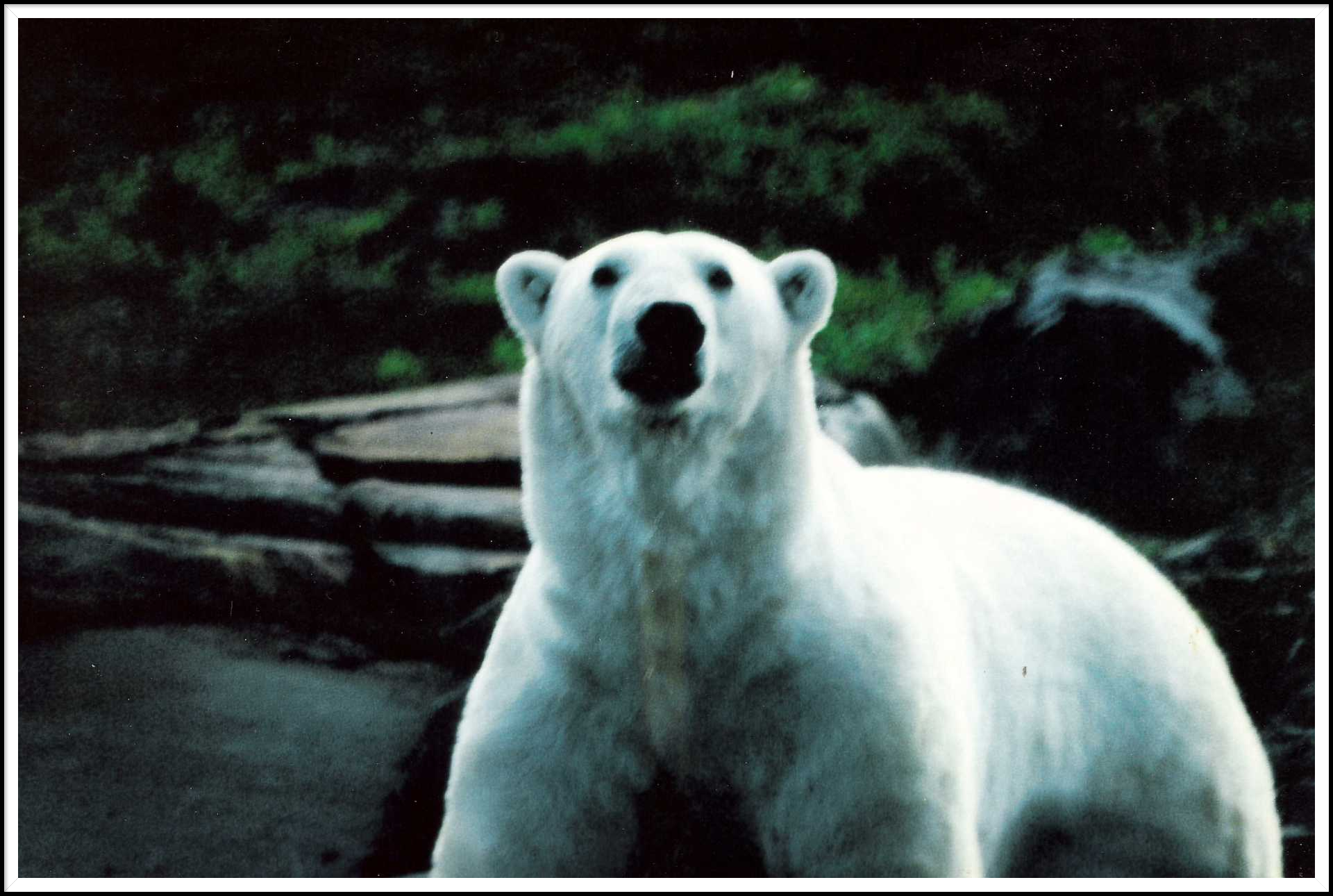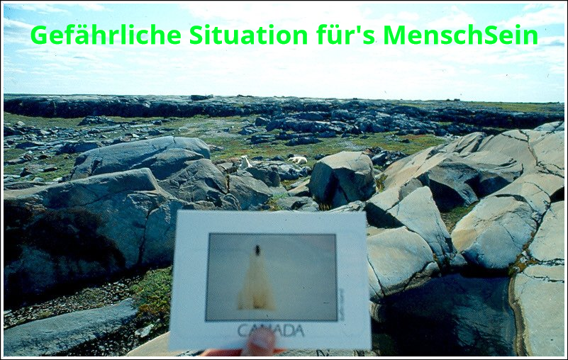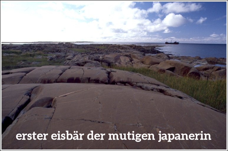 Diese beiden Eisbären aber insbesondere der untere schlafende der würde aber sofort aufstehen und auf den Tundra Buggy zugehen und direkt ans Fenster kommen und herumschnuppern was denn da zu bekommen wäre. Ich hatte davon auch Fotos gemacht wir wir beide da im Tundra Buggy sind und der Eisbär hereinschaut auf Stippvisite sozusagen. Aber die Fotos liegen nun verpackt im Keller unter abertausenden anderer DIA Reisefotos. Das war natürlich perfektes Timing mit diesem Tundra Buggy .Manche würden sagen Zufall. Aber der Zufall ist ja kein „Offenfall“ es fällt ja etwas zu, wird also genau passend gemacht, das ist nämlich der Zufall mit einer positiven Mentalität betrachtet. Es ist kein abwertendes irgendetwas irgendwiewas nein, es ist der Moment der Perfektion der Zufall. Und so bekam die Japanerin ihren "Thriller" oder anders formuliert ihren "EisbärBonus".