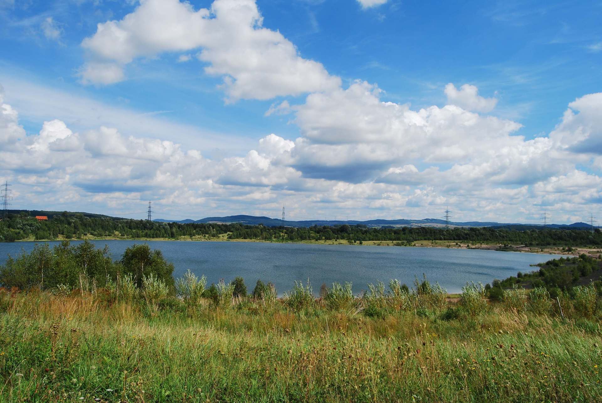 Damals am 9.August 2009 sah es noch so aus. Heute bei der Neugestaltung des Webformats gibt es das Schilf und den Wald schon nicht mehr.Das Wasser geht schon bis zum Anfang des Hangs.