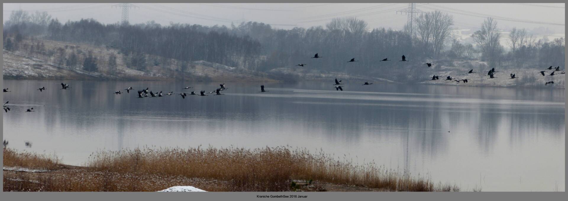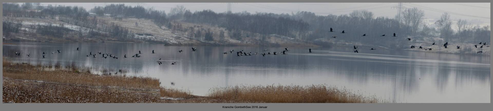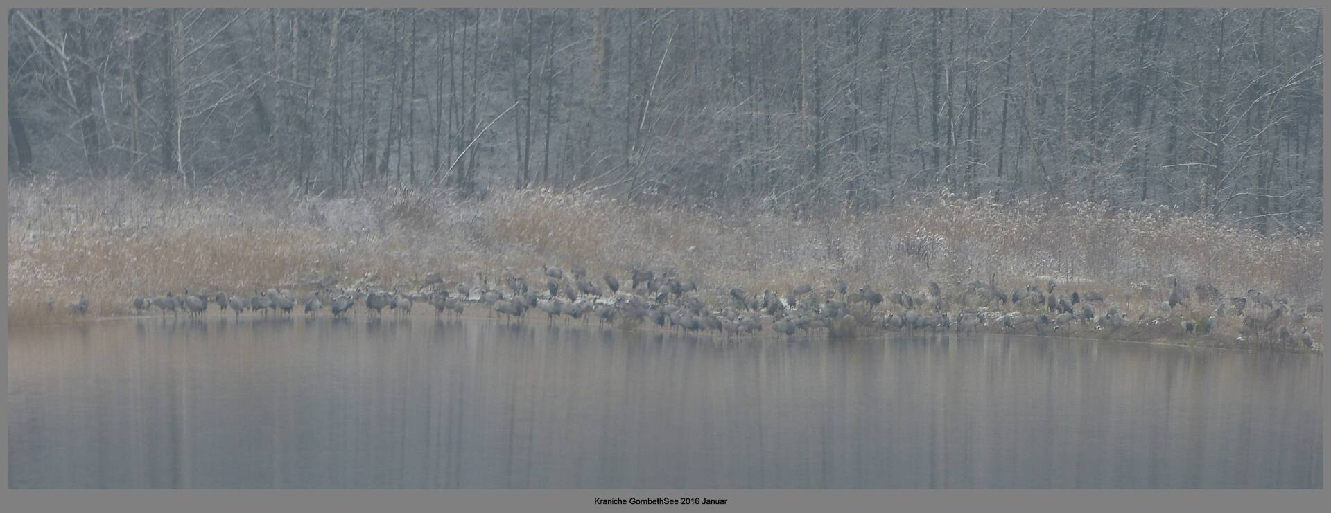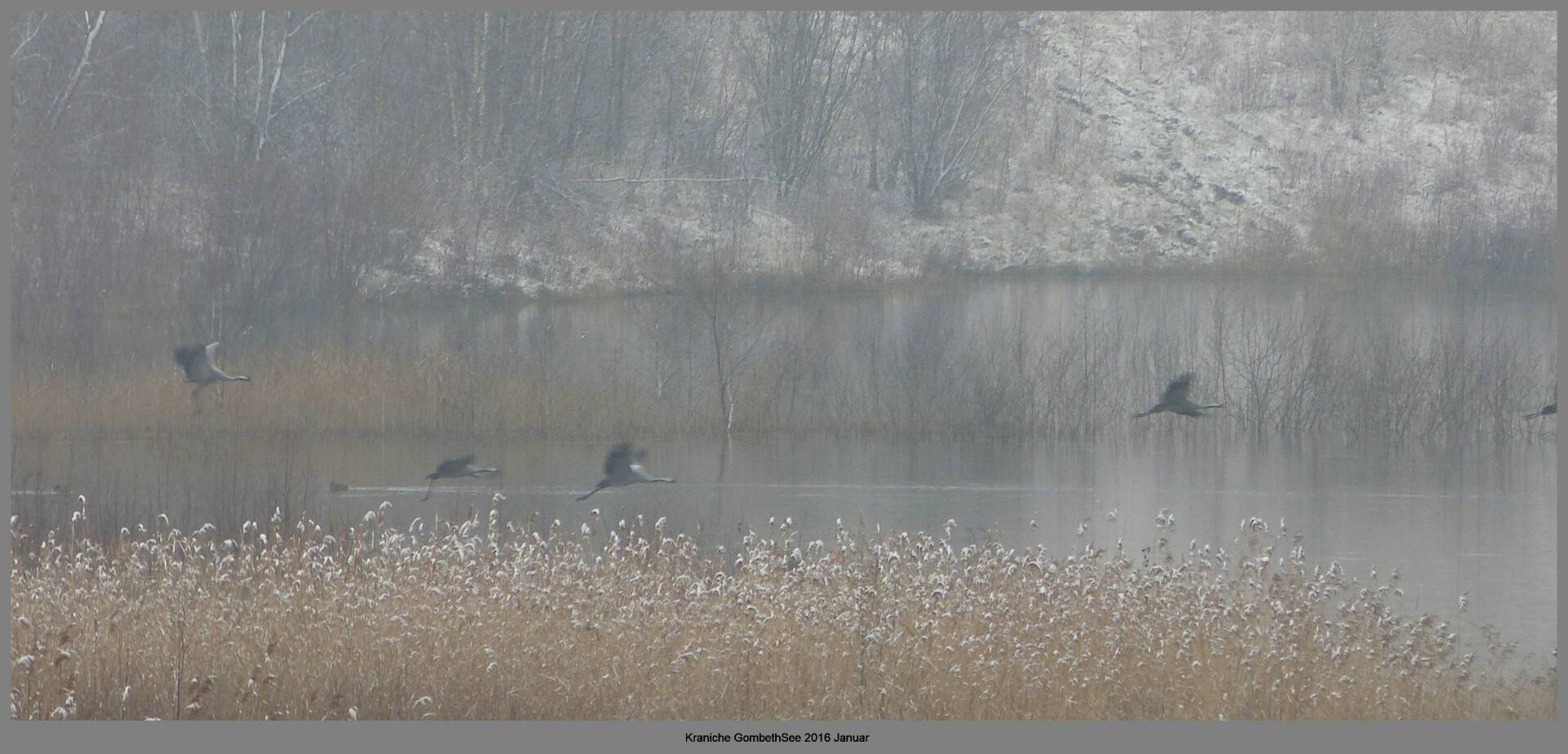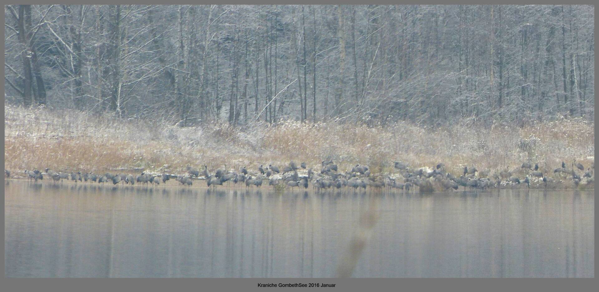 Und diesen Weg musste ich hinunter schlendern von der Ostufer Seite mit Blick auf das Westufer, um zum wachsenden Gombeth See zu kommen, um einen besseren Blick auf die Kraniche zu bekommen, die irgendwo dahinten, links, unten, am SüdUfer waren, und ihre Gesänge nun schon lauter schallten. Es hörte sich nach sehr vielen Kranichen an ein guter Chor für Bachs Nachweihnachtsoratorium.