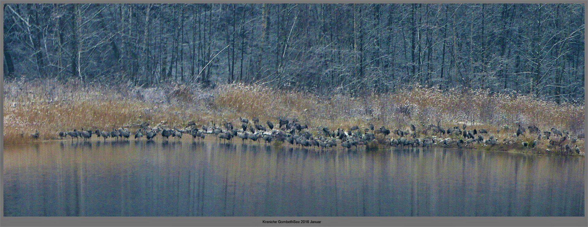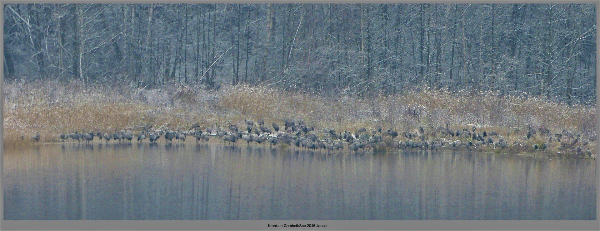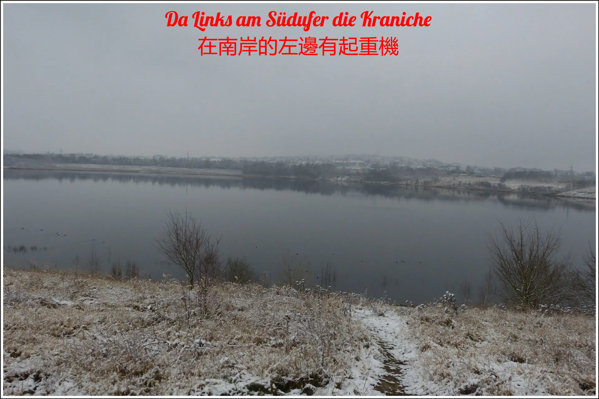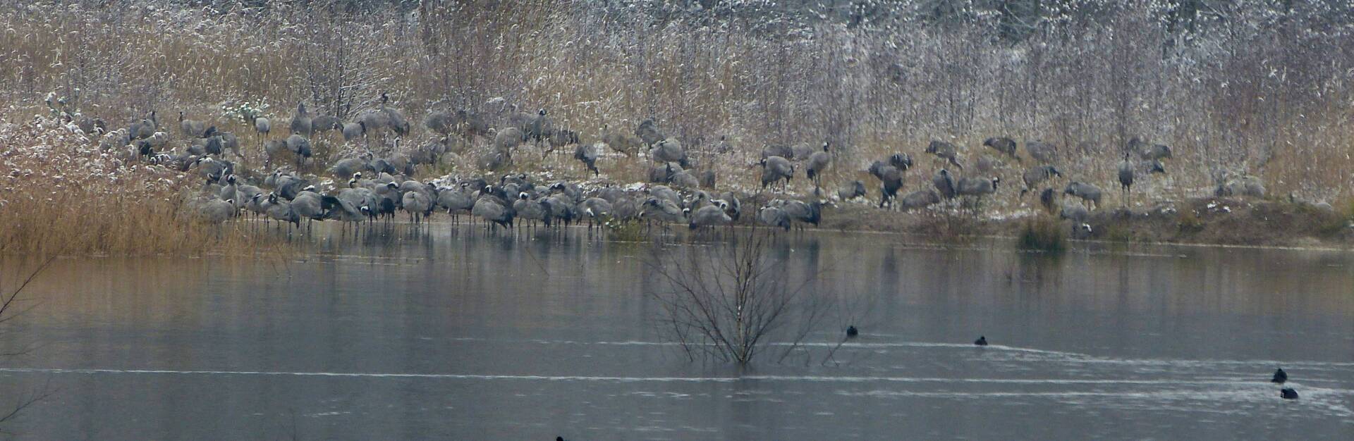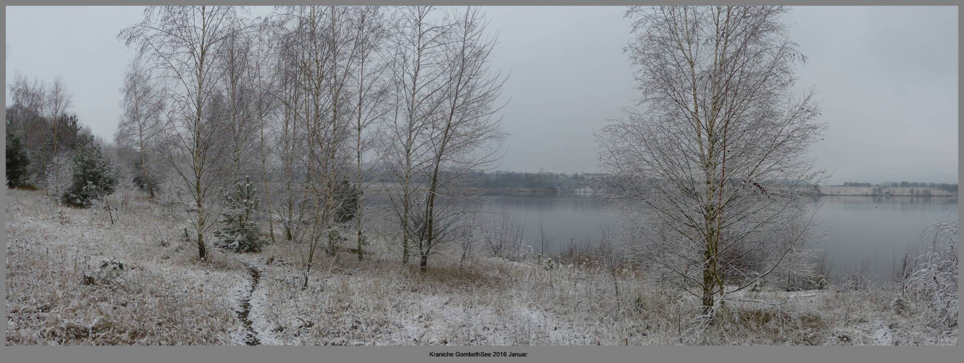 Und diesen Weg musste ich hinunter schlendern von der Ostufer Seite mit Blick auf das Westufer, um zum wachsenden Gombeth See zu kommen, um einen besseren Blick auf die Kraniche zu bekommen, die irgendwo dahinten, links, unten, am SüdUfer waren, und ihre Gesänge nun schon lauter schallten. Es hörte sich nach sehr vielen Kranichen an ein guter Chor für Bachs Nachweihnachtsoratorium.