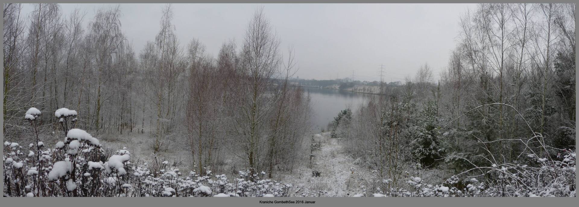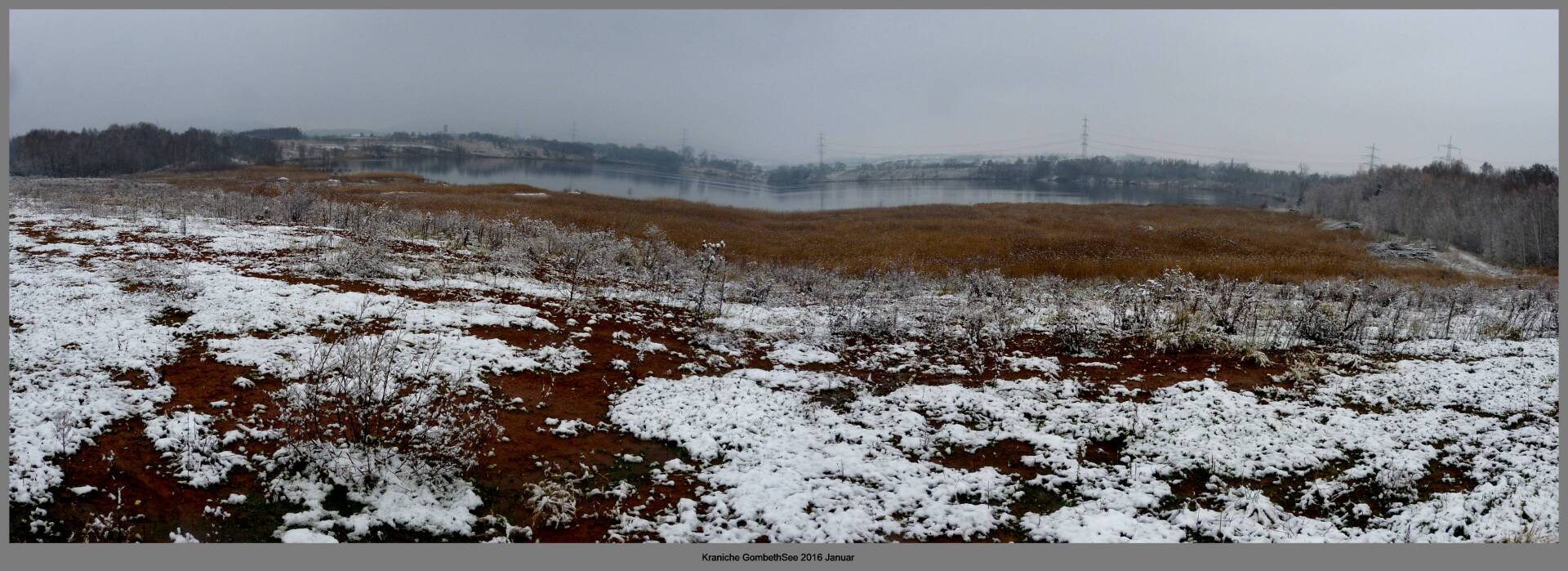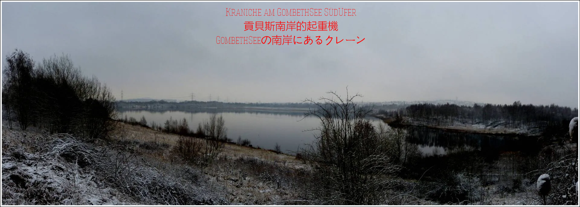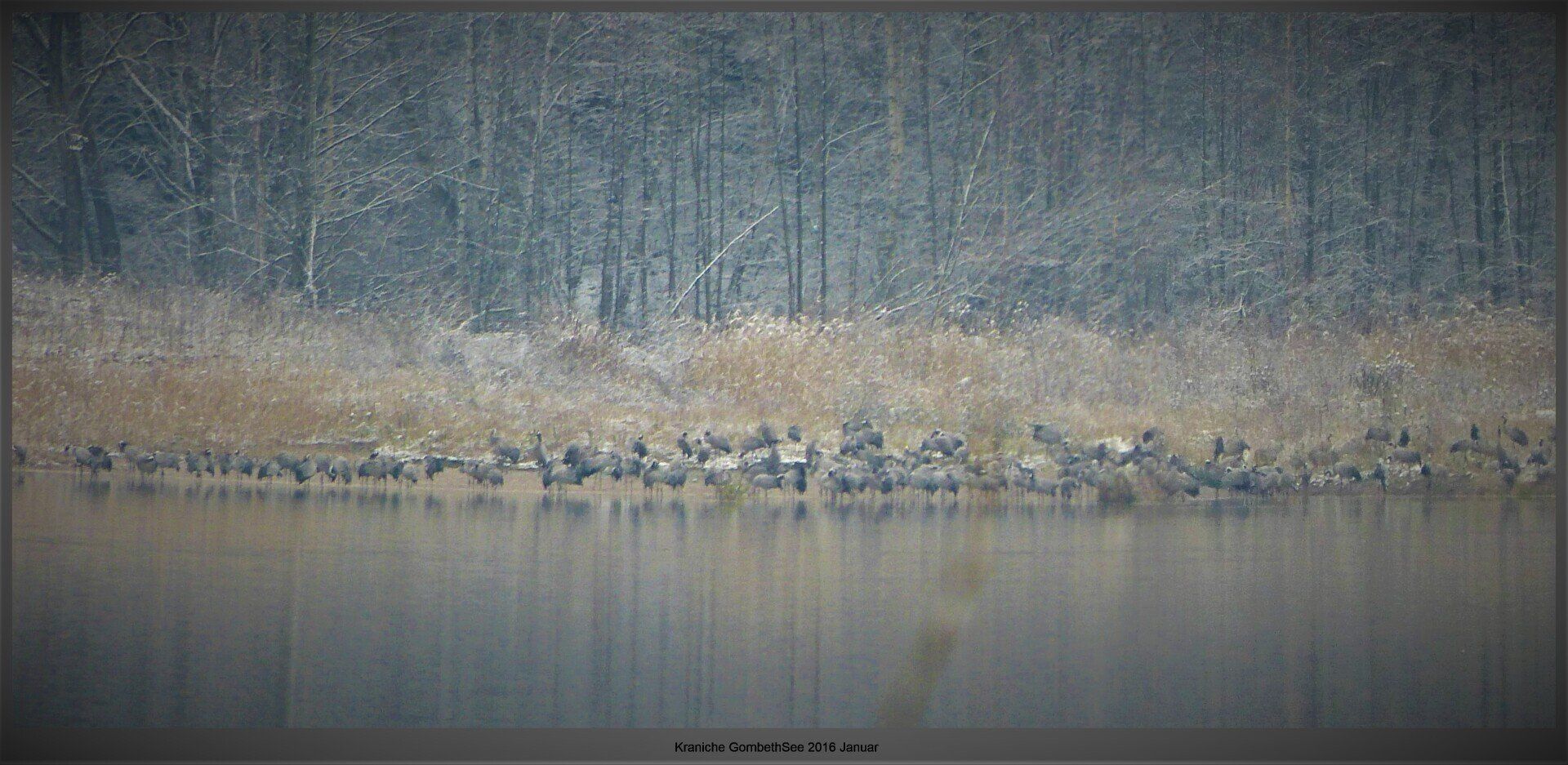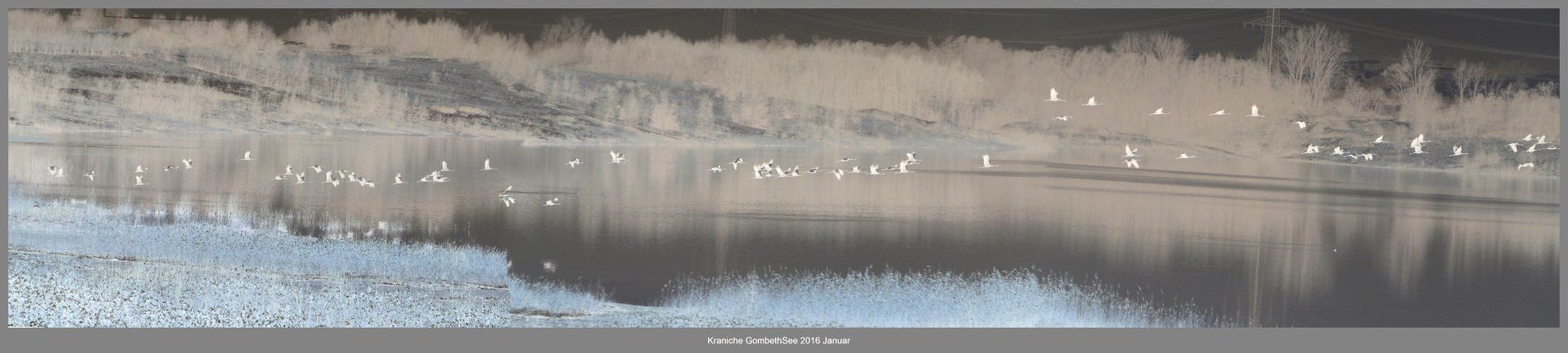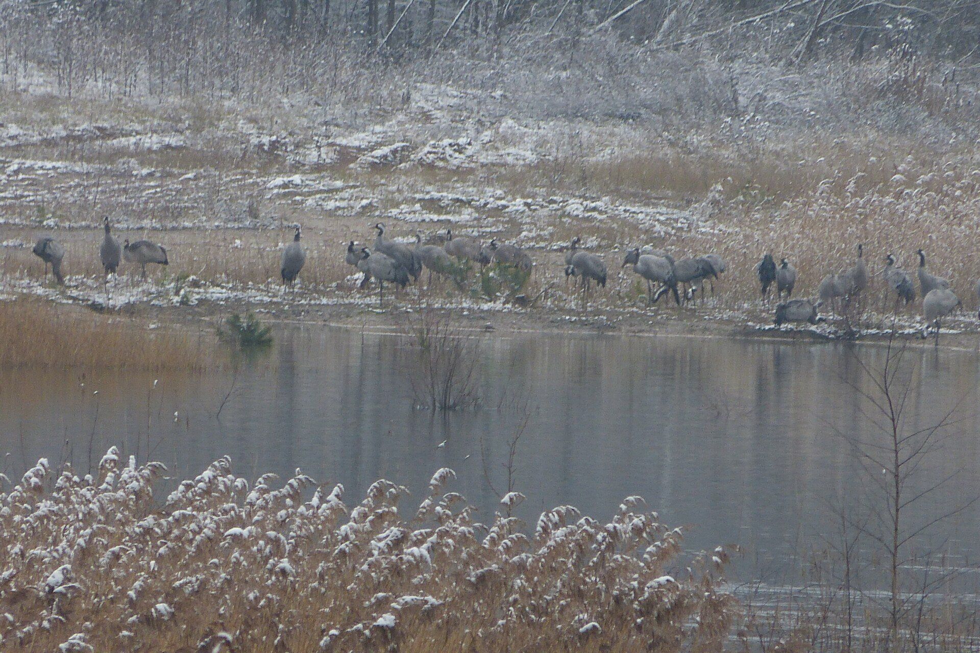 Und diesen Weg musste ich hinunter schlendern von der Ostufer Seite mit Blick auf das Westufer, um zum wachsenden Gombeth See zu kommen, um einen besseren Blick auf die Kraniche zu bekommen, die irgendwo dahinten, links, unten, am SüdUfer waren, und ihre Gesänge nun schon lauter schallten. Es hörte sich nach sehr vielen Kranichen an ein guter Chor für Bachs Nachweihnachtsoratorium.