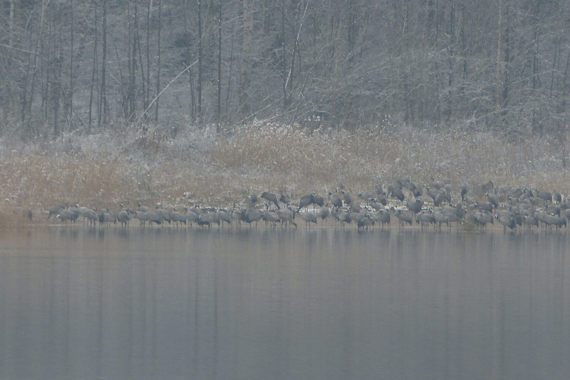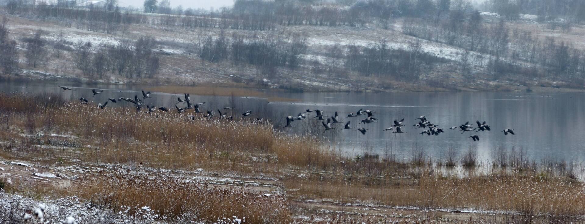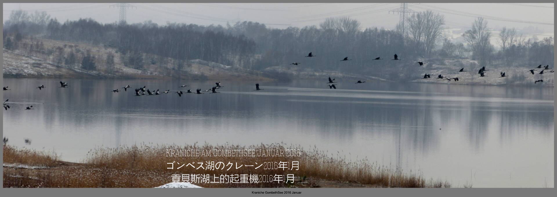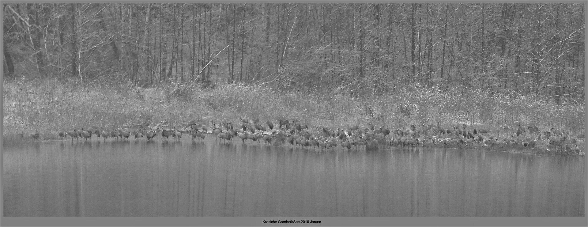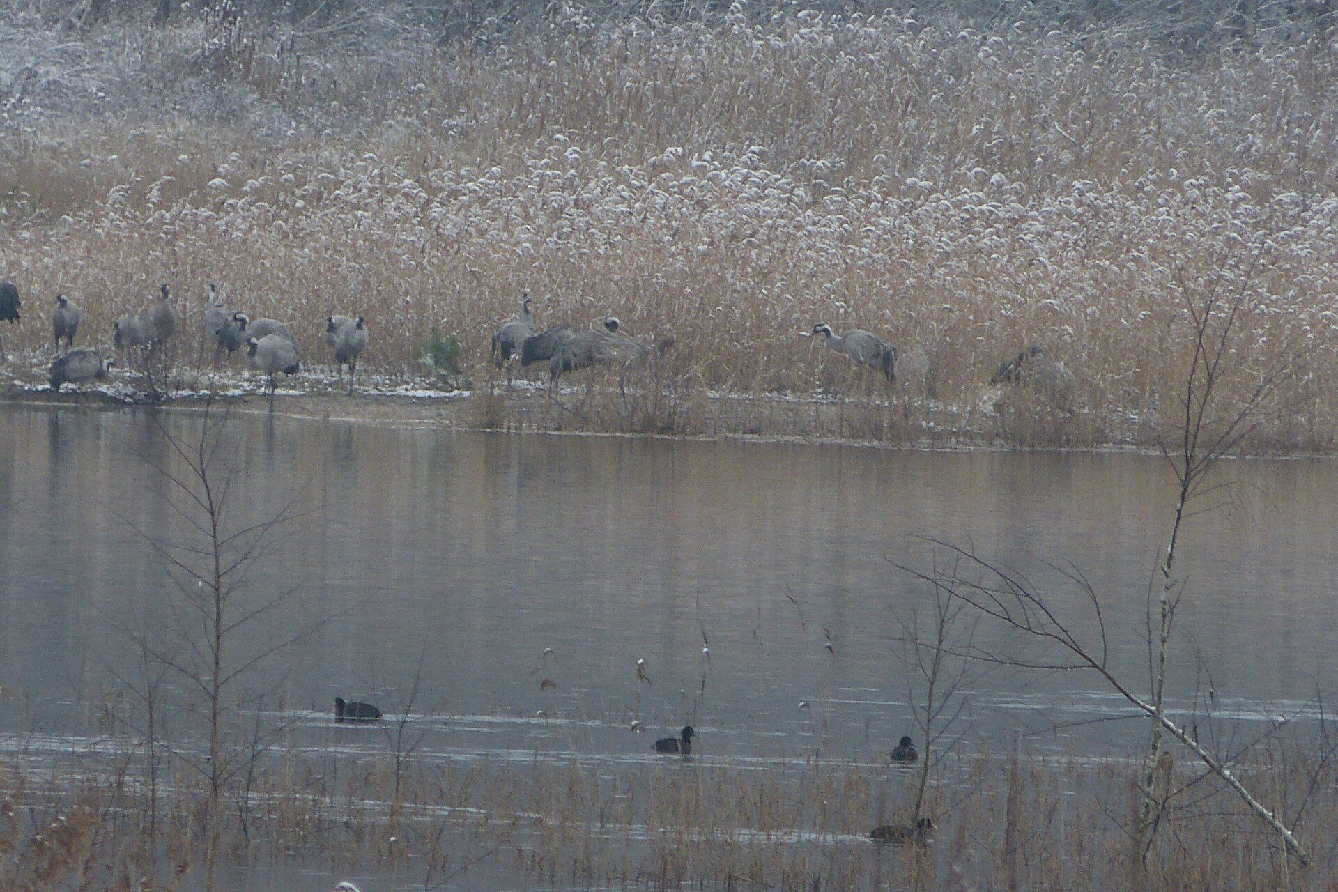 Und diesen Weg musste ich hinunter schlendern von der Ostufer Seite mit Blick auf das Westufer, um zum wachsenden Gombeth See zu kommen, um einen besseren Blick auf die Kraniche zu bekommen, die irgendwo dahinten, links, unten, am SüdUfer waren, und ihre Gesänge nun schon lauter schallten. Es hörte sich nach sehr vielen Kranichen an ein guter Chor für Bachs Nachweihnachtsoratorium.