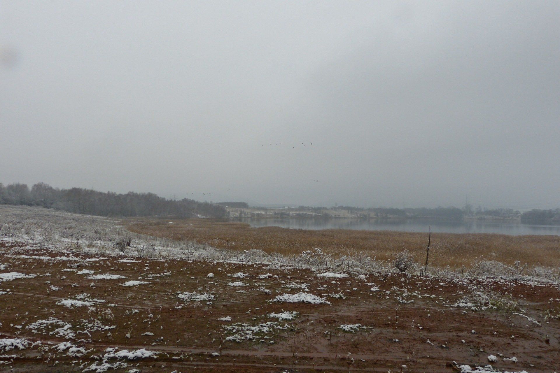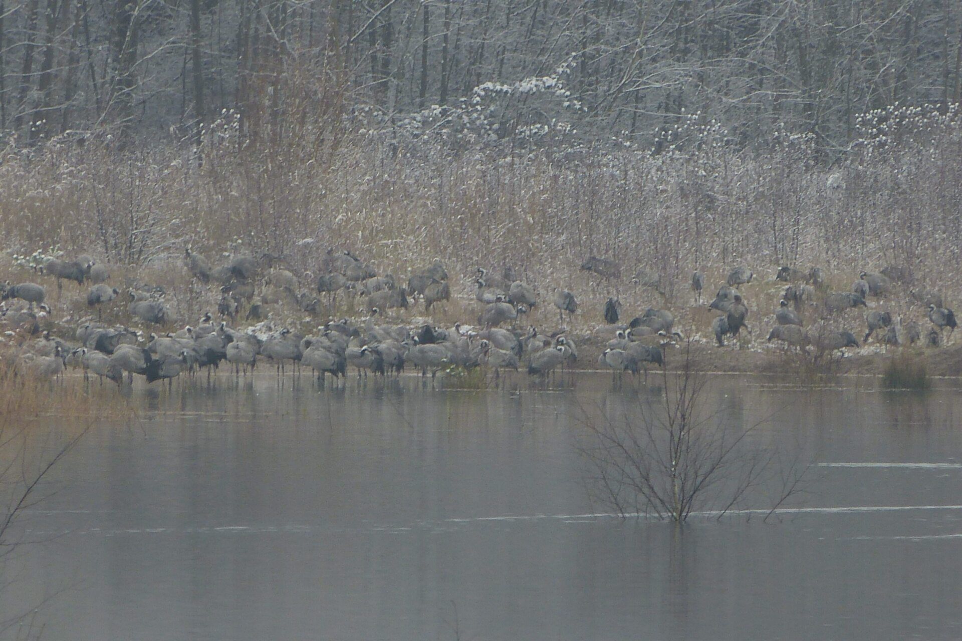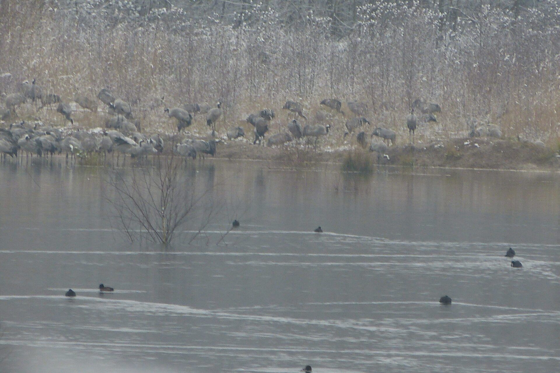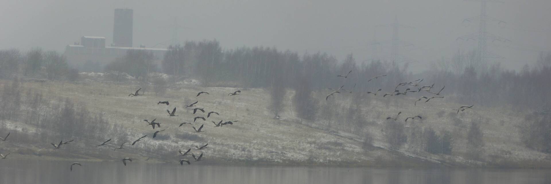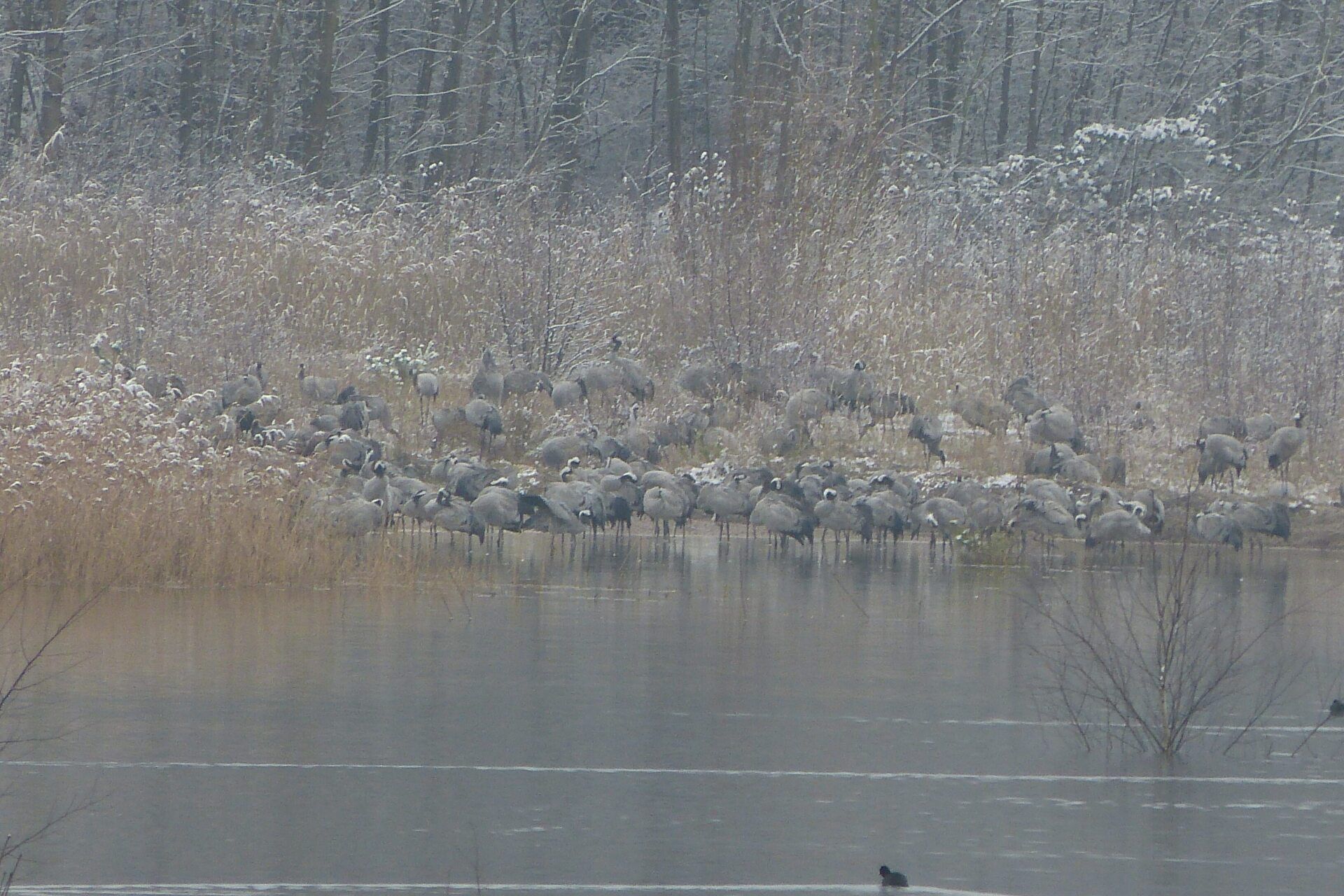 Und diesen Weg musste ich hinunter schlendern von der Ostufer Seite mit Blick auf das Westufer, um zum wachsenden Gombeth See zu kommen, um einen besseren Blick auf die Kraniche zu bekommen, die irgendwo dahinten, links, unten, am SüdUfer waren, und ihre Gesänge nun schon lauter schallten. Es hörte sich nach sehr vielen Kranichen an ein guter Chor für Bachs Nachweihnachtsoratorium.