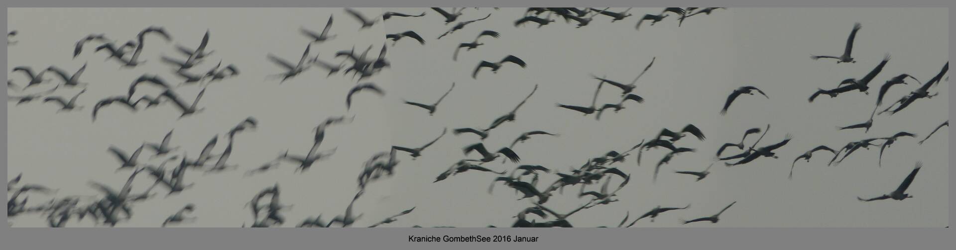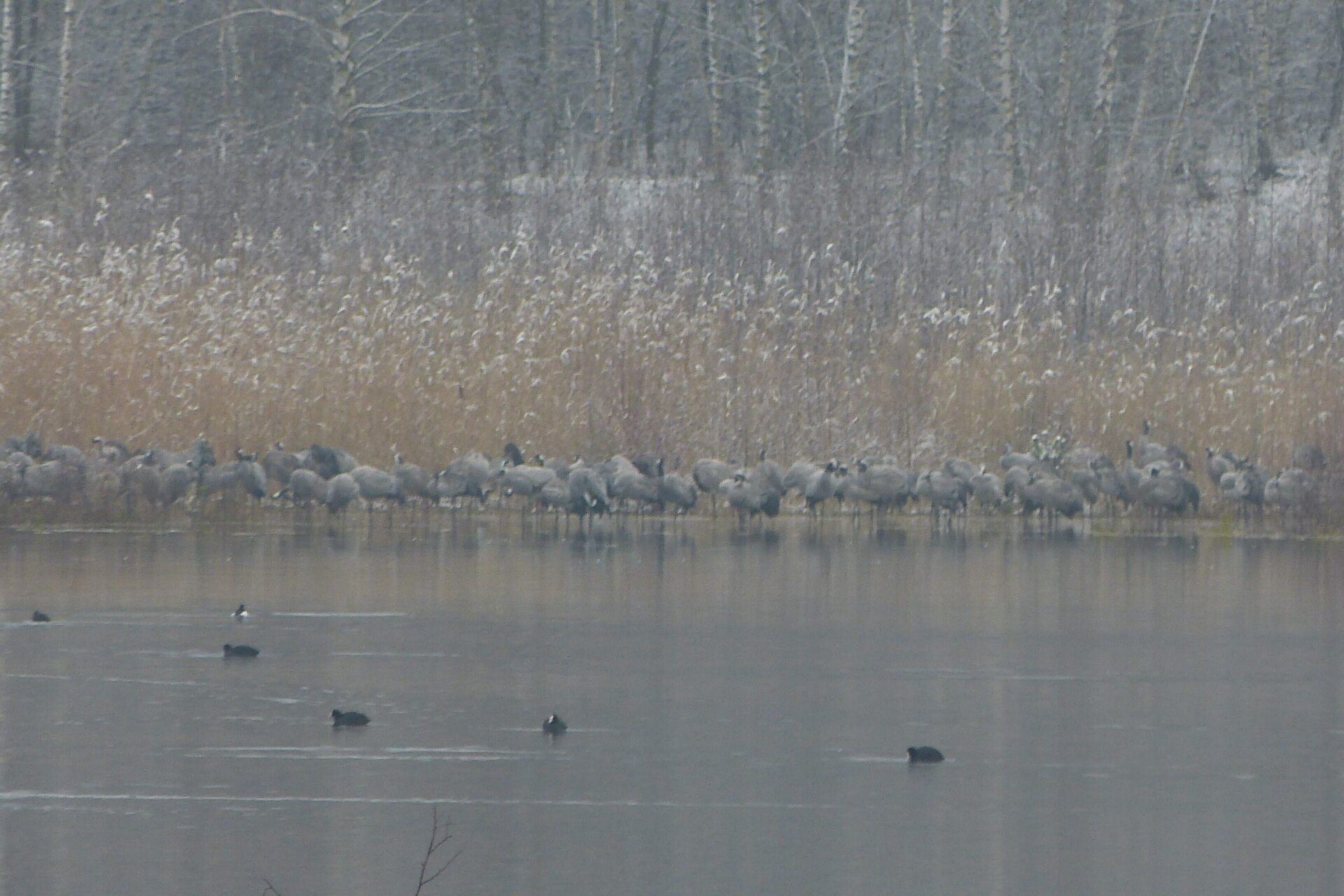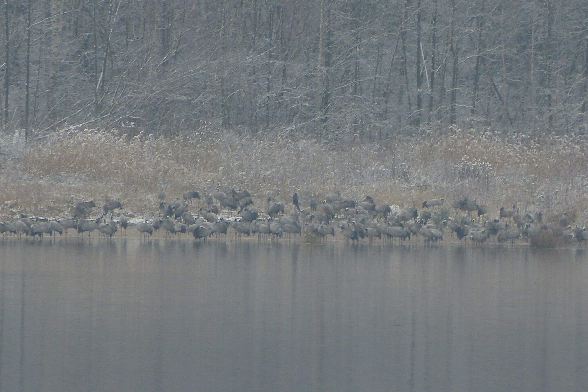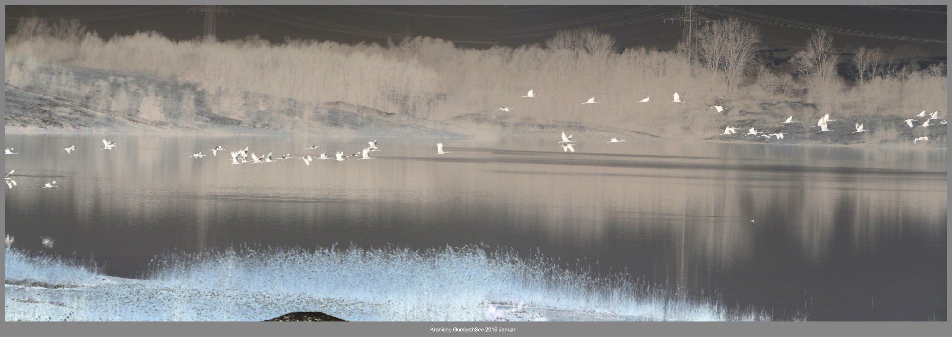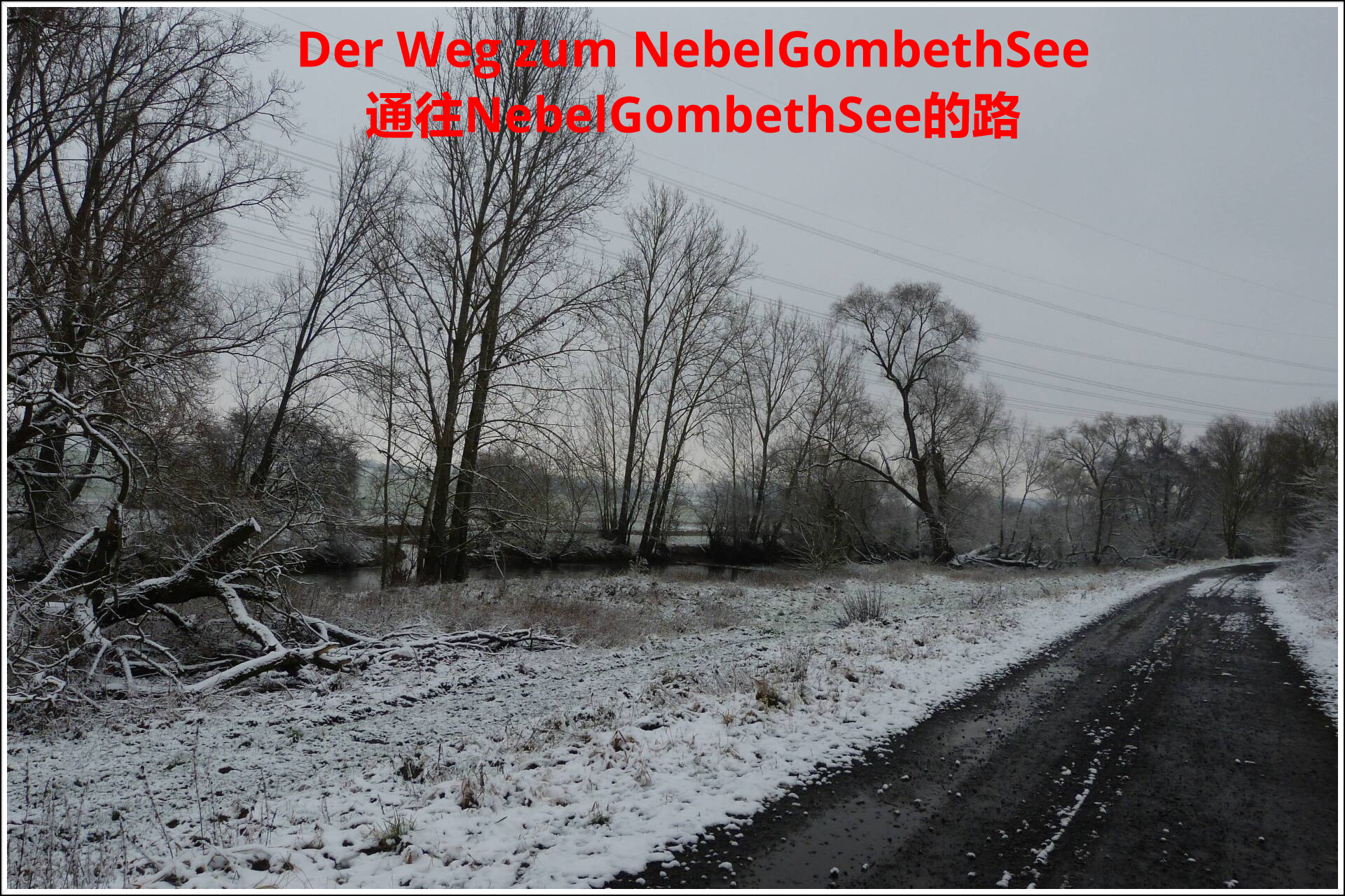 Und diesen Weg musste ich hinunter schlendern von der Ostufer Seite mit Blick auf das Westufer, um zum wachsenden Gombeth See zu kommen, um einen besseren Blick auf die Kraniche zu bekommen, die irgendwo dahinten, links, unten, am SüdUfer waren, und ihre Gesänge nun schon lauter schallten. Es hörte sich nach sehr vielen Kranichen an ein guter Chor für Bachs Nachweihnachtsoratorium.