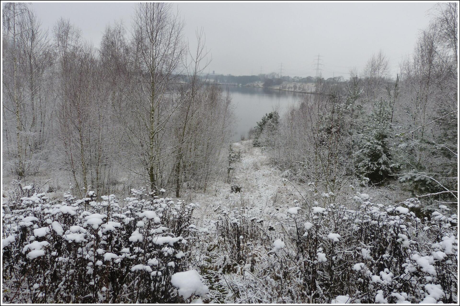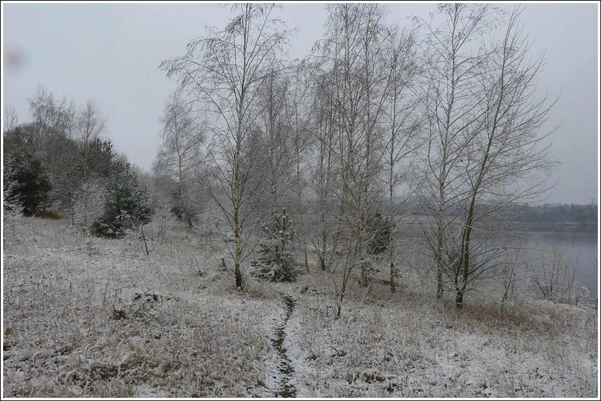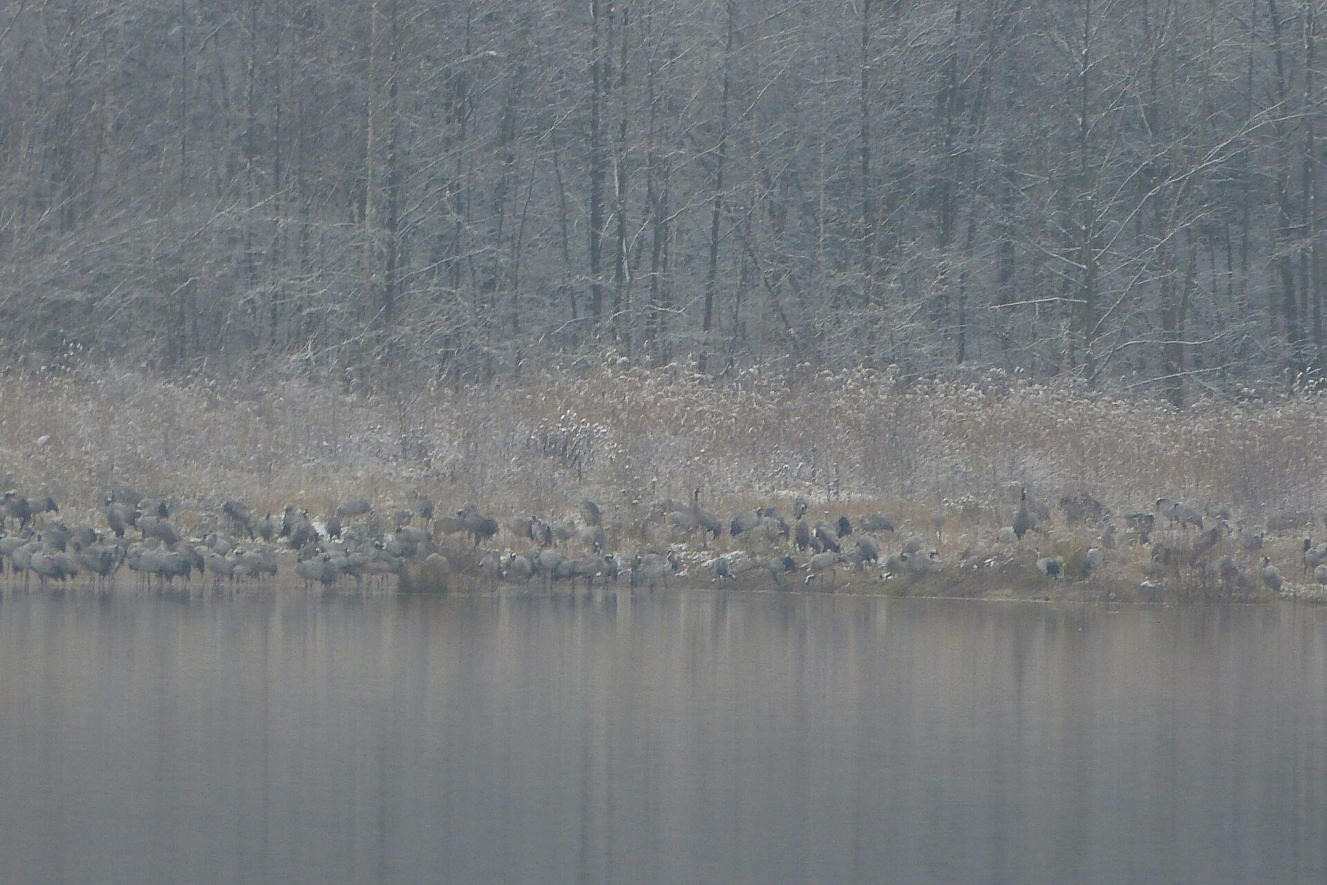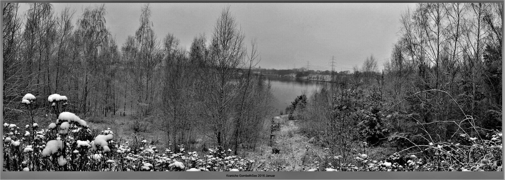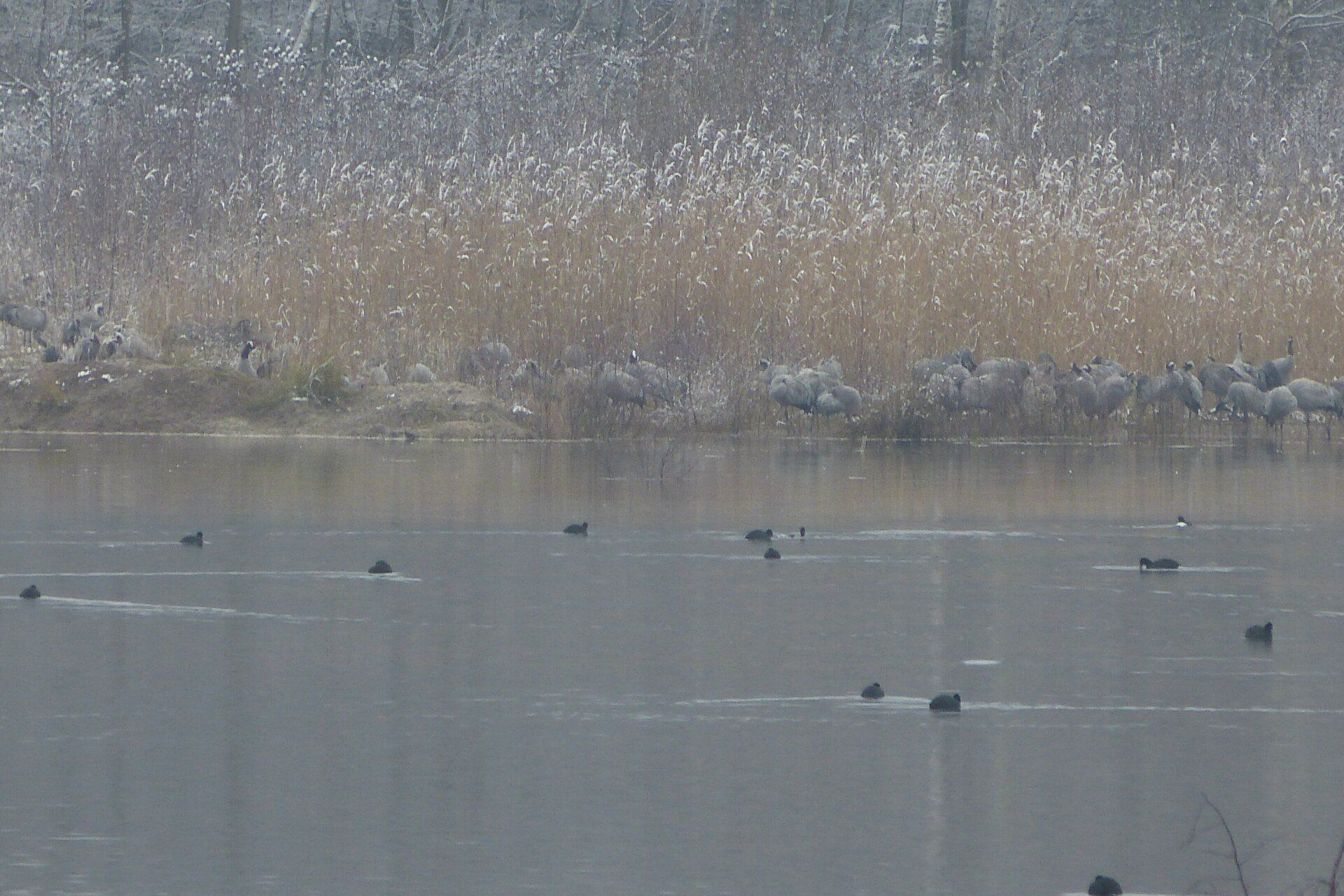 Und diesen Weg musste ich hinunter schlendern von der Ostufer Seite mit Blick auf das Westufer, um zum wachsenden Gombeth See zu kommen, um einen besseren Blick auf die Kraniche zu bekommen, die irgendwo dahinten, links, unten, am SüdUfer waren, und ihre Gesänge nun schon lauter schallten. Es hörte sich nach sehr vielen Kranichen an ein guter Chor für Bachs Nachweihnachtsoratorium.
