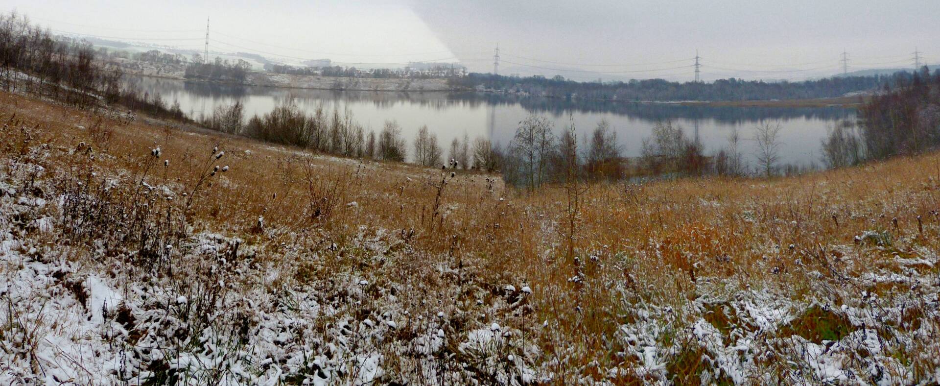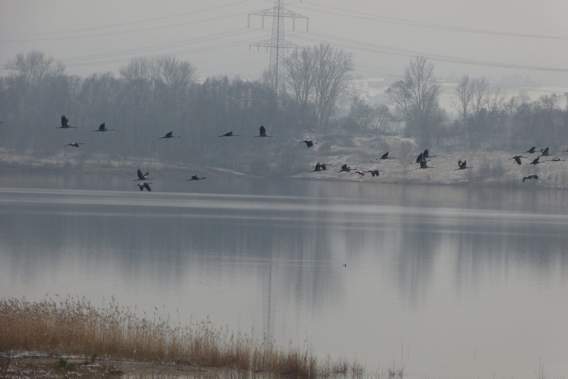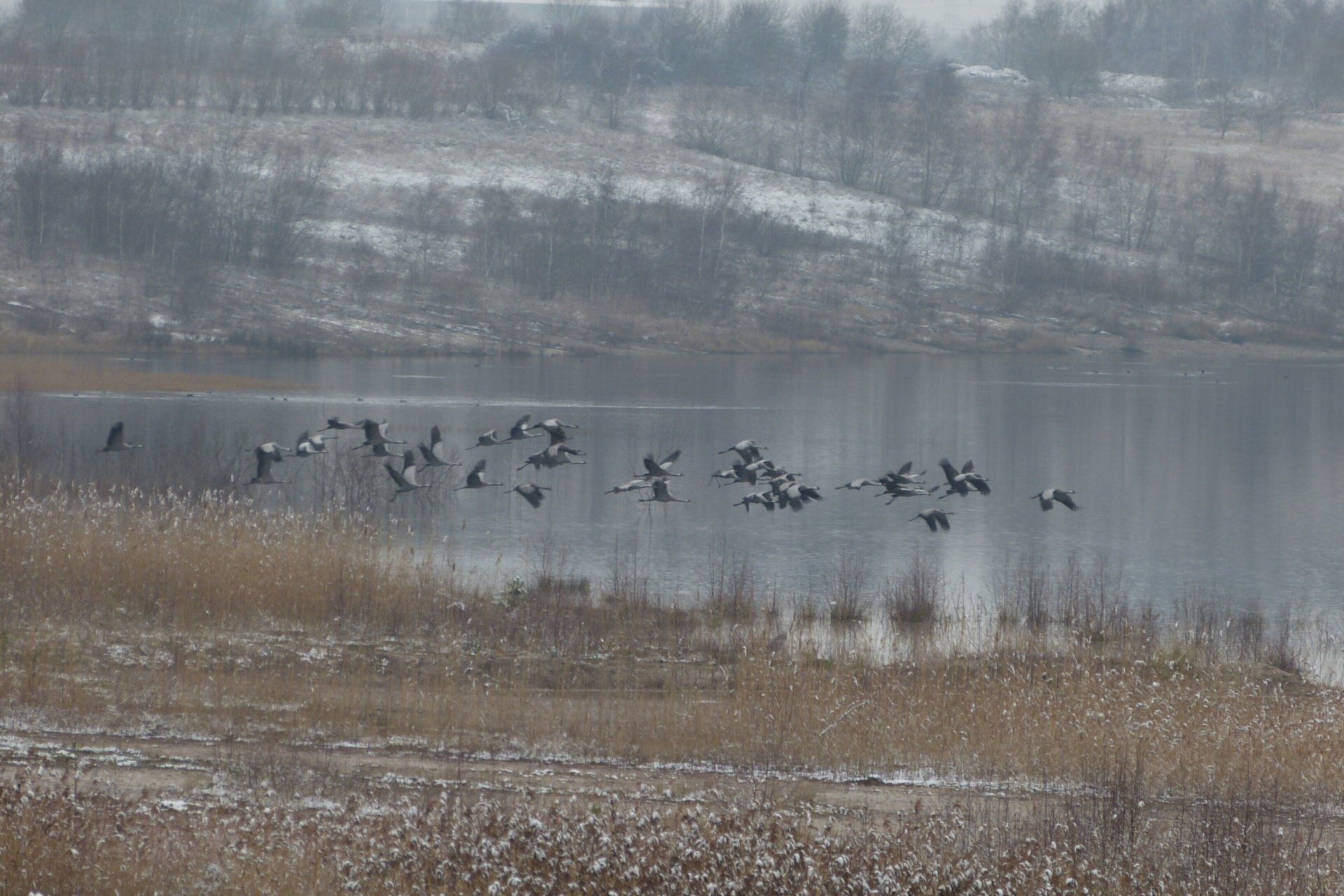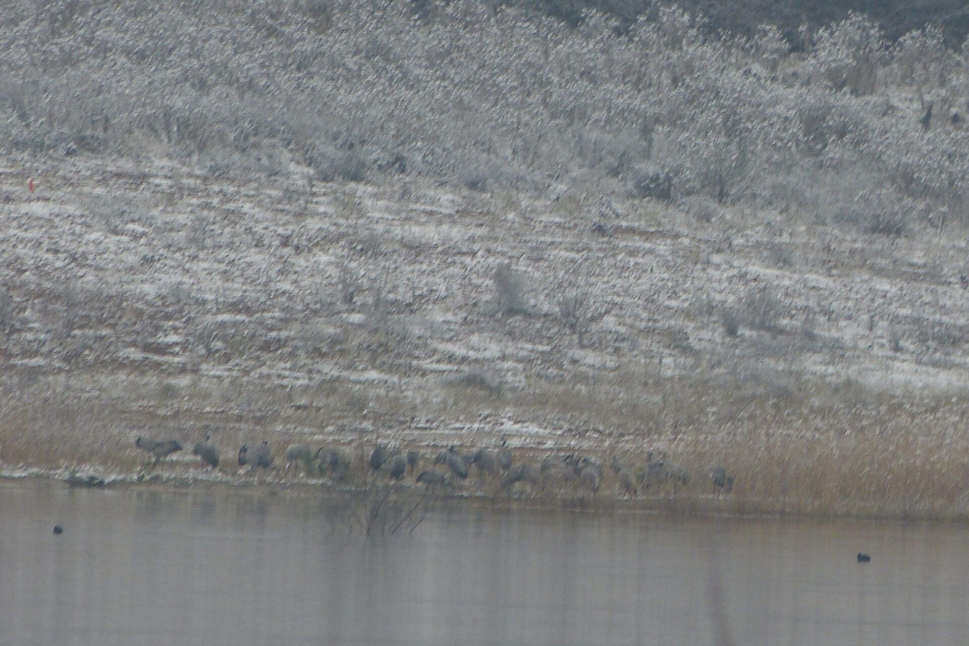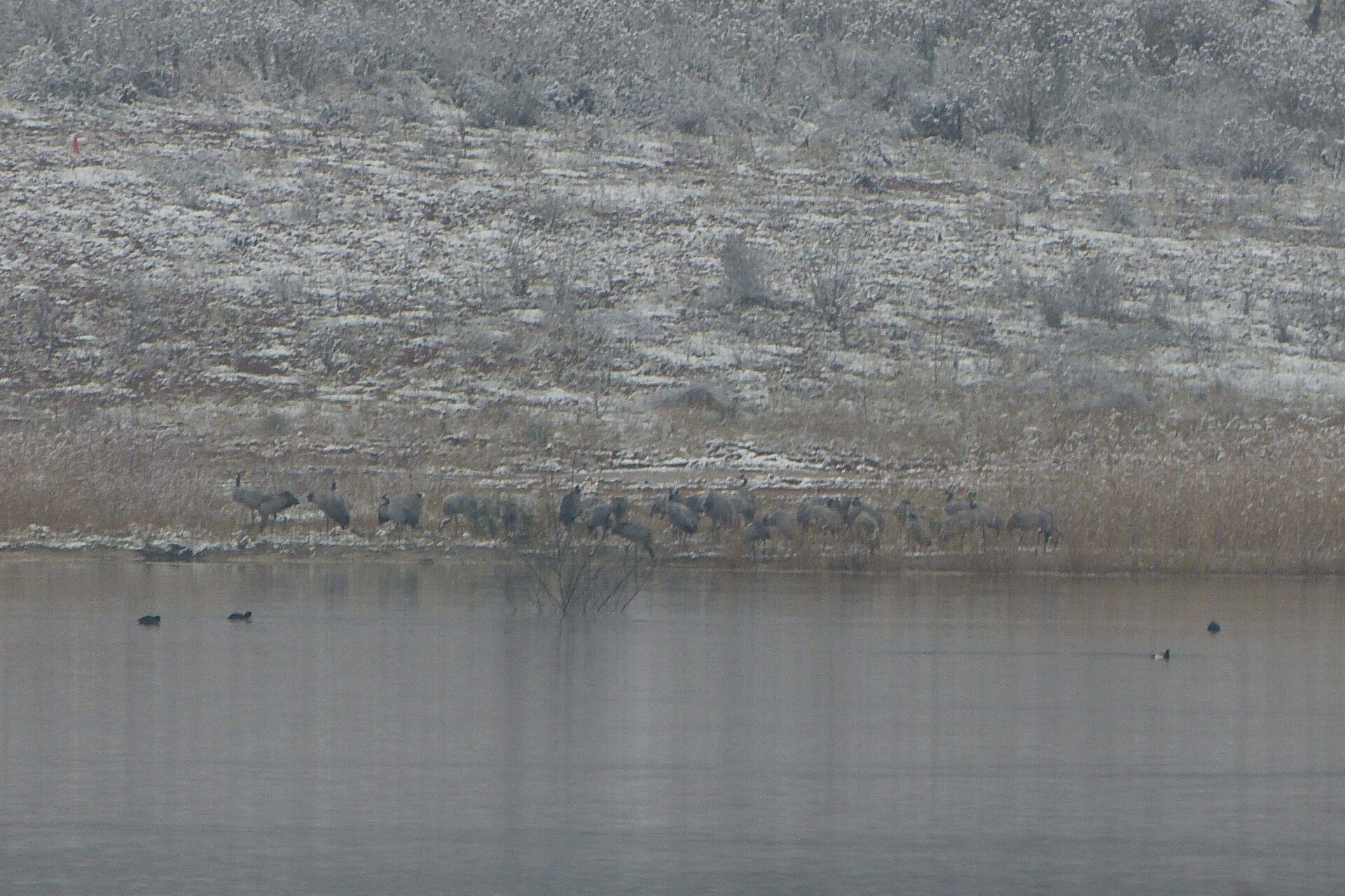 Und diesen Weg musste ich hinunter schlendern von der Ostufer Seite mit Blick auf das Westufer, um zum wachsenden Gombeth See zu kommen, um einen besseren Blick auf die Kraniche zu bekommen, die irgendwo dahinten, links, unten, am SüdUfer waren, und ihre Gesänge nun schon lauter schallten. Es hörte sich nach sehr vielen Kranichen an ein guter Chor für Bachs Nachweihnachtsoratorium.