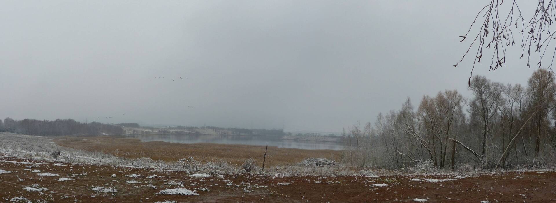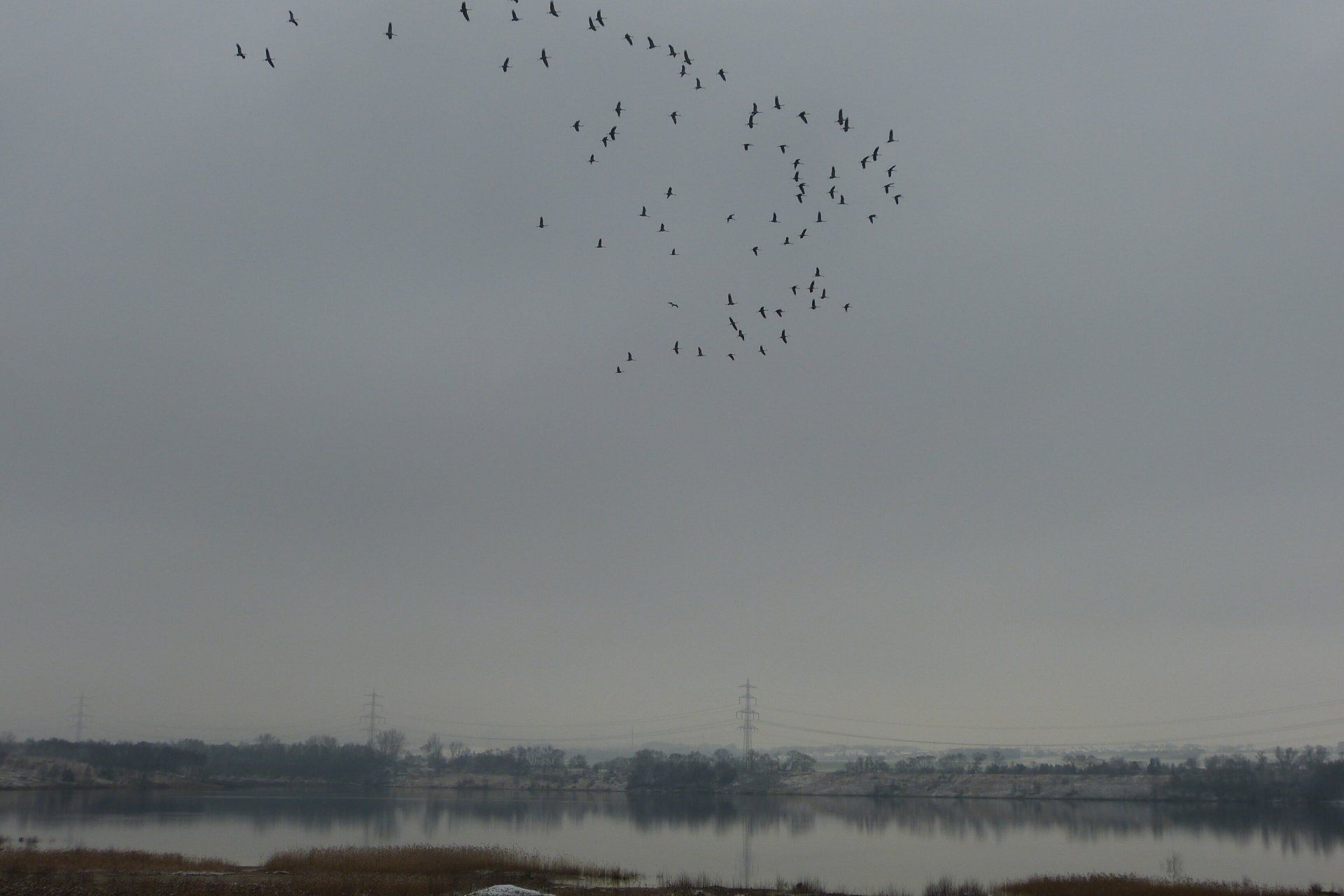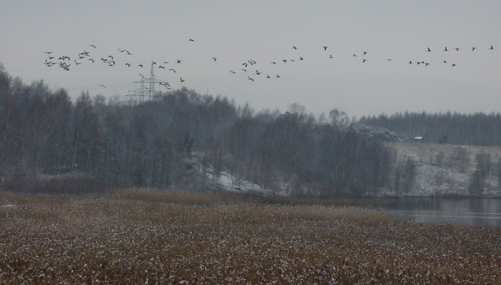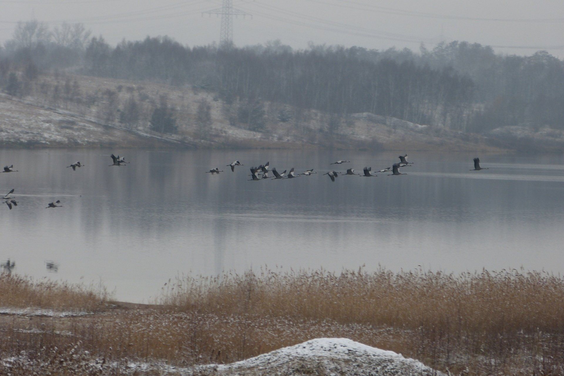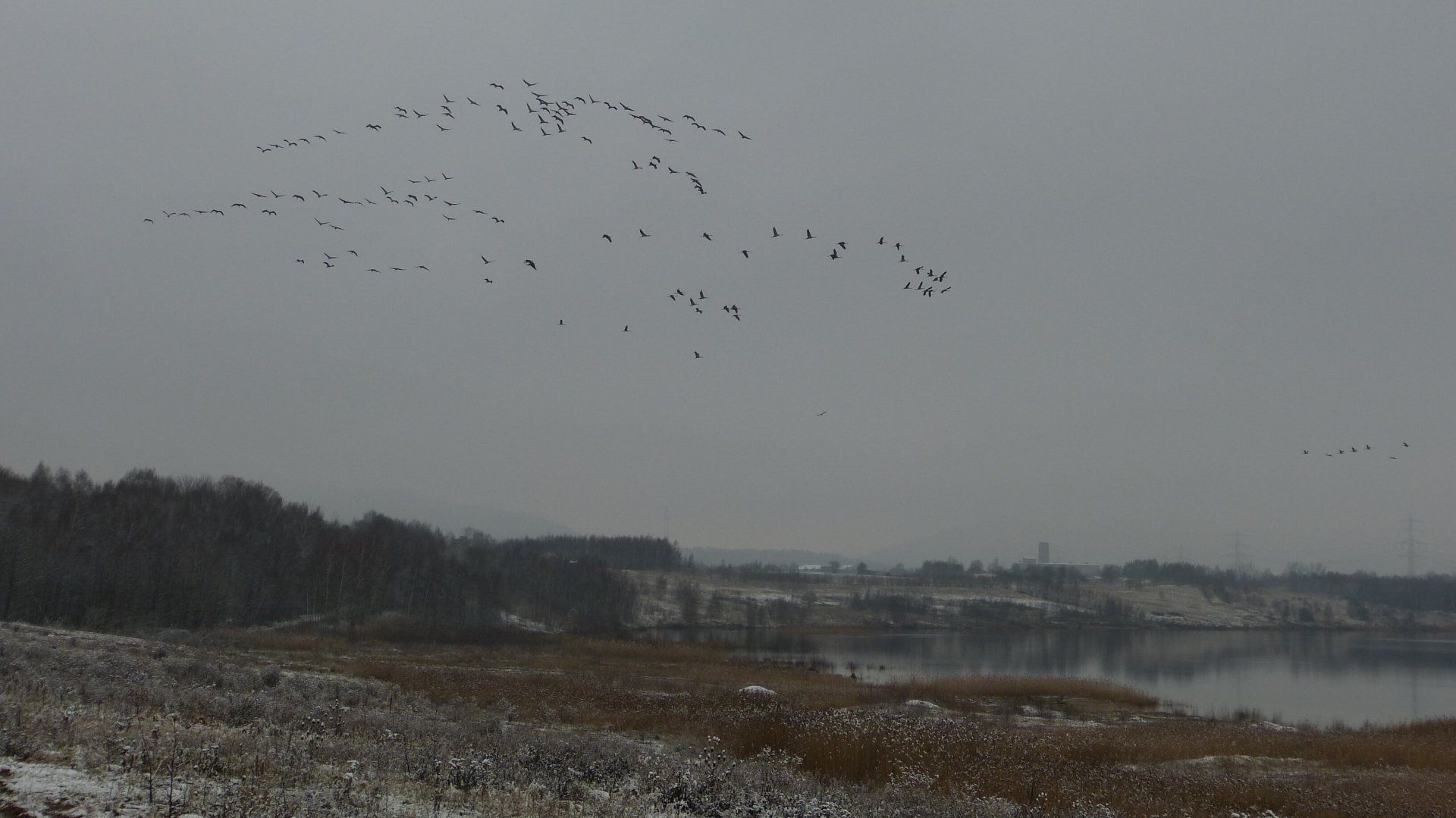 Und diesen Weg musste ich hinunter schlendern von der Ostufer Seite mit Blick auf das Westufer, um zum wachsenden Gombeth See zu kommen, um einen besseren Blick auf die Kraniche zu bekommen, die irgendwo dahinten, links, unten, am SüdUfer waren, und ihre Gesänge nun schon lauter schallten. Es hörte sich nach sehr vielen Kranichen an ein guter Chor für Bachs Nachweihnachtsoratorium.