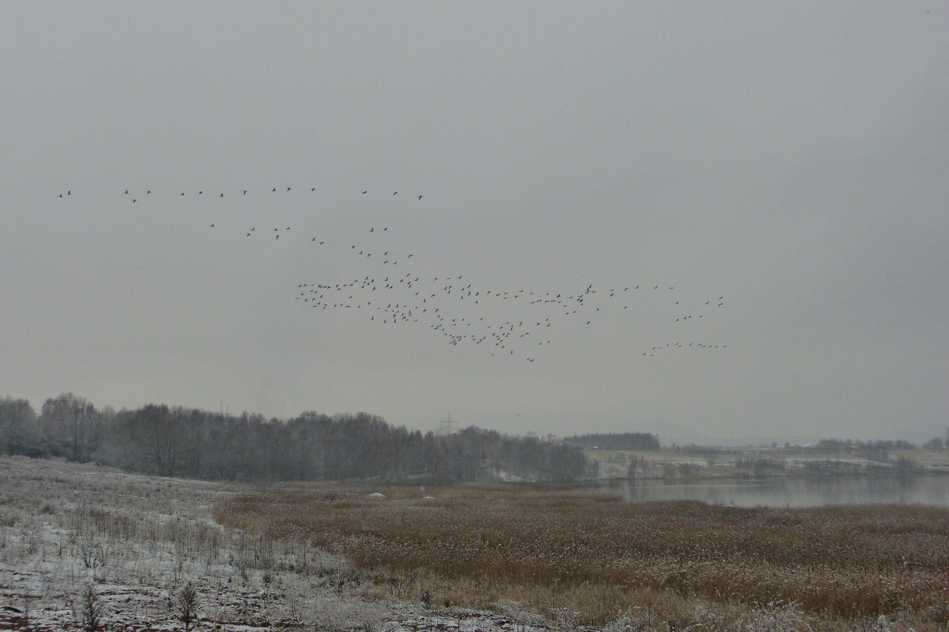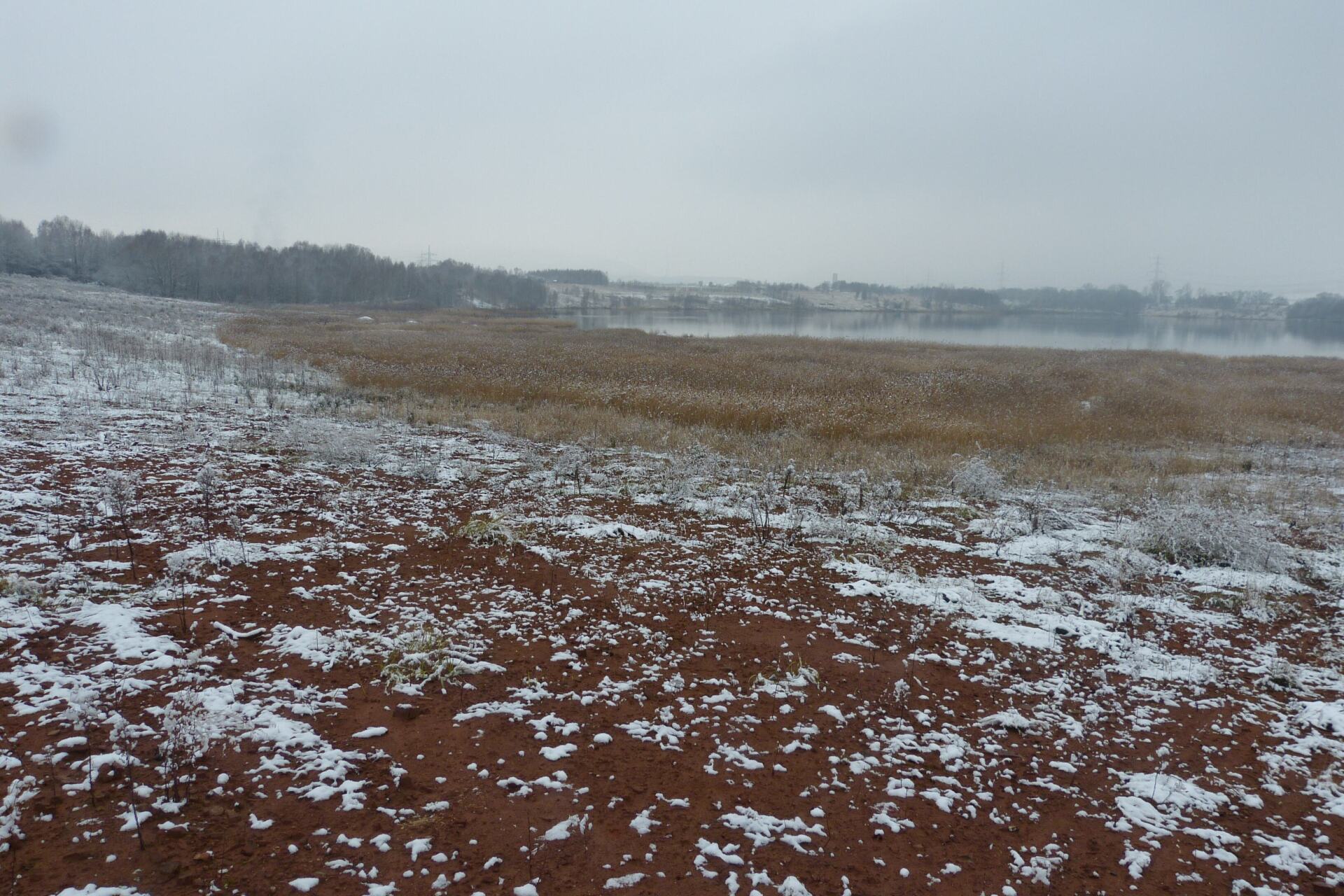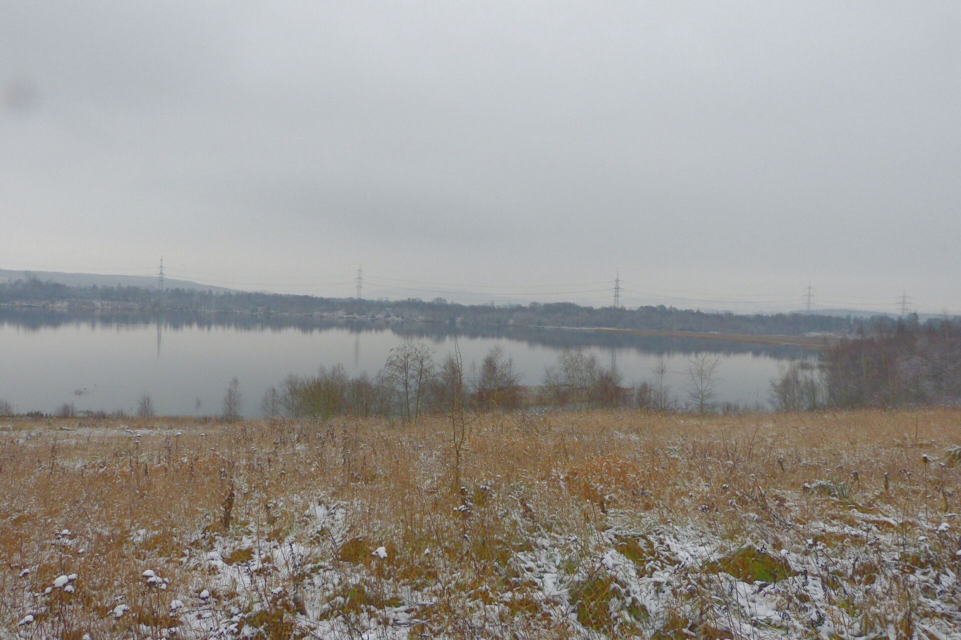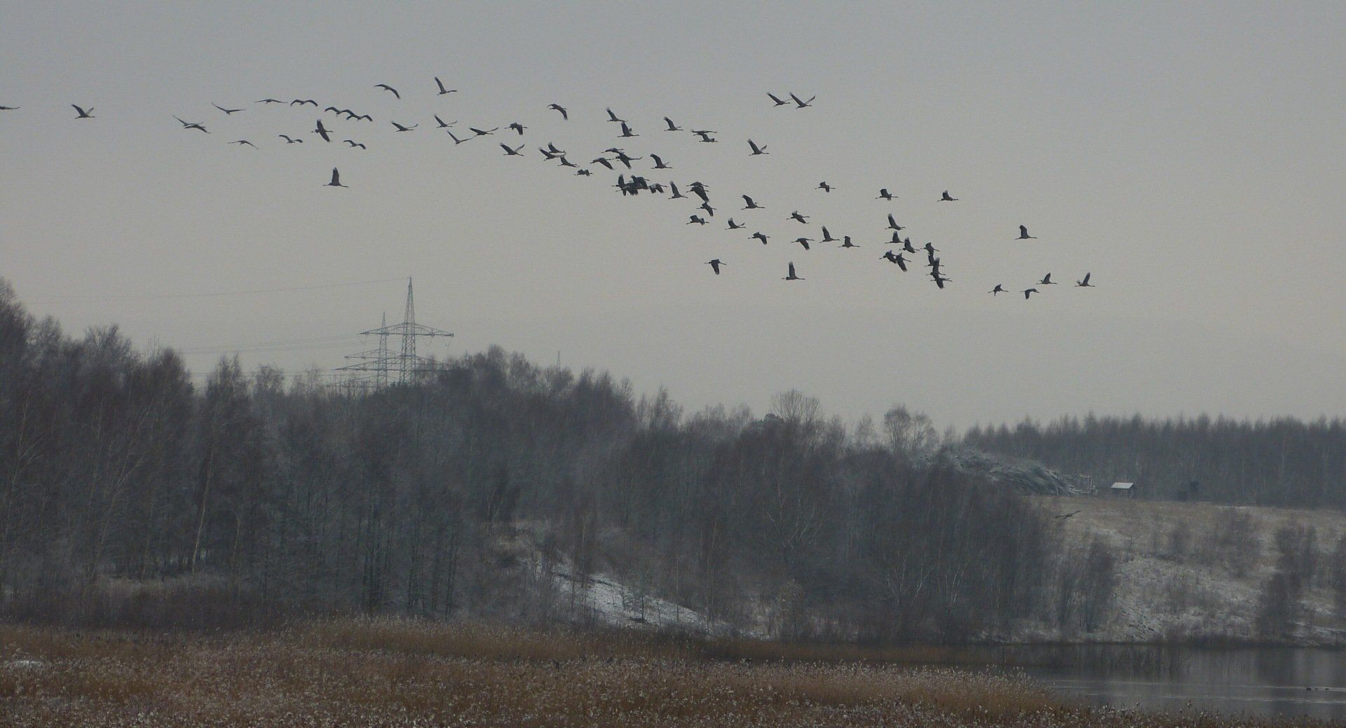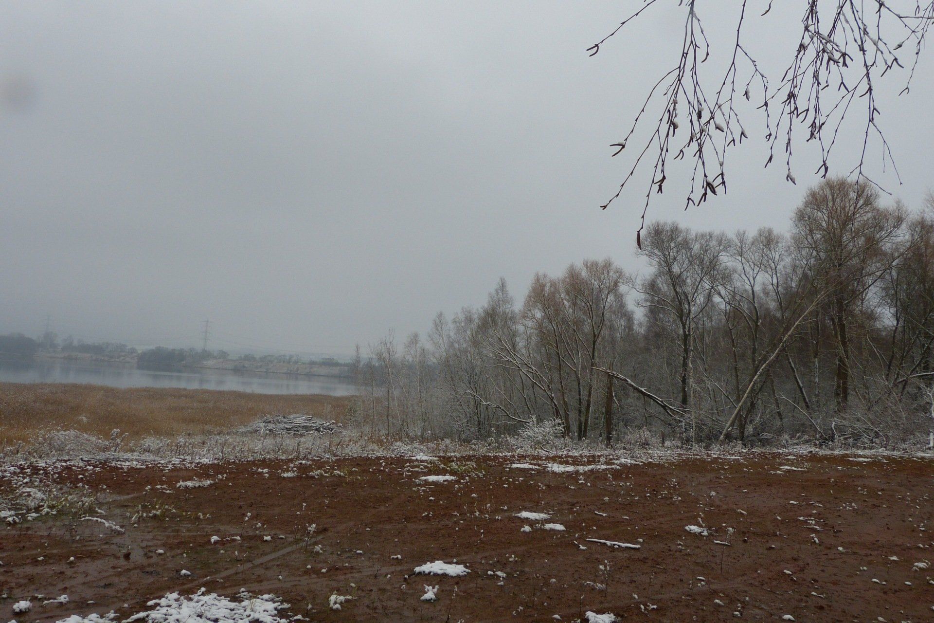Und diesen Weg musste ich hinunter schlendern von der Ostufer Seite mit Blick auf das Westufer, um zum wachsenden Gombeth See zu kommen, um einen besseren Blick auf die Kraniche zu bekommen, die irgendwo dahinten, links, unten, am SüdUfer waren, und ihre Gesänge nun schon lauter schallten. Es hörte sich nach sehr vielen Kranichen an ein guter Chor für Bachs Nachweihnachtsoratorium.