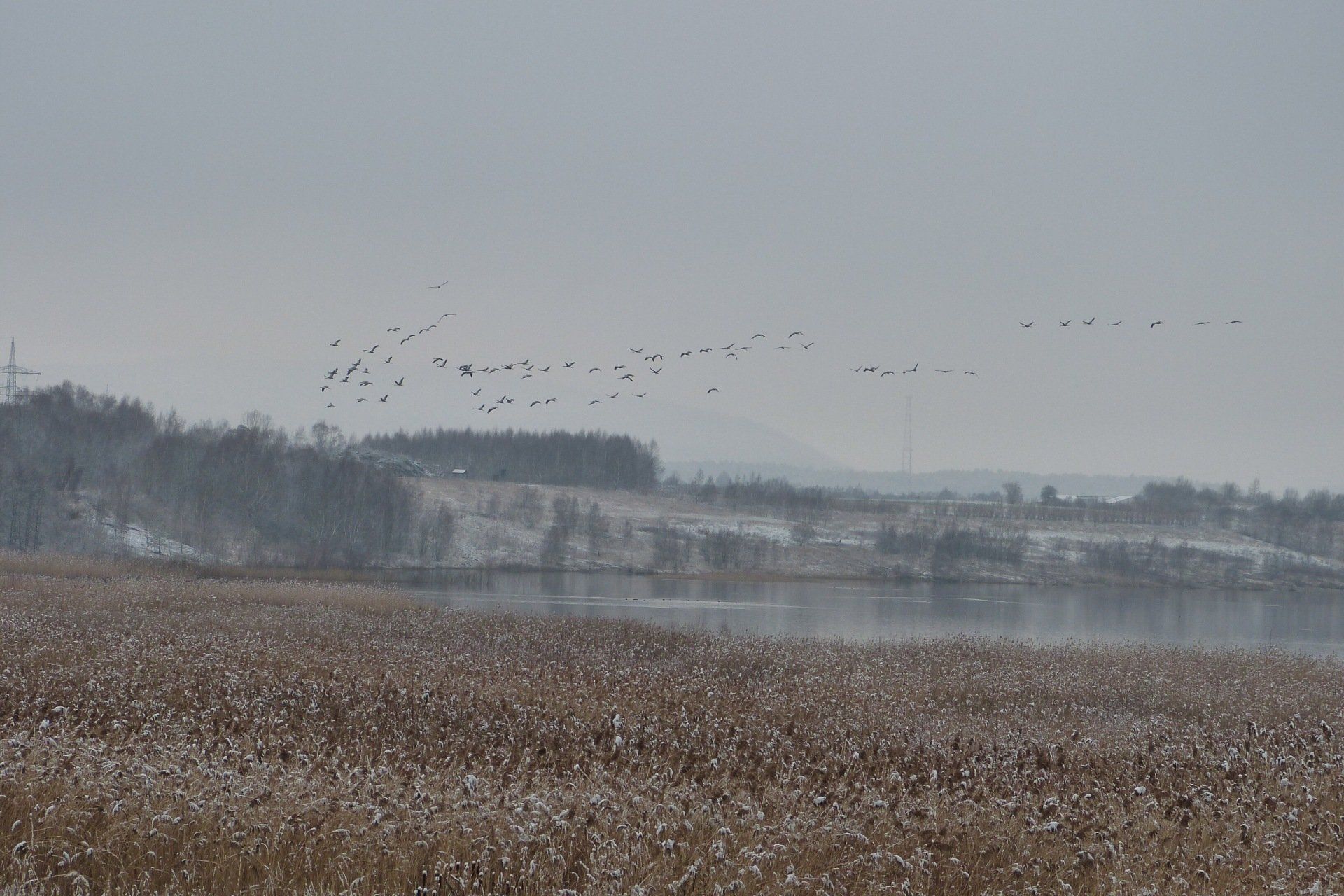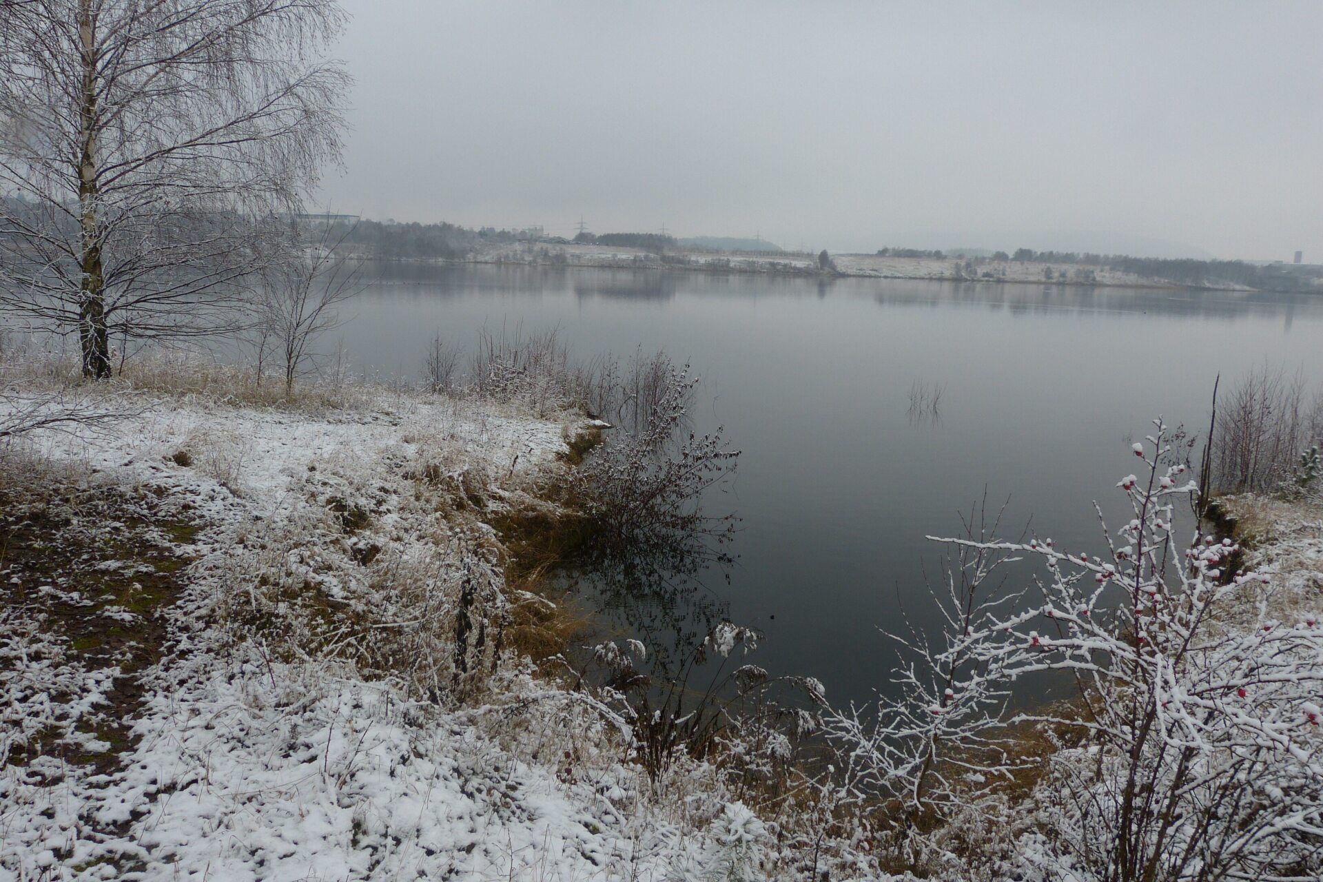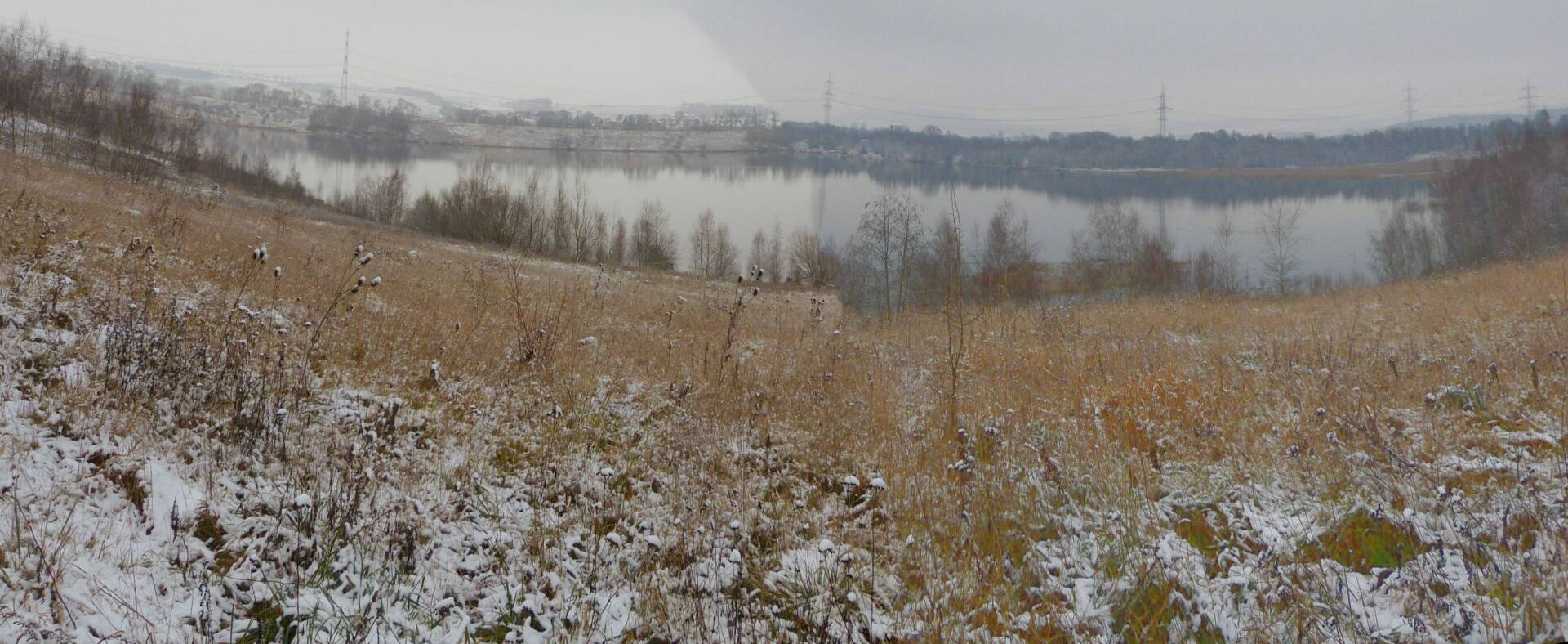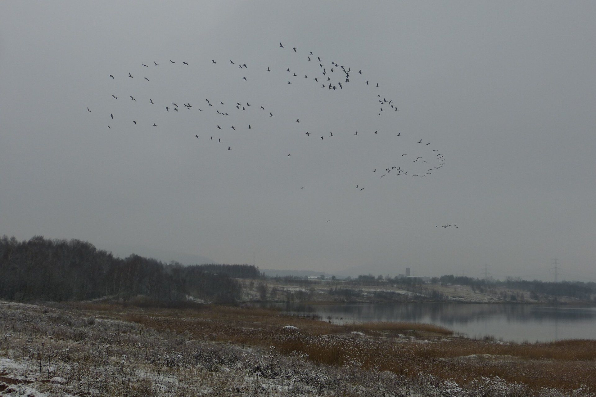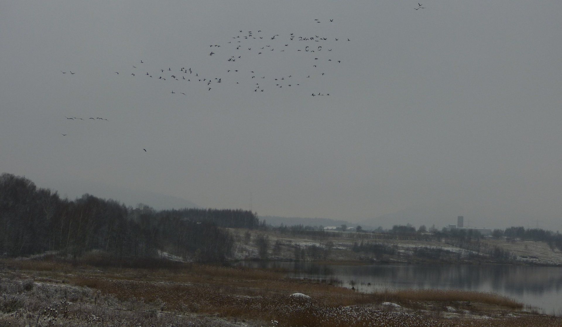 Und diesen Weg musste ich hinunter schlendern von der Ostufer Seite mit Blick auf das Westufer, um zum wachsenden Gombeth See zu kommen, um einen besseren Blick auf die Kraniche zu bekommen, die irgendwo dahinten, links, unten, am SüdUfer waren, und ihre Gesänge nun schon lauter schallten. Es hörte sich nach sehr vielen Kranichen an ein guter Chor für Bachs Nachweihnachtsoratorium.