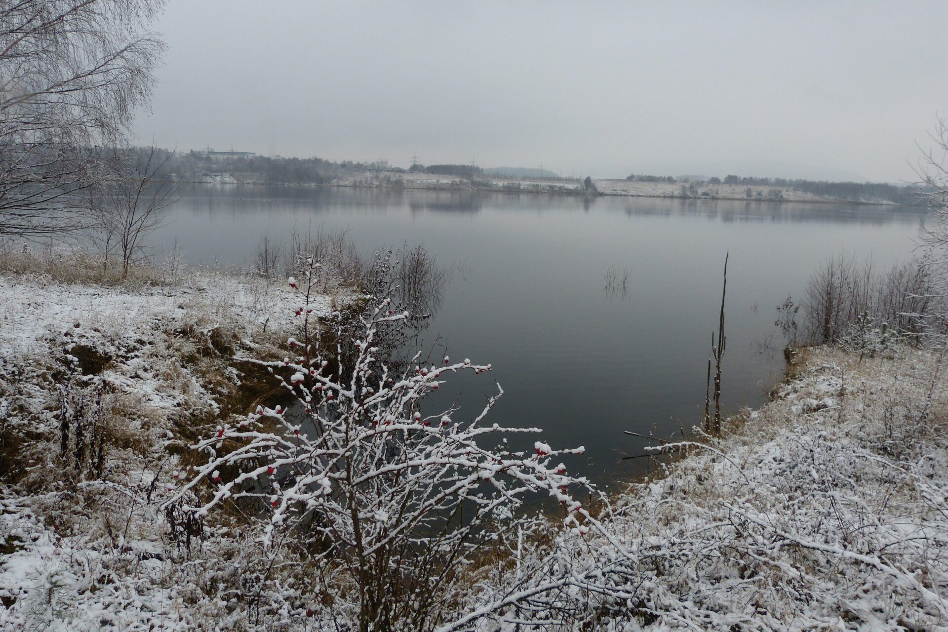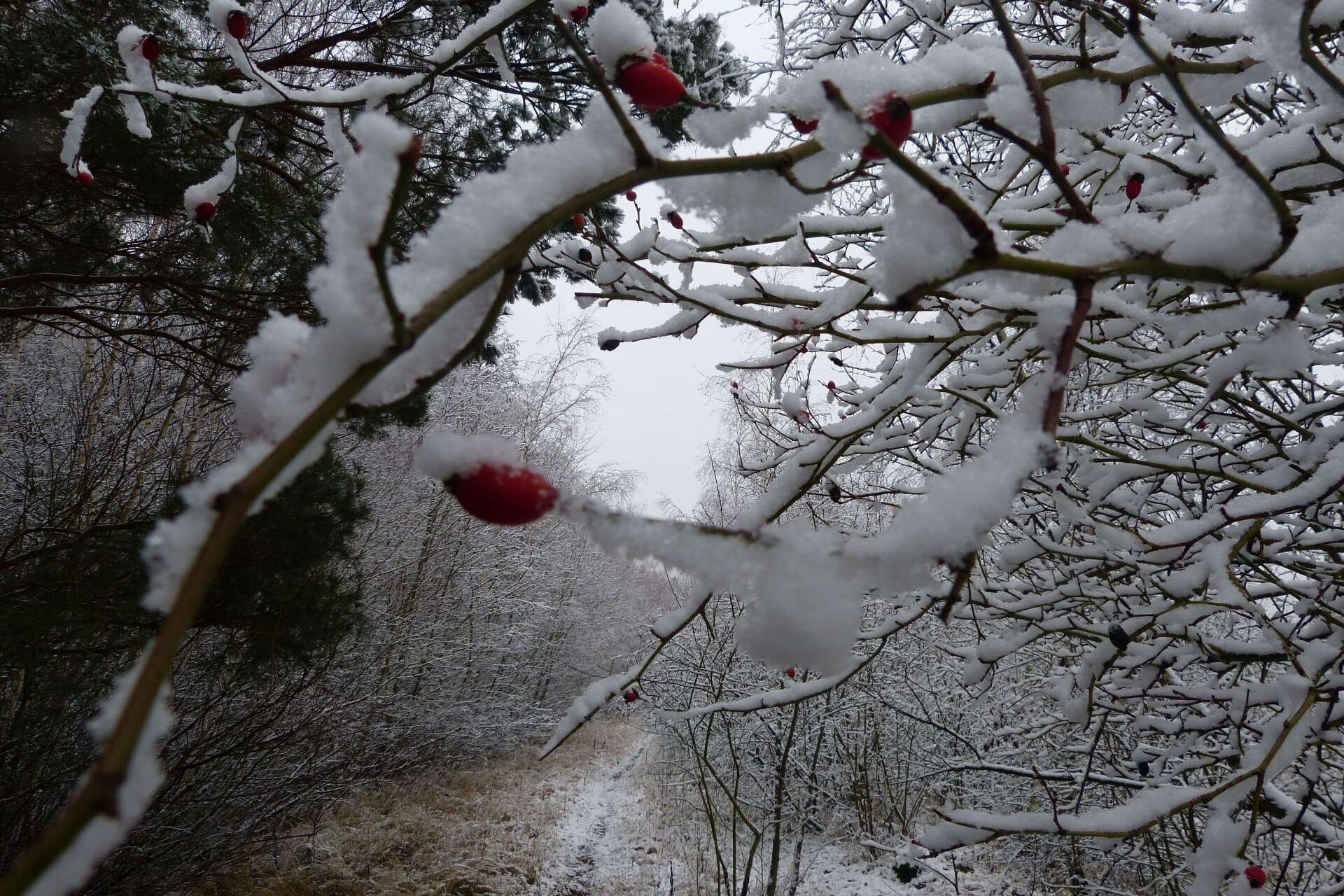 Und für einen Moment sah es so aus oder ich dachte dass dieser Busch der brennende Busch war. Das Feuer das Moses sah. Der brennende Dornbusch leuchtete da auf, von damals, dahinten und unten auf der Erdkugel, aber wieso nun hier. Hatte das etwas mit den Gesängen der Kraniche zu tun, die weiterhin Bach Gesänge flöteten, in diesen diesigen Sichtweisen. War es das Feuer das Moses sah. Mose lebt bei den Nomaden in der Wüste. Plötzlich erscheint ihm Gott im Feuer. Er befiehlt Mose, das Volk Israel aus Ägypten zu befreien. Doch Mose weigert sich. Und ich weigerte mich dann auch diese Busch Vision als das Überbleibsel vom Gott Feuer zu sehen. Ja, gut, es war ein Strauch hier auch. Aber es war ein beschneiter Rosenstrauch. Mit seinem roten Früchtefeuern die rotglänzend das ehemalige Feuer symbolisierte. Halaluyäääääh.