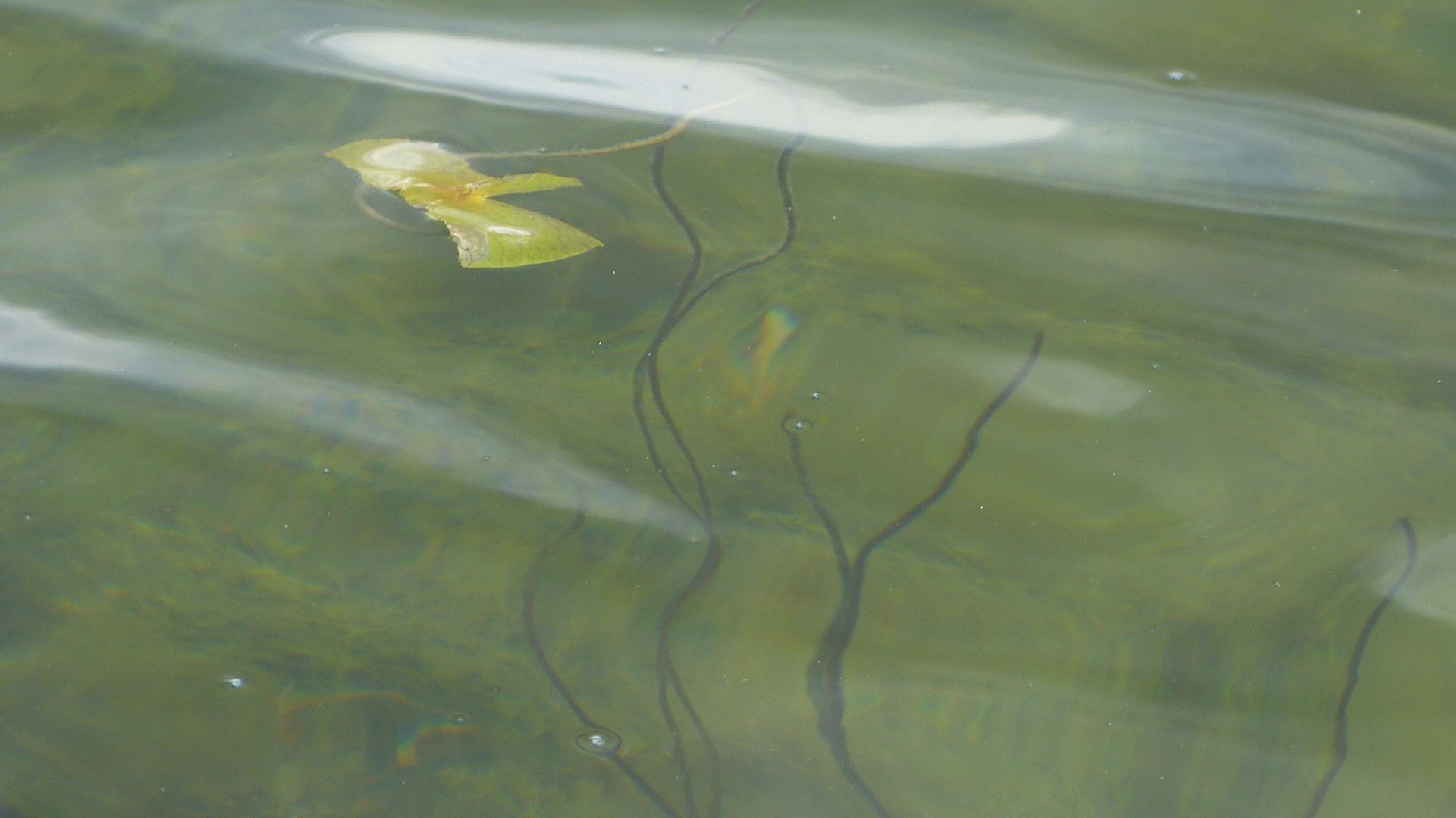 An dieser Stelle sah ich die runden Blätter der Wasserpflanze zwischen den Ästen nahe des Ufers