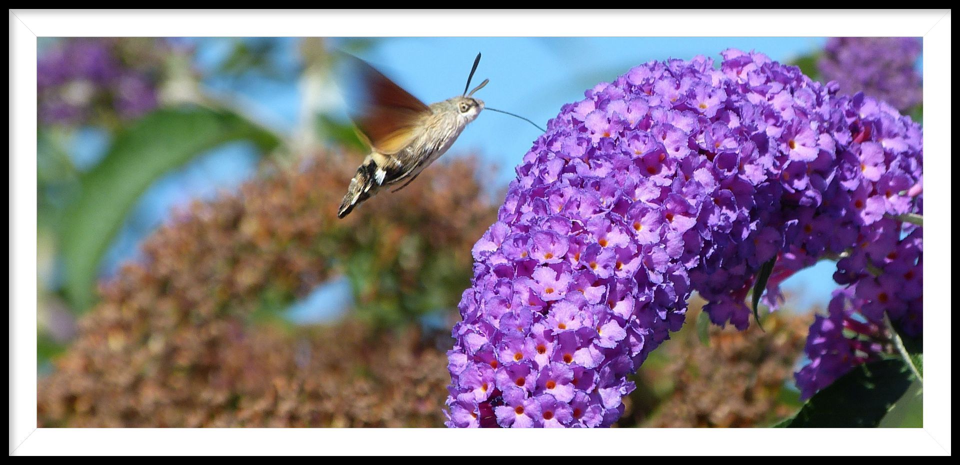Taubenschwänzchen nektartrinkend am Schmetterlingsflieder. Ursprünglich stammt der Schmetterlingsflieder aus China und kam als Zierpflanze in Europas Gärten. Auch in freier Natur hat sich der Neophyt schnell etabliert und breitet sich immer mehr aus, denn er ist sehr vermehrungsfreudig. Deshalb ist der Schmetterlingsflieder, auch Sommerflieder genannt, umstritten. Es gab sehr viele und dann immer mehr der Schmetterlingsfliederbüsche an der Südseite des Sees.Und die Schmetterlinge umschwärmten ihn sehr gerne. Ich muss man nachschauen im Frühling ob sie noch dort sind. Denn das Seewasser ist stark gestiegen.