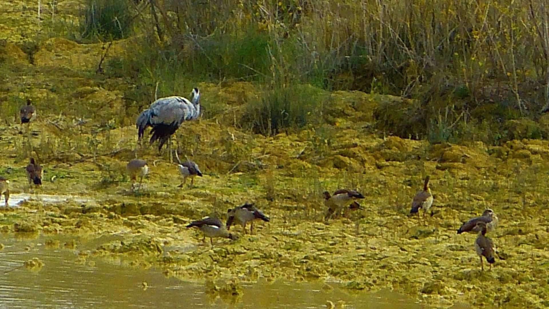 Als ich die Gänse und Enten von weitem fotografierte sah ich doch tatsächlich einen einzigen Kranich