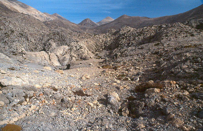 Hier befinden wir uns schon auf rund 2000 m, mitten in der "Hohen Wüste", wo wir unseren Aufstieg zum Pachnes, mit 2453 m der höchste Gipfel des Lefka-Ori-Massivs beginnen.