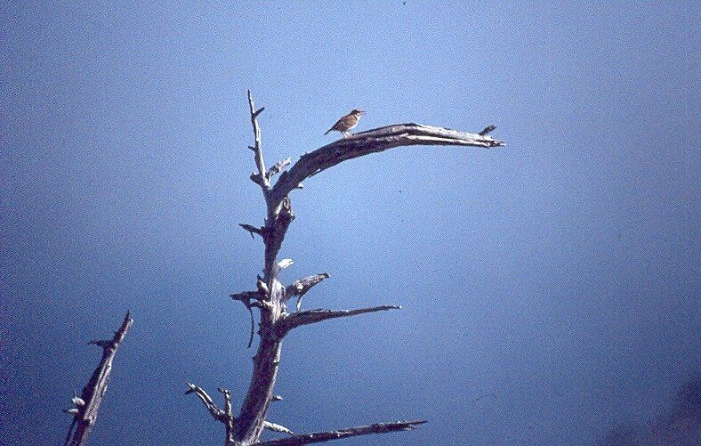 Hier oben auf diesen knorrigen Baumstümpfen und Bäumen saß ganz oft eine Lerchen Sorte die ihren sehr schönen melodischen Gesang über die weite Berg Landschaft schallen ließ. Es war die Kalander Lerche.