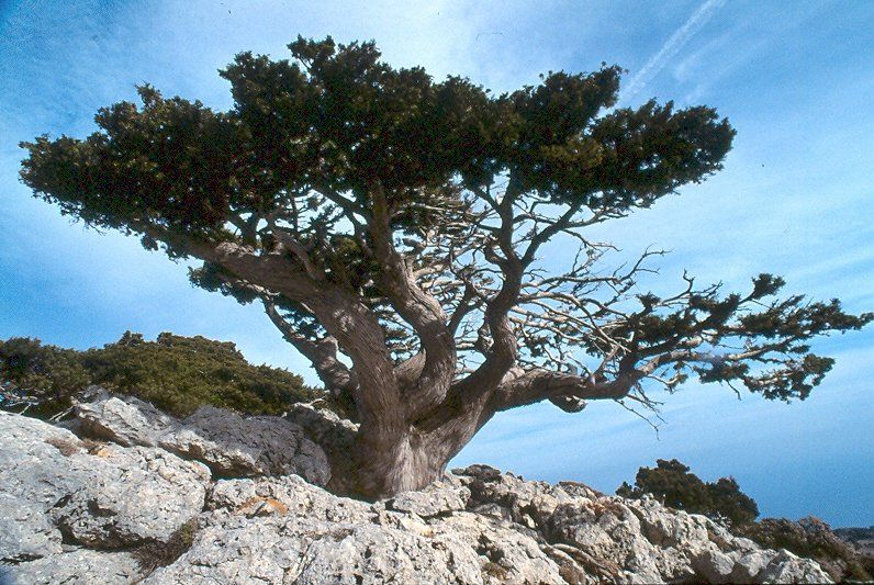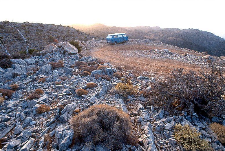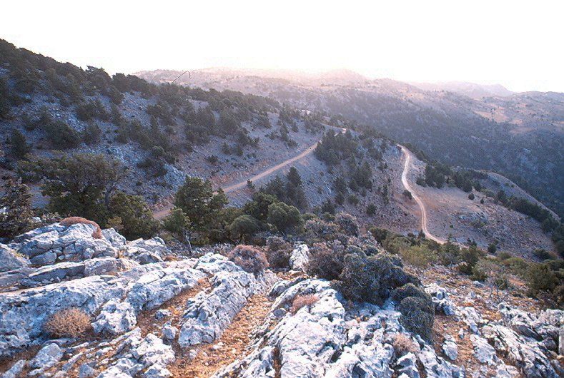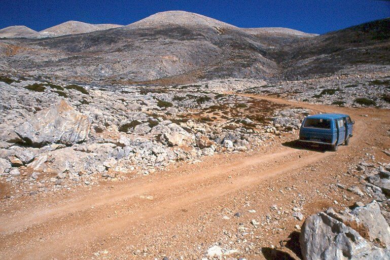 Mit dem Geländefahrzeug starten wir vom Dorf Anopoli aus über eine unbefestigte Straße, die uns über 20 km durch Wälder aus Pinien, Steineichen und alten Zypressen bis zur Baumgrenze bringt. Hier beginnt die "Hohe Wüste", wo uns das Fahrzeug absetzen wird, auf einer Höhe von 1950 Metern.