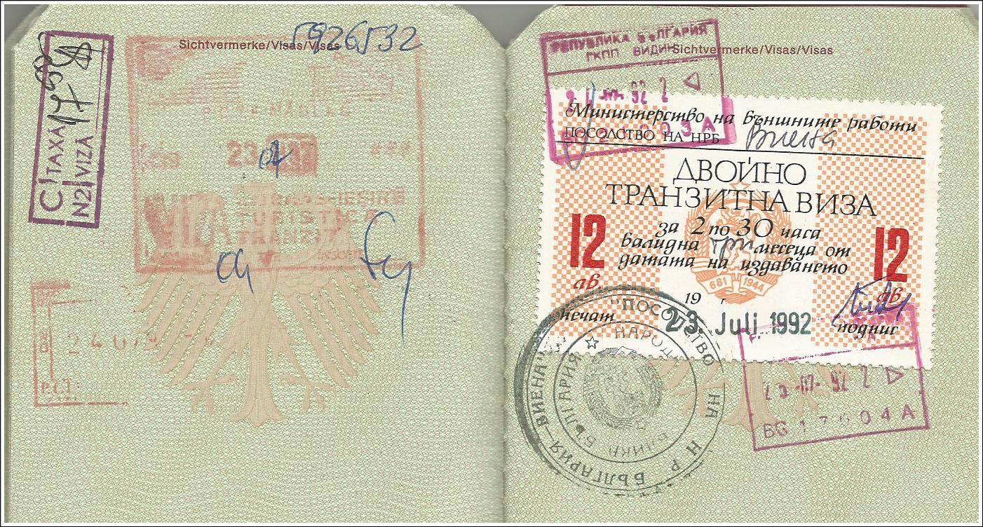 Die Grenze zwischen der Republik Bulgarien und der Republik Rumänien ist eine 605 km lange Land- und Gewässergrenze in Europa. Ich habe vergessen welche Grenz Fähre ich damals nahm. Es war nur eine schmale Donaustelle damals. Als ich da zur Grenze kam standen schon viele Autos bis in die kleine Ortschaft hinein und warteten auf die Fährenüberfahrt. Ich ging weit runter bis zum Fluss dort wo ein klappriges altes Gebäude damals stand und redeten mit den schlunzigaussehenden rumänischen Zöllnern. Denen scheint alles gleichgültig zu sein und sogar noch weniger als das. Sie nahmen von jedem Fahrer der über die Donau Rumänien verlassen wollte den Pass ab und sagten dann du musst warten bis du drann bist. Dieses warten ging bis zum nächsten Morgen. Nachts wurden Schafherden an uns wartende vorbeigetrieben. Es bewegte sich aber kaum etwas. Als ich dann morgens nochmals zu den Zöllnern ging machten sie ein auf ich weiß von nichts und noch weniger als das ist auch möglich. In Bulgarien sei die Korruption „einfach schrecklich“, sagt ein Lkw-Fahrer im Zollschuppen der bald zusammenbrechen würde. „Jeder hält die Hand auf.“ Aber auch bei der Ankunft in Rumänien werden die Passagiere legal zur Kasse gebeten. So wie ich es jetzt erfahren würde. Ich erzählte ihm dass ich meinen Reisepass zurückhaben will. Er machte ein auf ja warum sagst du das nicht gleich und wo willst du hin fragte er dann verschmitzt ein wenig nach Knoblauch und Zigarren stinkend. Bulgarien sagte ich. Da musst du warten das siehst du doch meinte er unrasiert und fett. Er deutet an das es aber viel schneller gehen würde. Ich gab ihm 50 Mark. Er lächelte und sagte: Warum nicht gleich so, hohl dein Auto. Und einige Minuten später war ich auf der klapprigen Fähre die sowas von vollgestopft war das dort ein alter Esel keinen Tritt mehr machen könnte. Aber die anderen Autofahrer die sich nicht darum kümmerten ihre Papiere abzuholen und die Prämie zu zahlen, die warten wohl noch immer dort an dieser vergessenen Donau Überquerung.