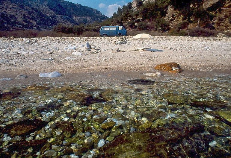 An einem der schönen Waldparkplätze sah ich dann diese entspannte Situation. Menschen hatten Melonen ins kalte Quellwasser gelegt um sie dann später gekühlt dort zu vernaschen. Ja, Ich war in Griechenland angekommen. Entspanntheit. Ich war als ich noch in West-Berlin wohnte mehrmals auf griechischen Inseln gewesen, auch länger, auf Paros, oder Mykonos, oder auf der Katzen Insel Hydra. Aber nun hier diese Waldlandschaft wunderbare Luft, genau das richtige nach dieser Rüberfahrt nach Wien und dann durch das rasende Rumänien und Bulgarien, aber nun hier. Genau das was ich brauchte Erholung. Erholung von Menschen und ihren Machenschaften. Meditation. Ja. Meditation. Aber diese Wald Umgebung das war schon einatmen der Meditation denn Bäume, sie sind immer in Meditation, sie sind immer sehr still sehr gefasst sehr meditativ ruhig, genau das was ich brauchte.