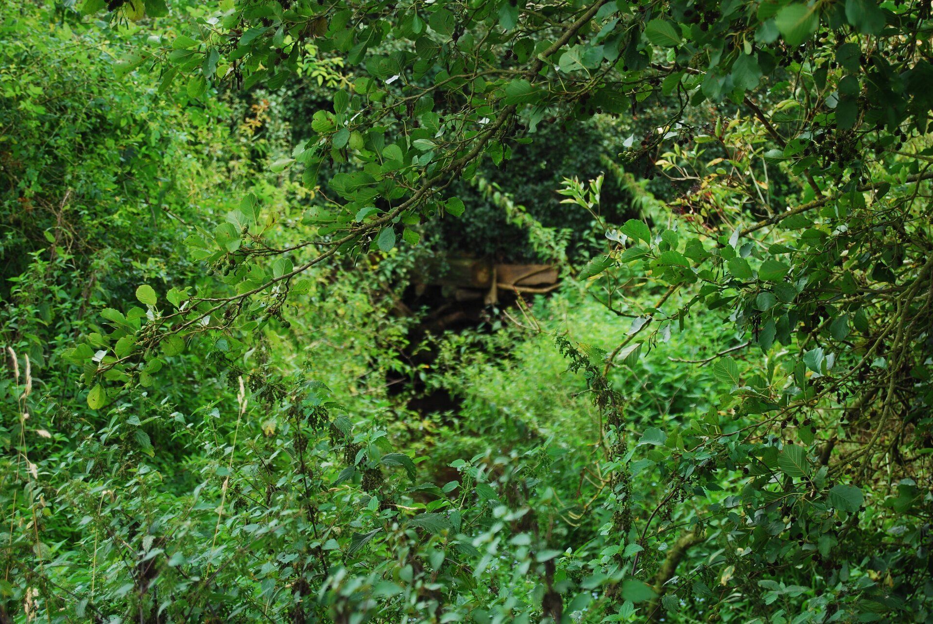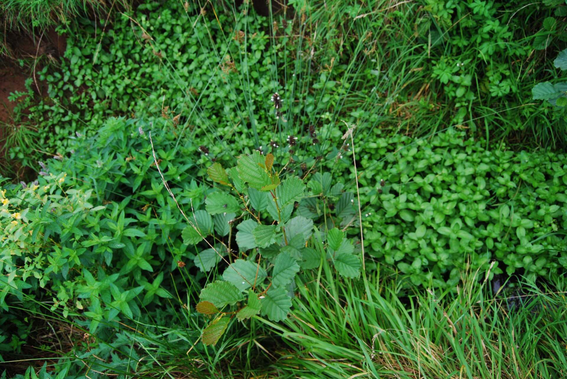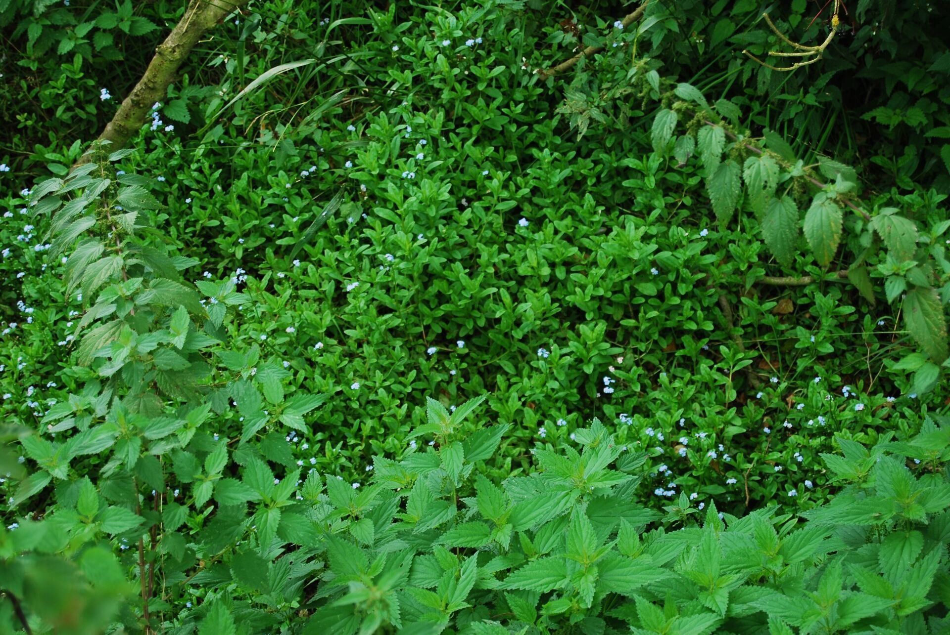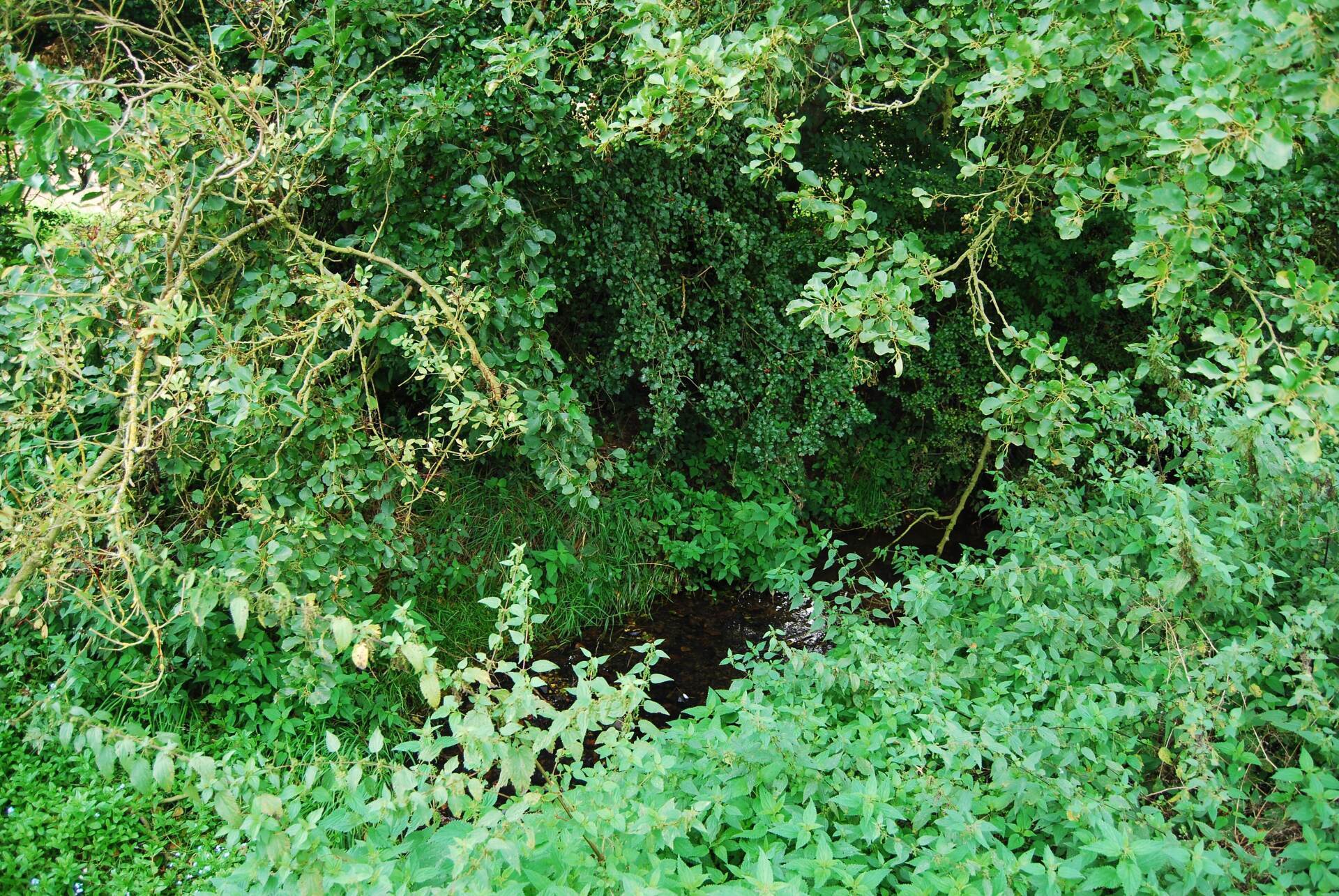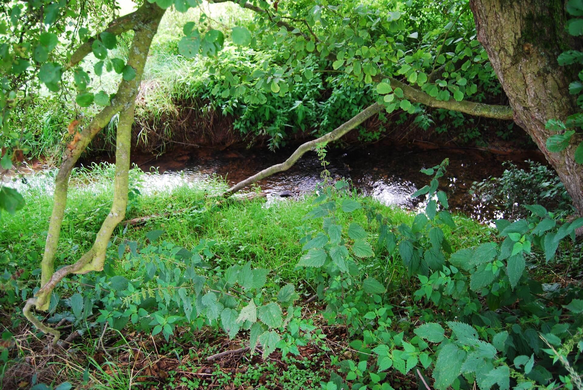 Hohe Brennesseln.Indisches Springkraut das von den Hummeln geliebt wird. Buchen.Birken.Apfelbäume.Kirschen.Viele Holunderbüsche.Ab und an eine Fichte.Schwarze Erle.