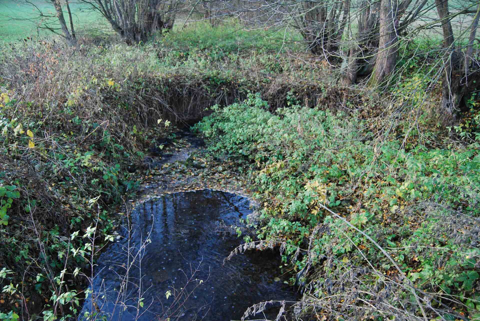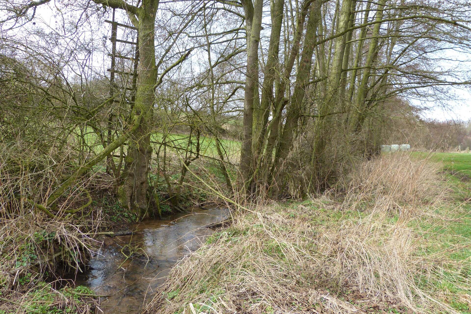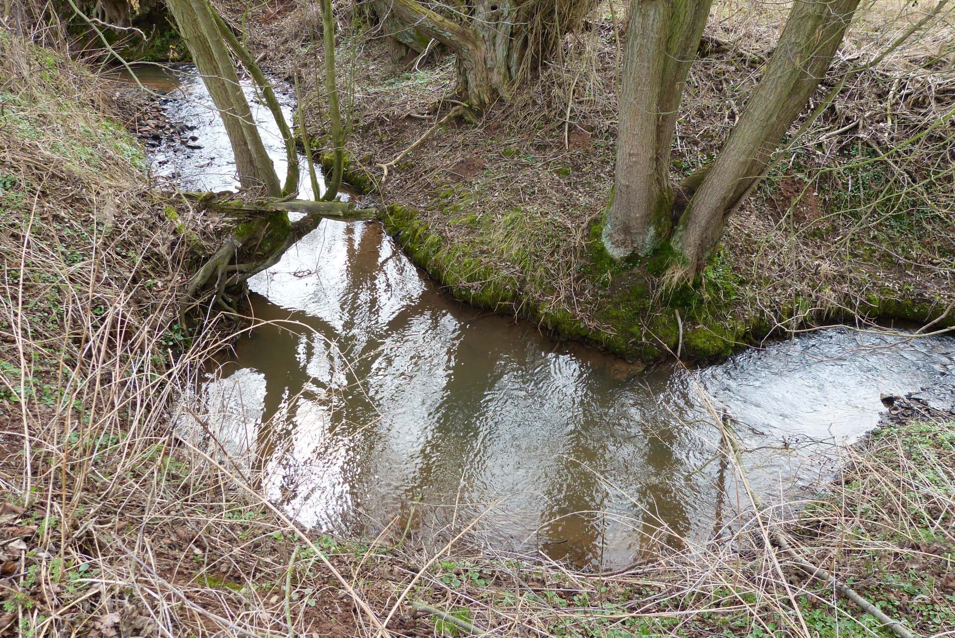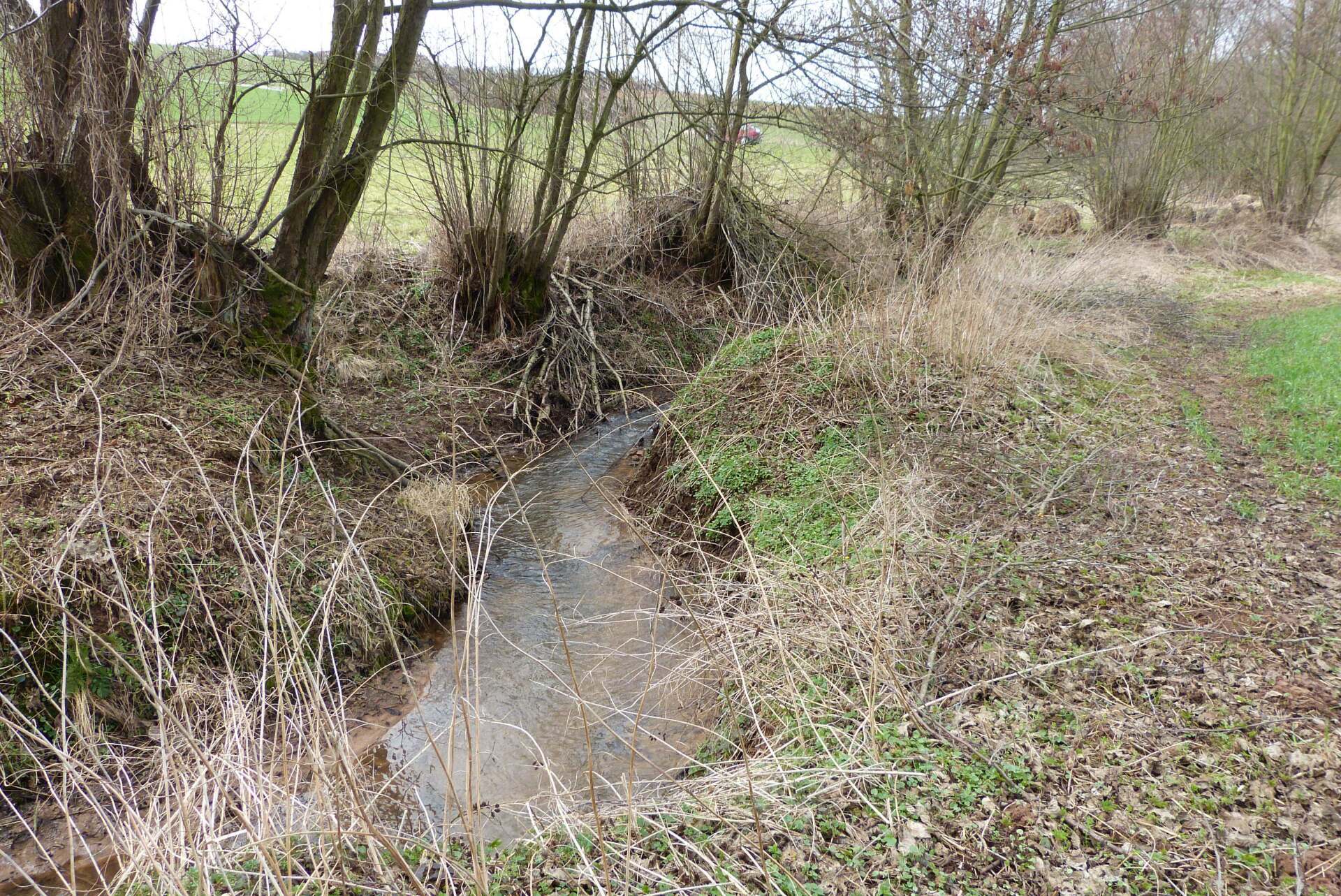 Der Lohrbach ist außerhalb des Waldes von Chemiefeldern umgeben.